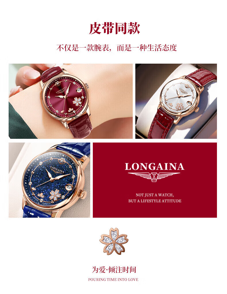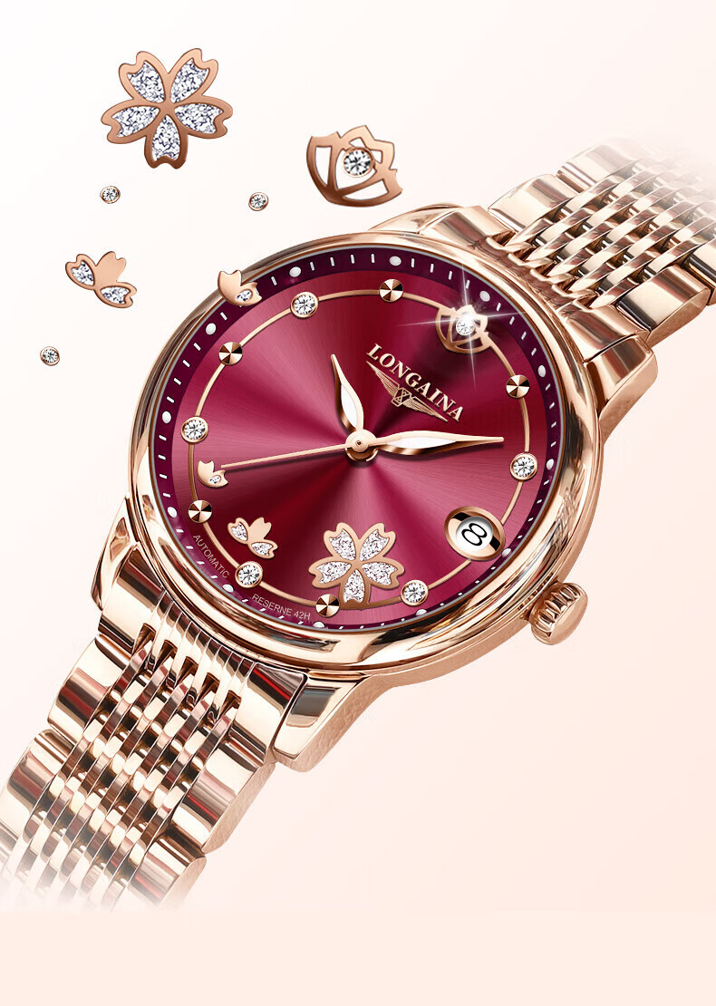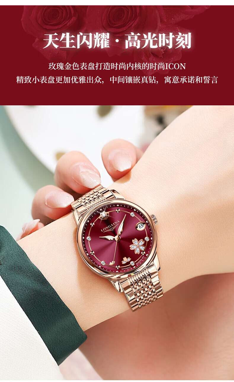 LONGAINA瑞士认证手表女士机械表防水夜光2024新款轻奢名牌女表 钢带款L6169酒红色+带证书