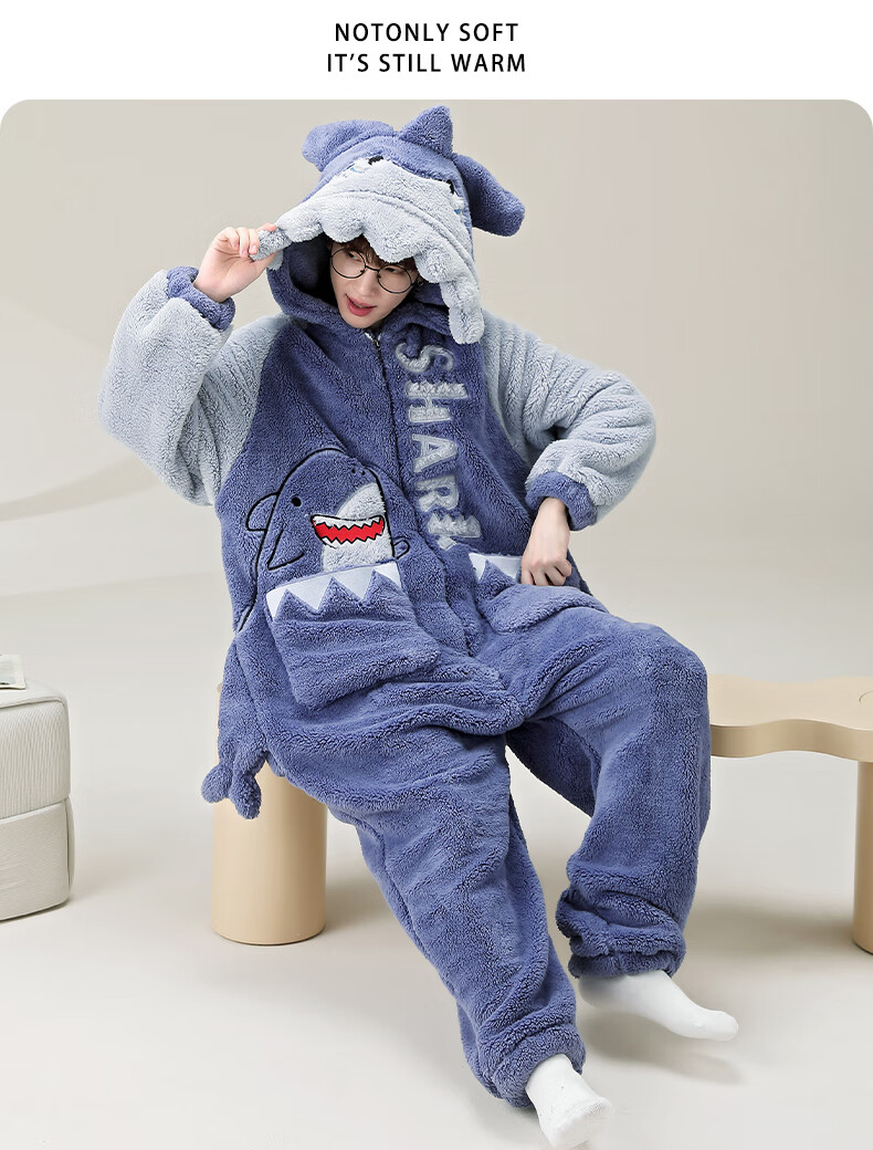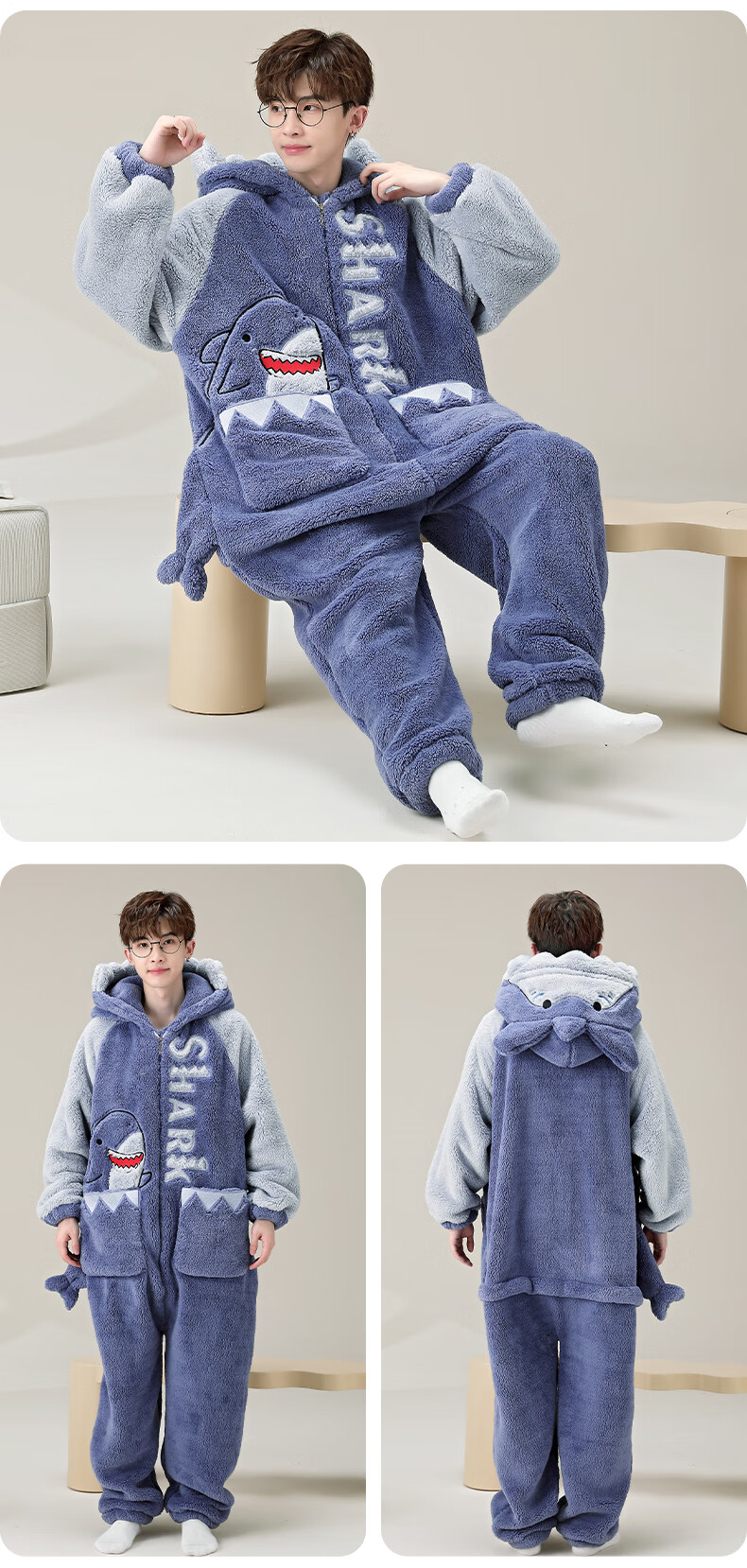 盛束鲨鱼男士秋冬款大码连体睡衣2024款青少年长毛绒加厚珊瑚绒家居服 YPF连体绒3892蓝鲨鱼 M码【160cm/95斤】