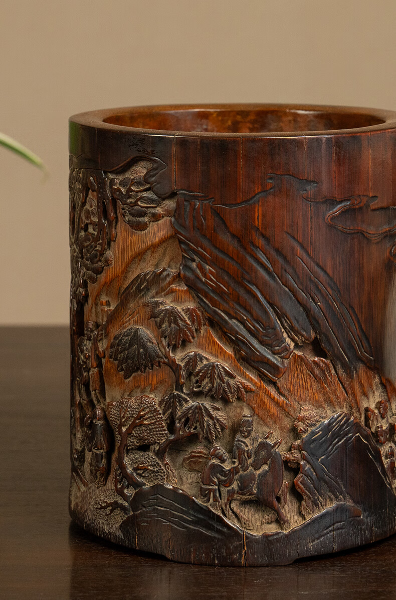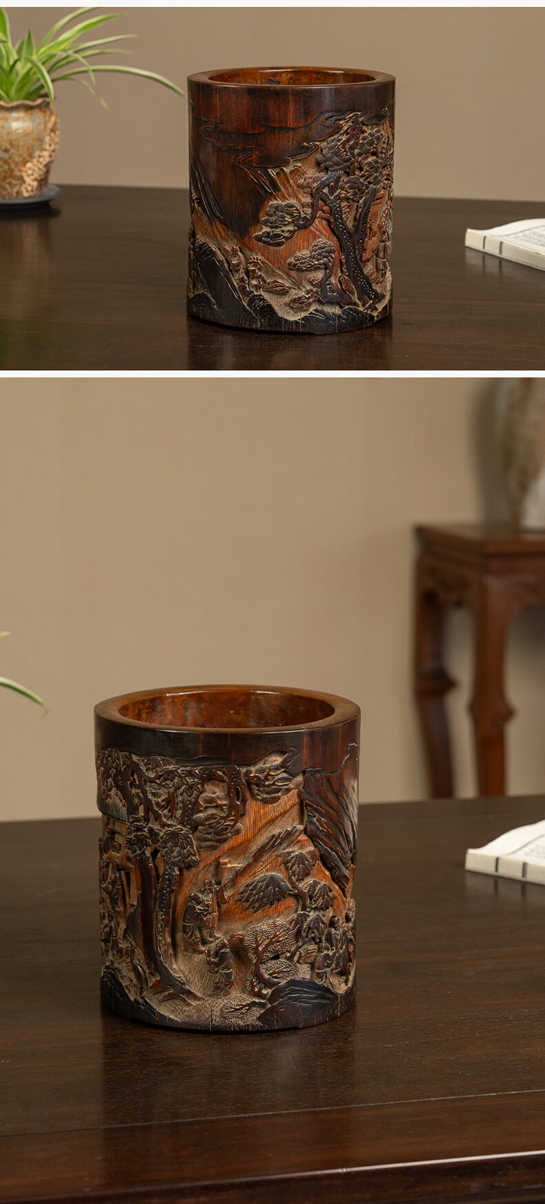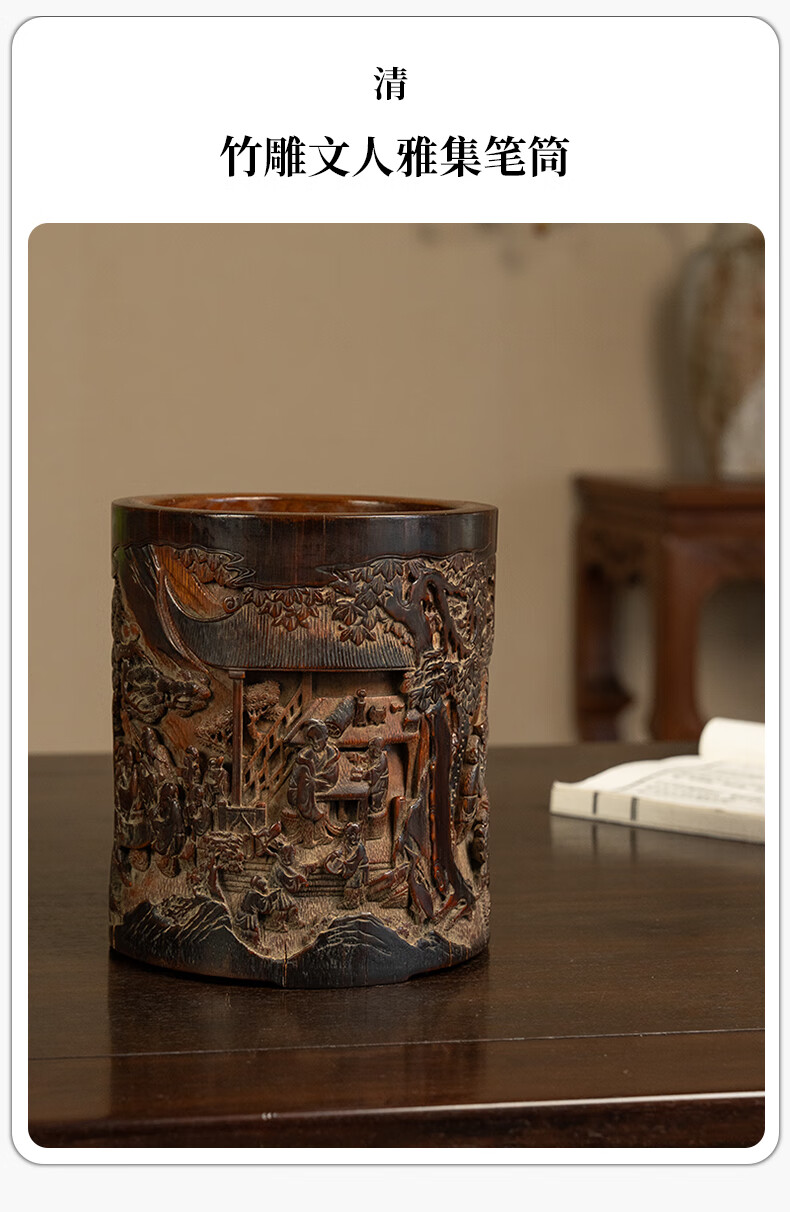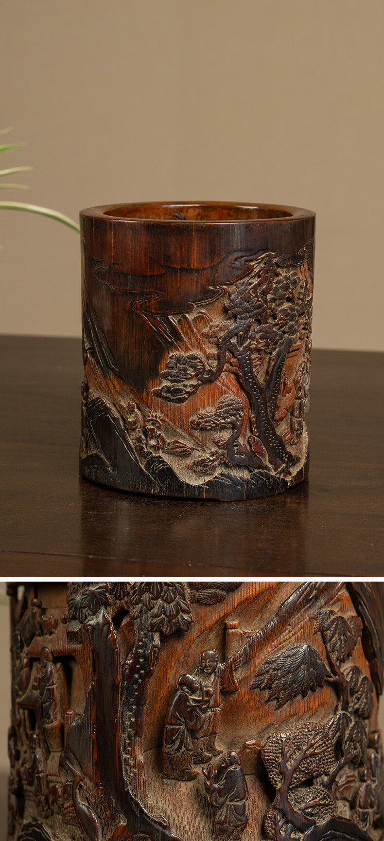 YARAN CULTURE清代竹雕文人雅集笔筒老物件古玩收藏真品竹制艺术品中式装饰摆件 14.3×14.7×16.6 1098-68