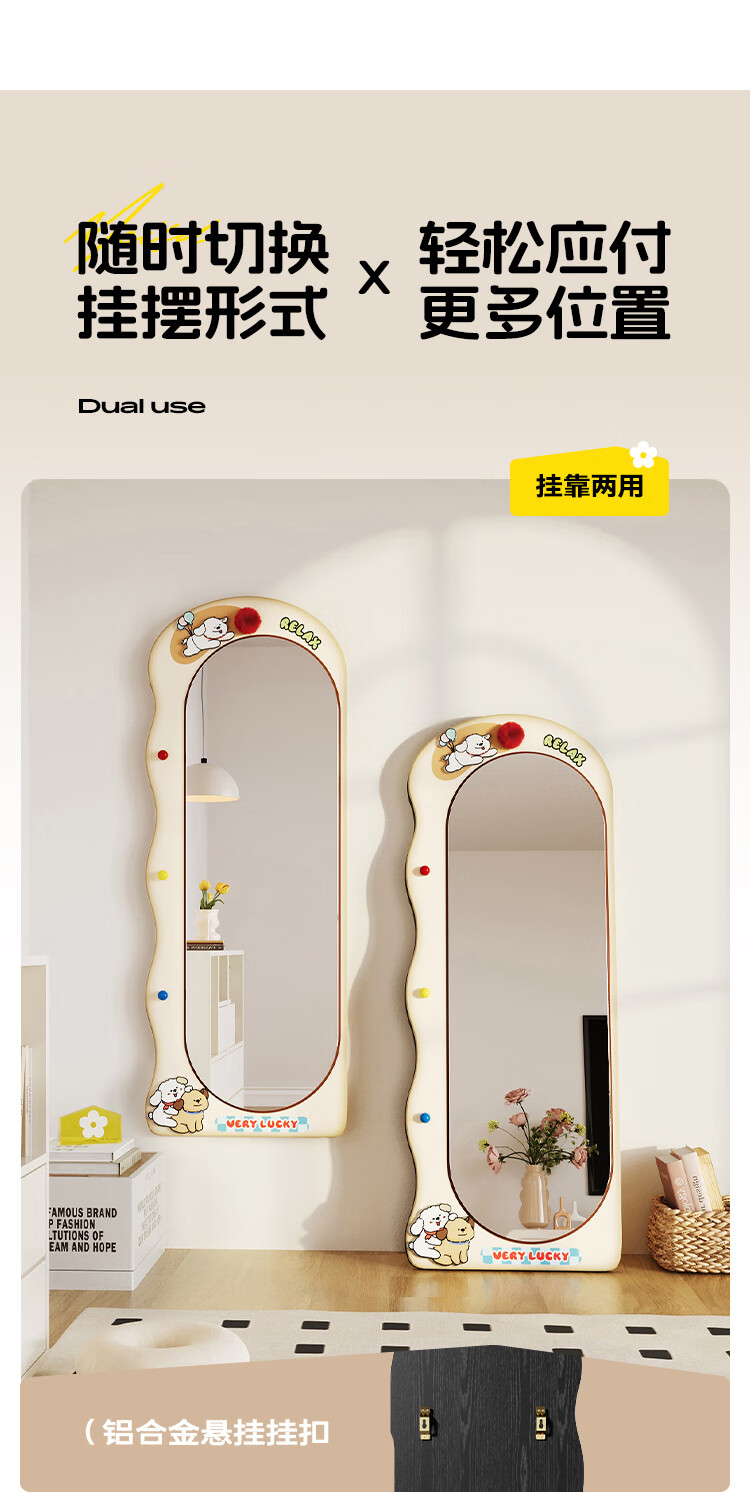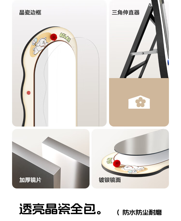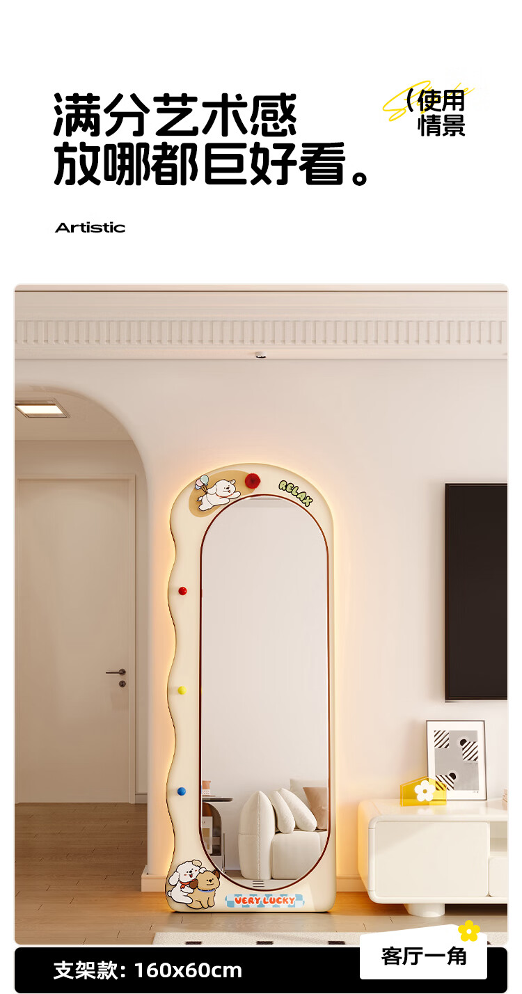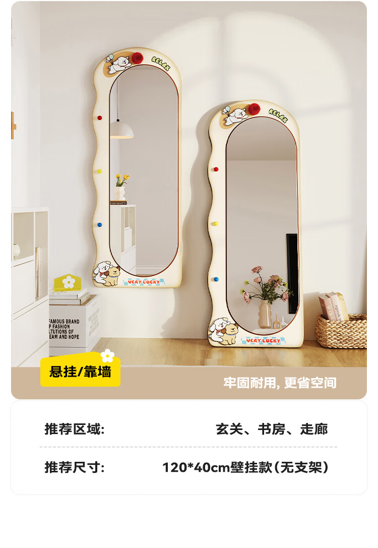 美世达镜子全身镜家用挂墙穿衣镜奶油风卧室装饰ins风落地试衣镜 支架/靠墙款160X60CM