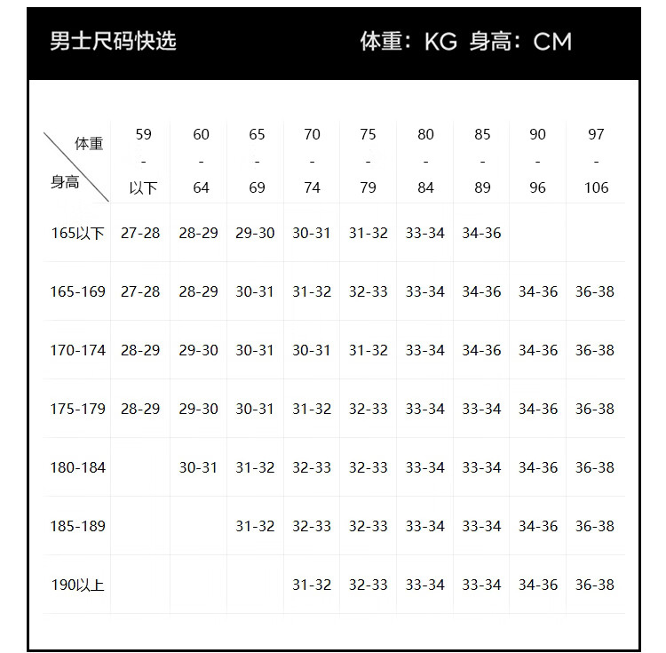 USA(inch) 28-30 30-32 32-34 34-38 38-42