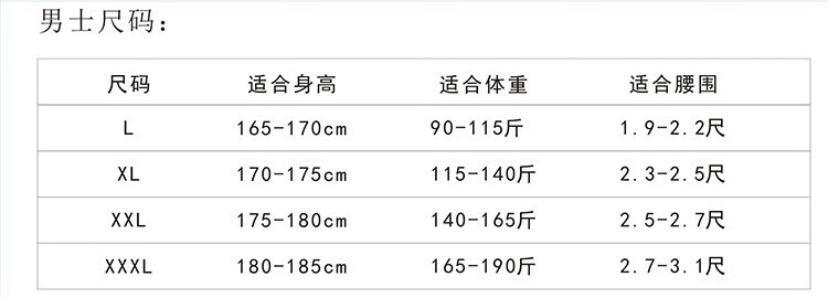 China (cm) 165 / 88-90 170 / 96-98 175 / 108-110 180 / 118-122 185 / 126-130