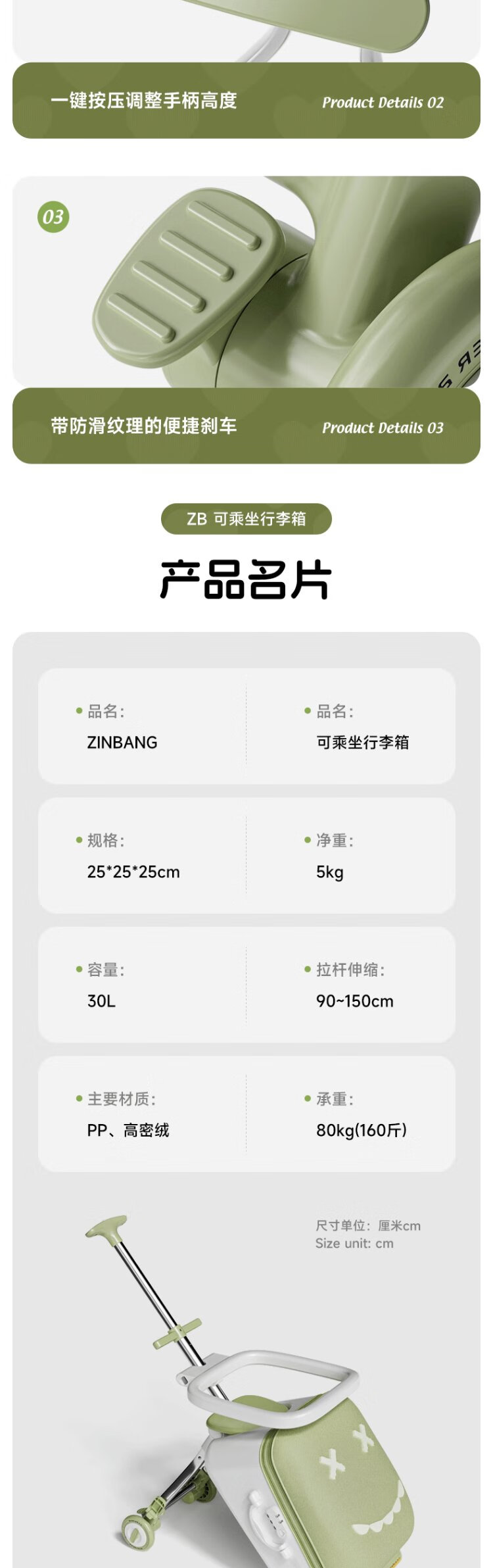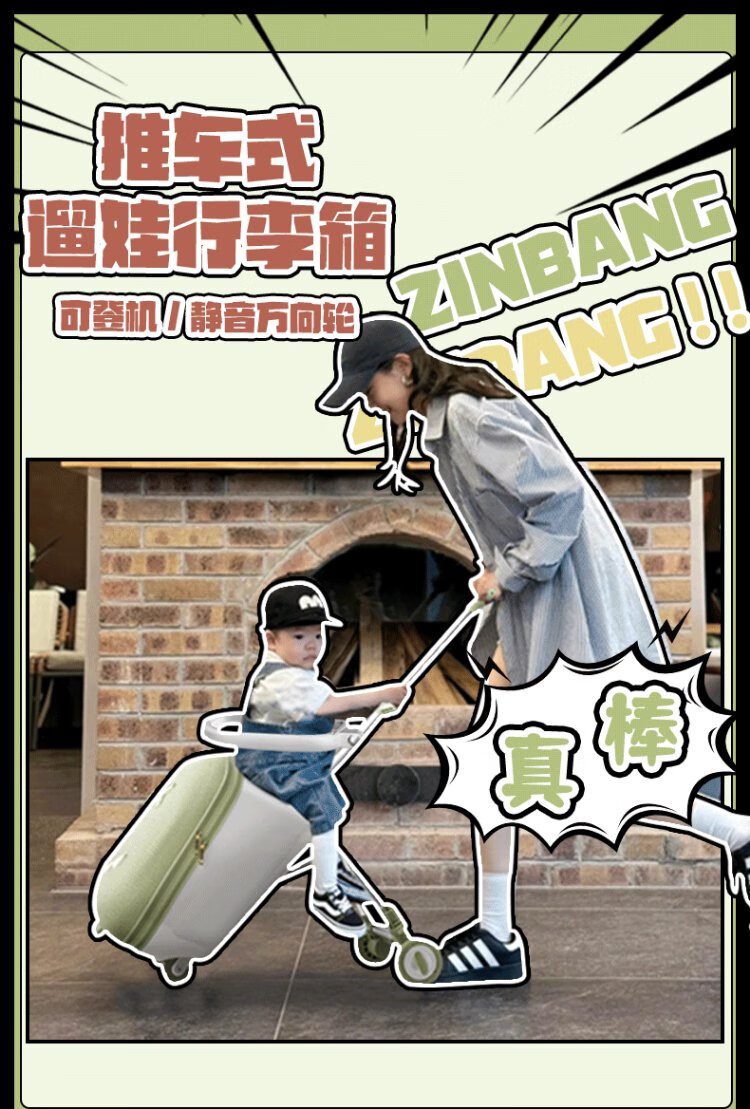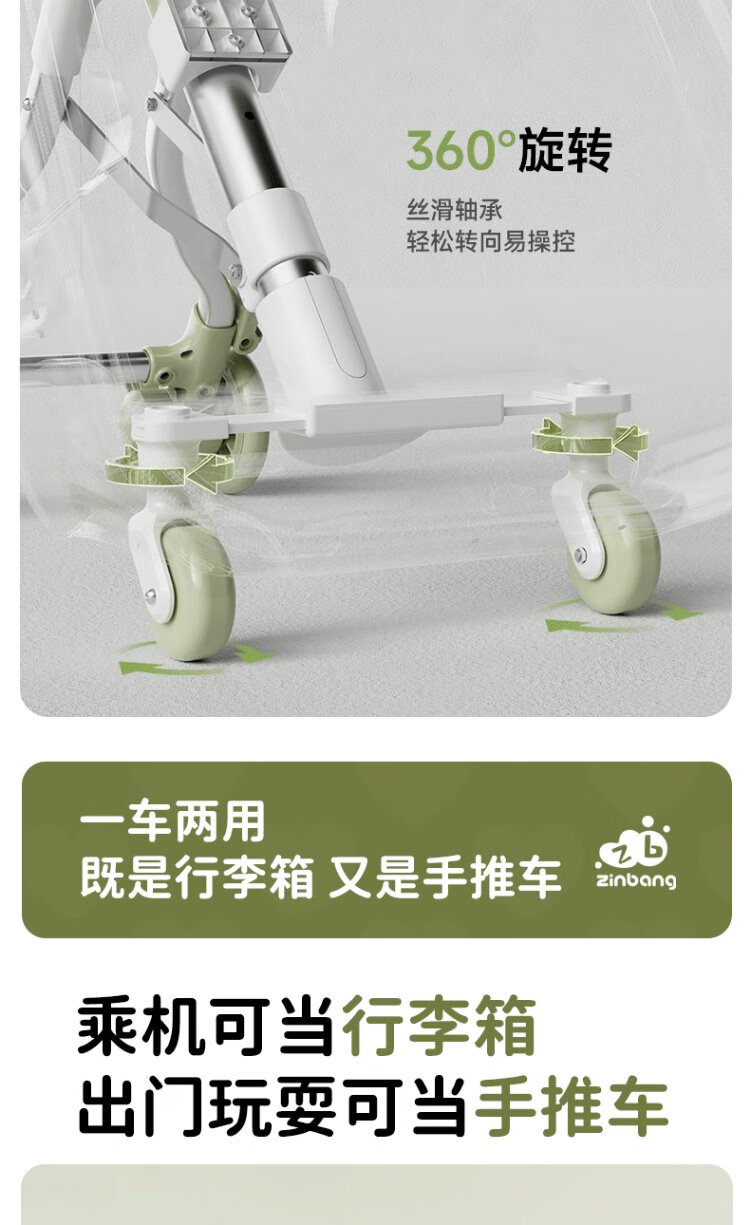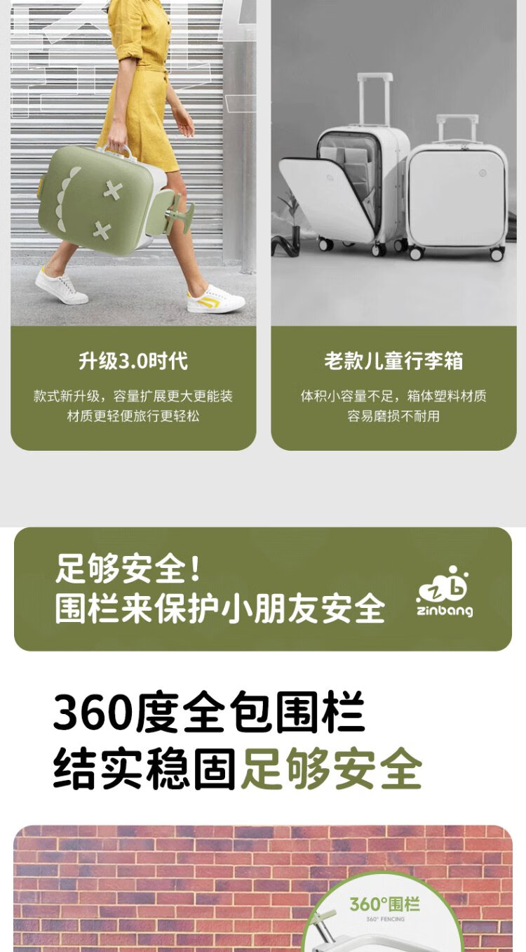 ZINB ANG遛娃儿童行李箱拉杆箱可坐可骑行可登机男女宝宝推车旅行箱 绿色【扩容款/39.8L】