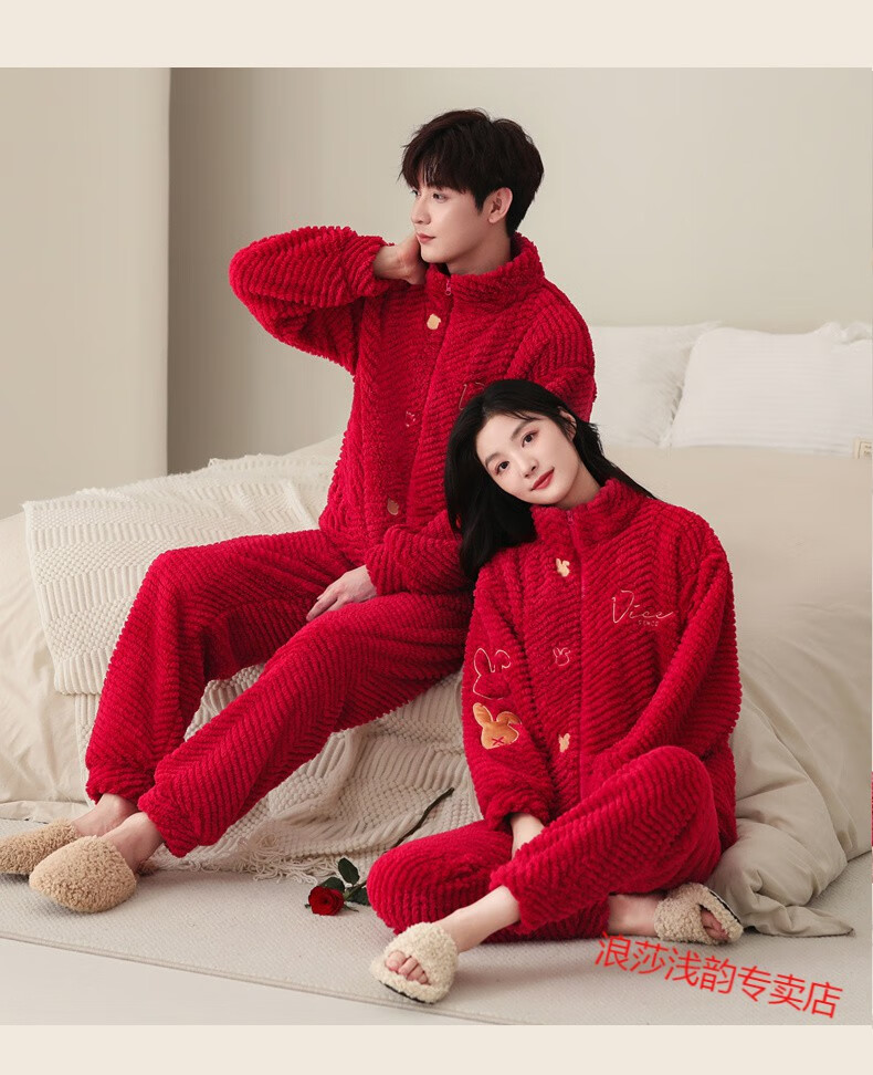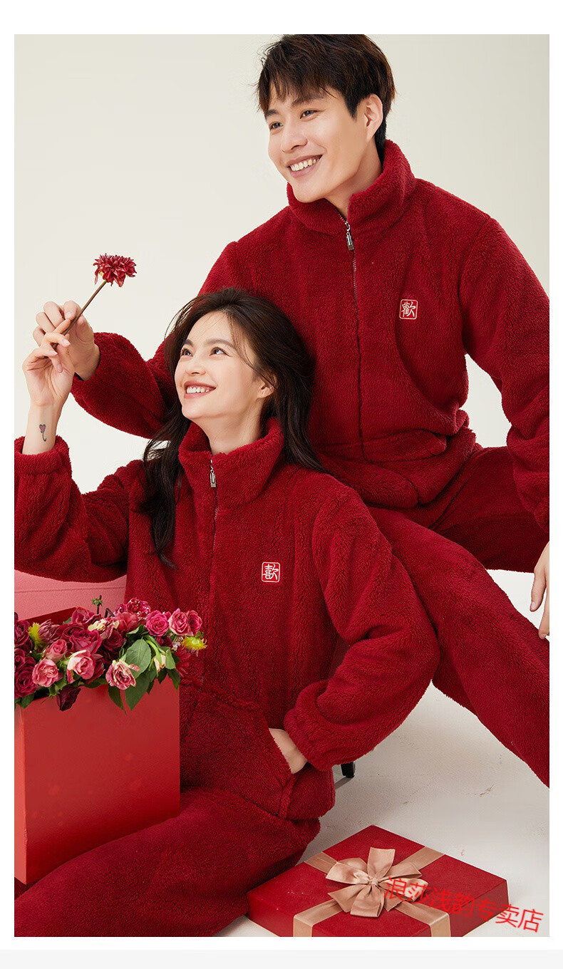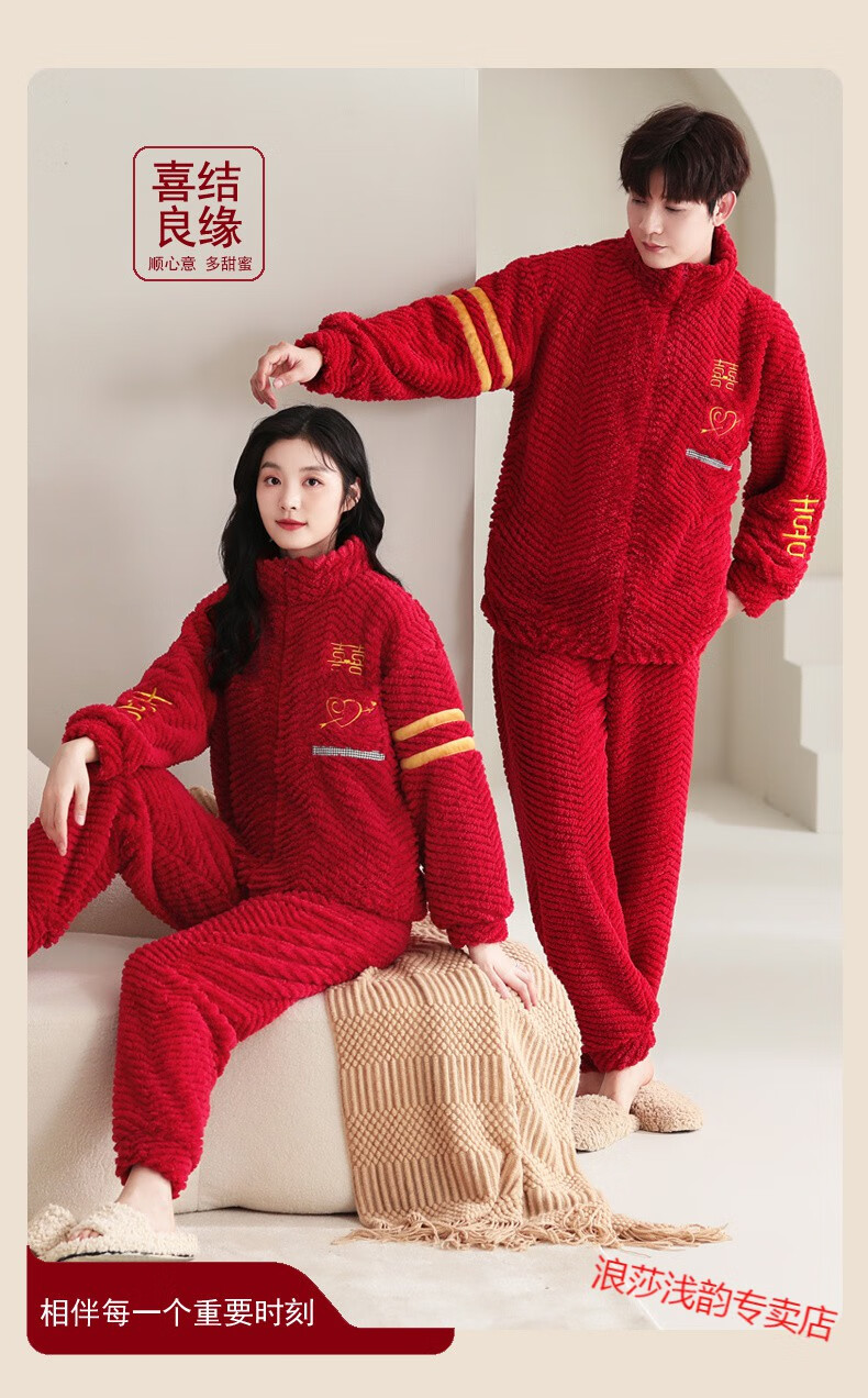 浪莎(LangSha)秋冬季结婚情侣睡衣红色珊瑚绒加厚加绒男女士新婚婚庆家居服套装 9716+图案+囍气洋洋 加 厚加绒 M 女款: 建议80-100斤