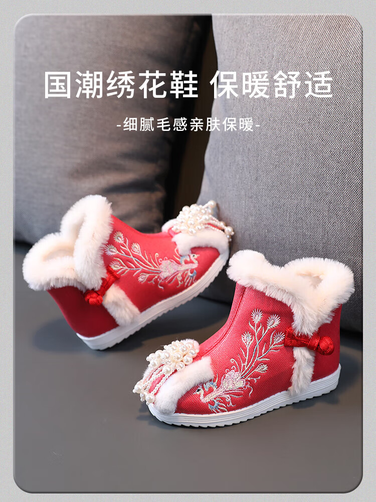 Ruiyang Winterschuhe, Kinder-Hanfu-Schuhe, Samt-Baumwollschuhe, bestickte Mädchenschuhe im Ethno-Stil, Neujahrsschuhe im antiken Stil, kurze Babystiefel, A5213 rosa, Größe 31/Innenlänge 19,0 cm