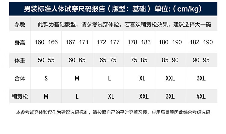 China (cm) 165 / 88-90 170 / 96-98 175 / 108-110 180 / 118-122 185 / 126-130
