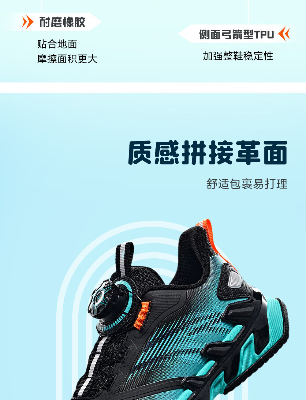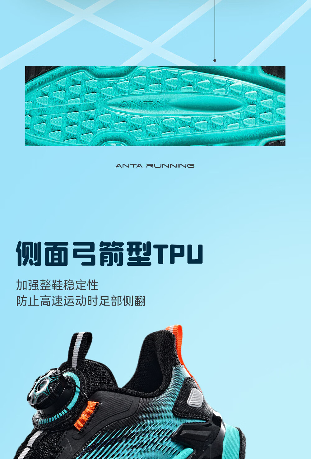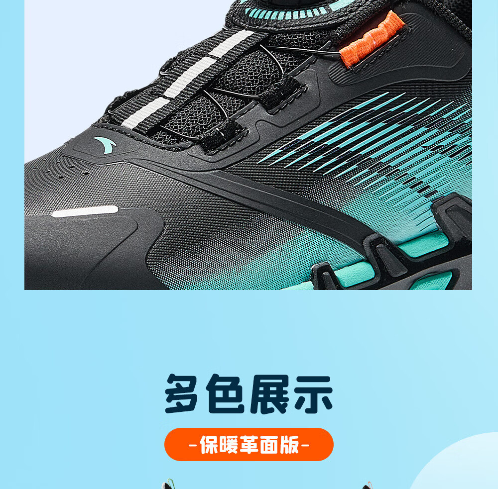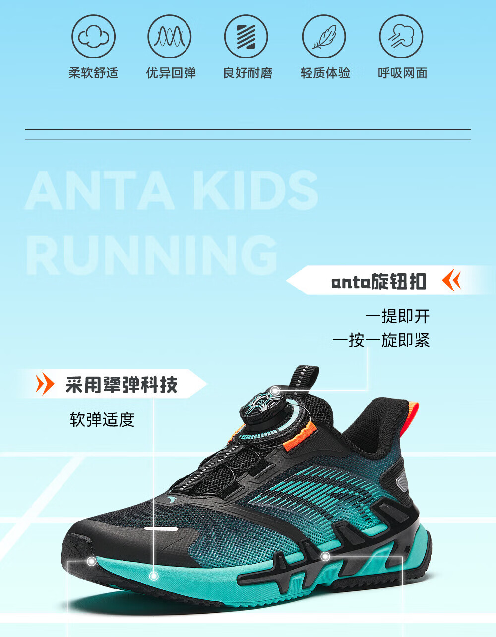 ANTA Children's Sports Shoes Men's Big Children's Shoes 2025 Spring New Leather Windproof Knob Button Cushioning Bow Speed ​​Running Shoes Black/Fluorescent Aqua-2 Size 33