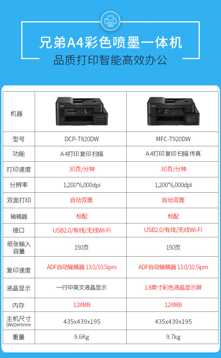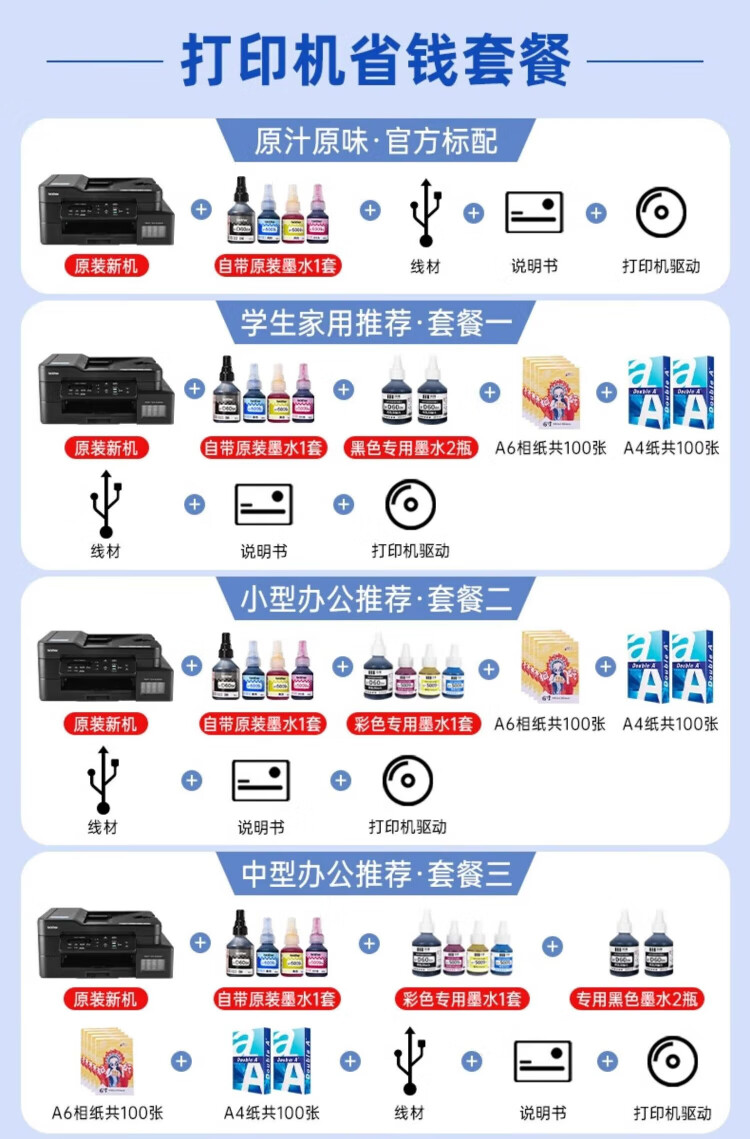 兄弟(brother)DCP-T820DW/MFC-T920DW/T930DW彩色喷墨照片连供墨仓无线双面打印复印扫描传真机办公商用多功能 DCP-T820DW升级款【发主图型号】 套餐二【官方标配+黑彩专用墨水4瓶】