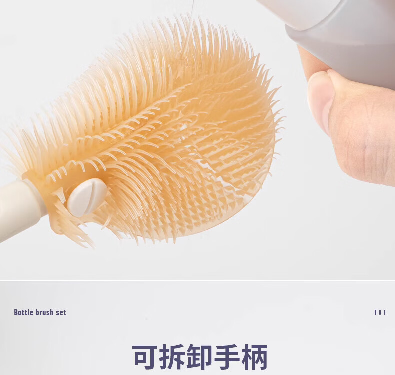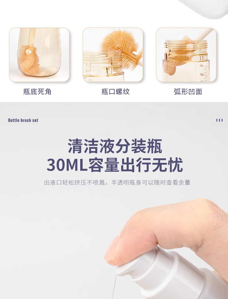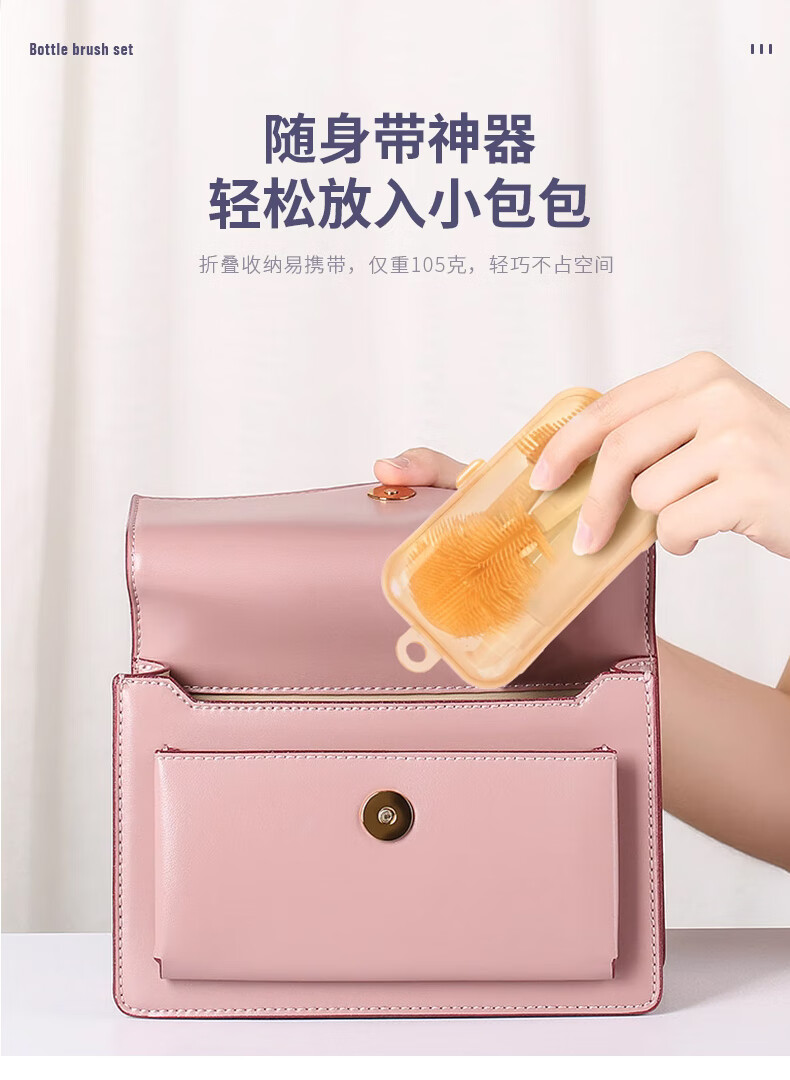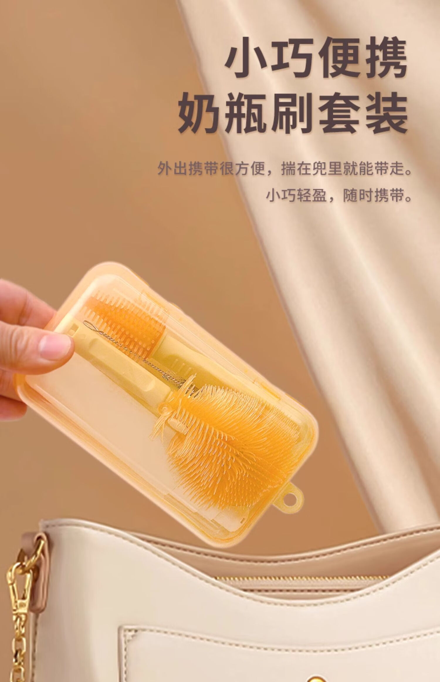 What's the special bottle cleaning brush? Newborn baby cleaning pacifier brush. Silicone portable bottle brush set. Portable bottle brush set.