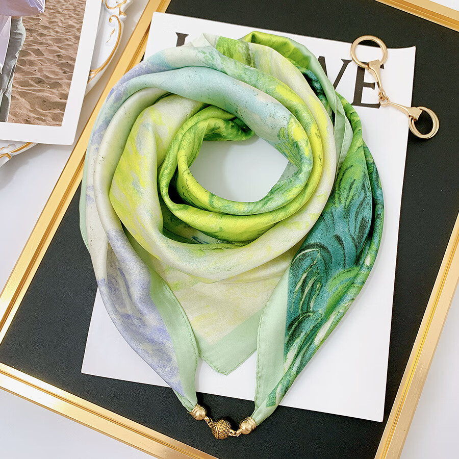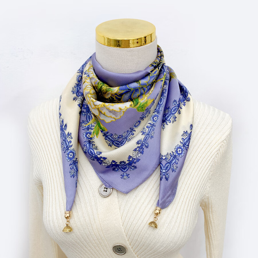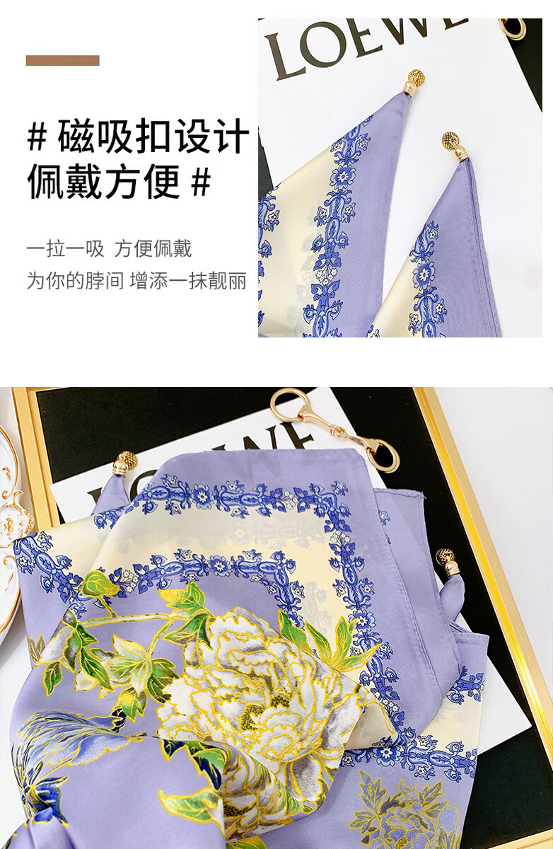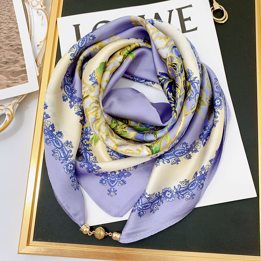 范诗奥新款百搭磁吸扣春秋方巾三角丝巾女领巾洋气围巾夏季时尚护颈围脖 清新蓝莲花