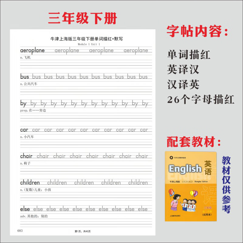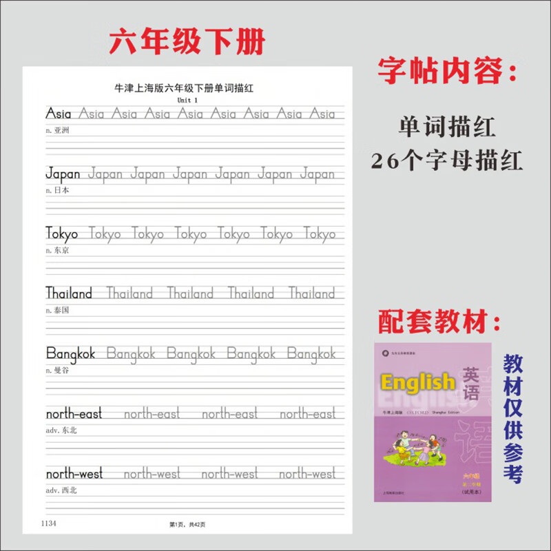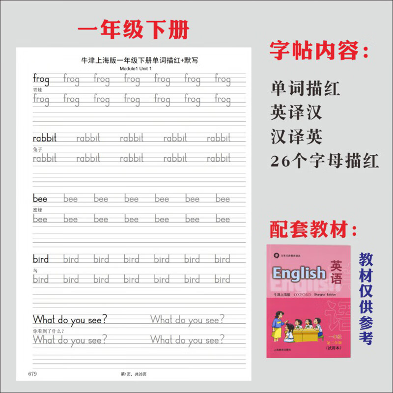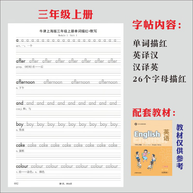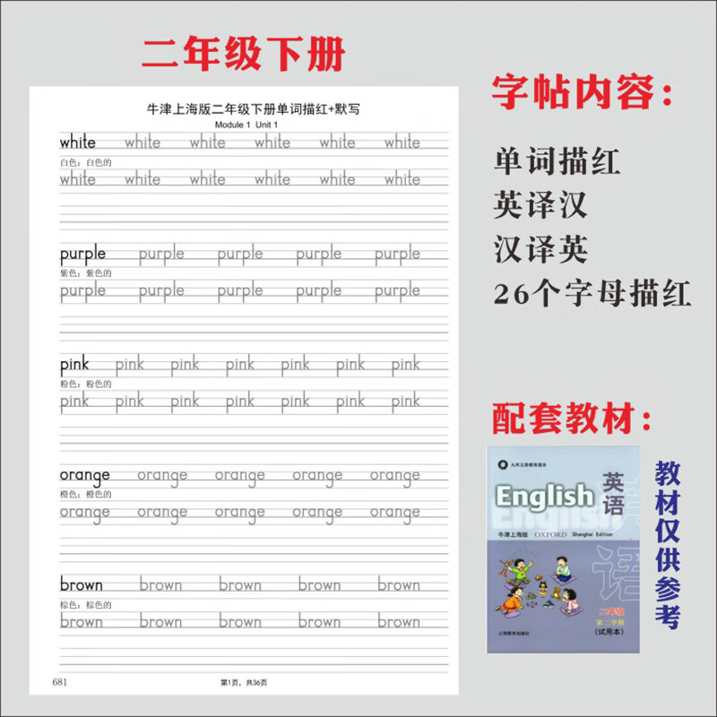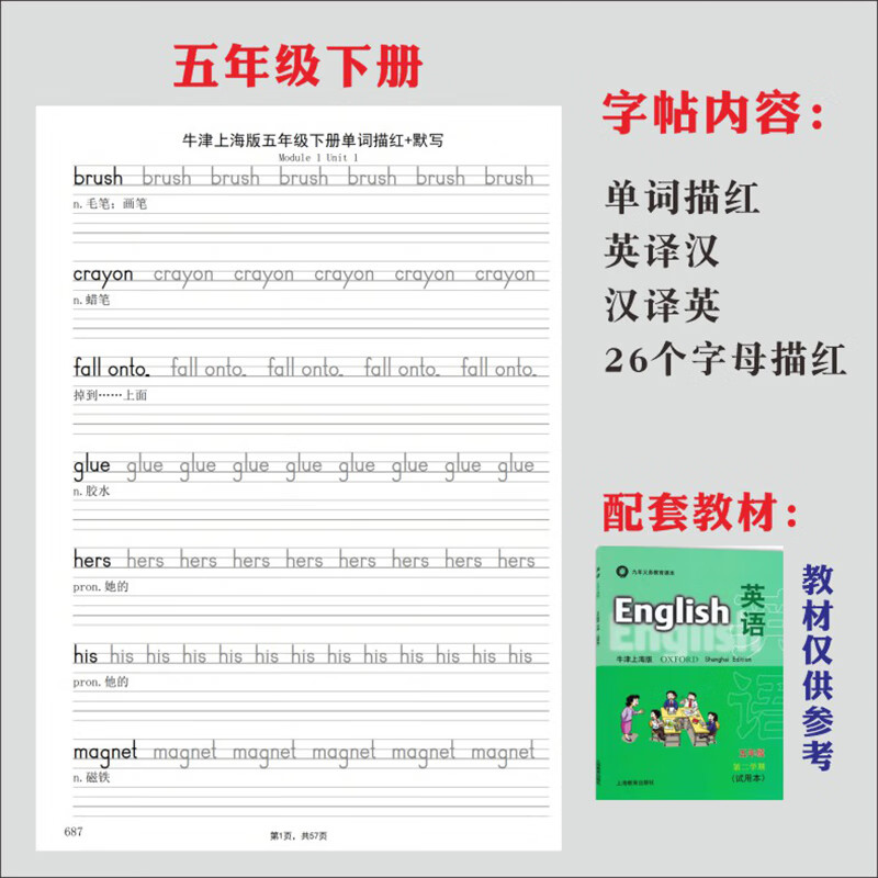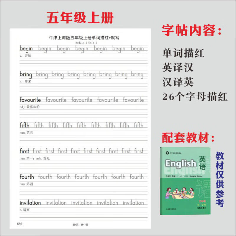 牛津上海版123456年级小学英语描红字帖默写上海木棍体练习作业本 686五上牛津上海单词描红47页