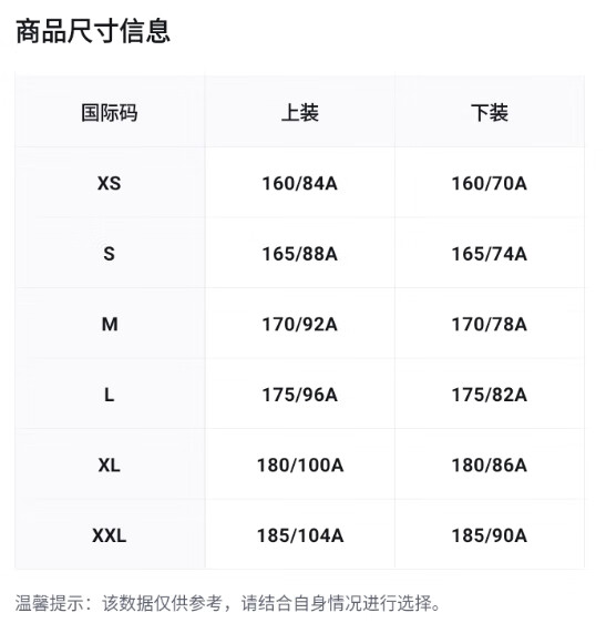 China (cm) 160-165/84-86 165-170 / 88-90 167-172 / 92-96 168-173 / 98-102 170-176 / 106-110