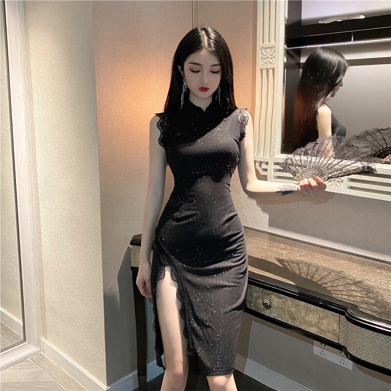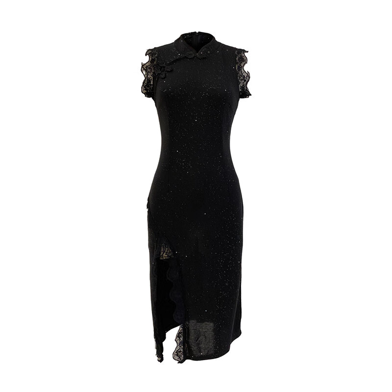 忆静萱(YIJINGXUAN)夜店2025夏季新款名媛复古蕾丝花边修身显瘦性感开叉改良旗袍连衣 魅力黑 M 95-105斤