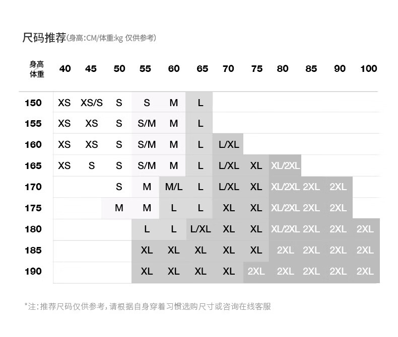 China (cm) 160-165/84-86 165-170 / 88-90 167-172 / 92-96 168-173 / 98-102 170-176 / 106-110