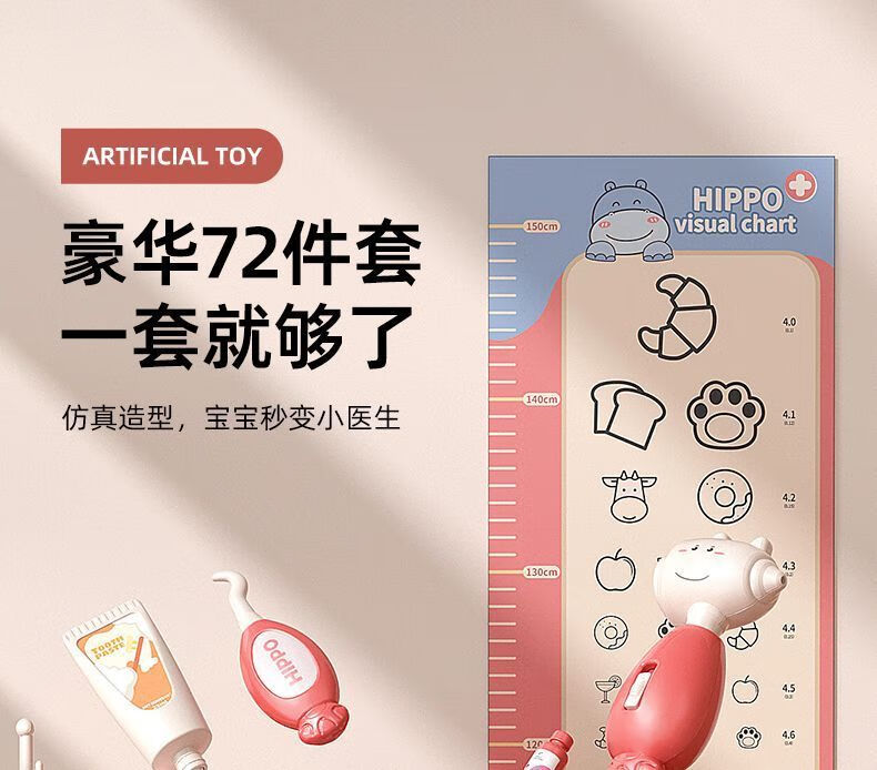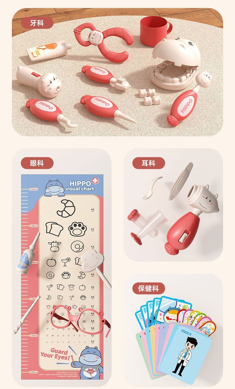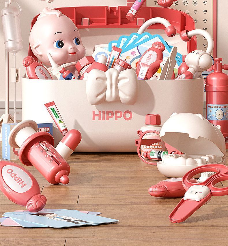 脘铼儿童扮演小医生玩具套装男女孩过家家打针箱看病宝宝礼物仿真 粉色河马【60件套】娃娃+床 标准配套