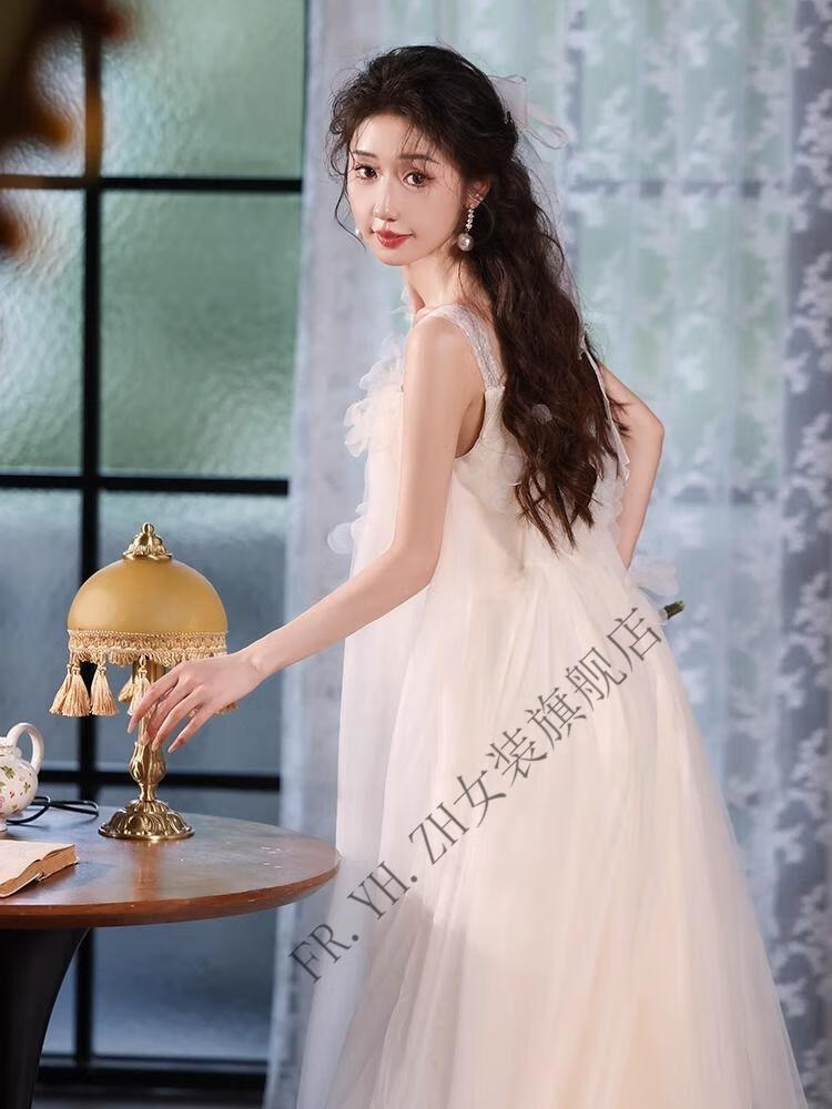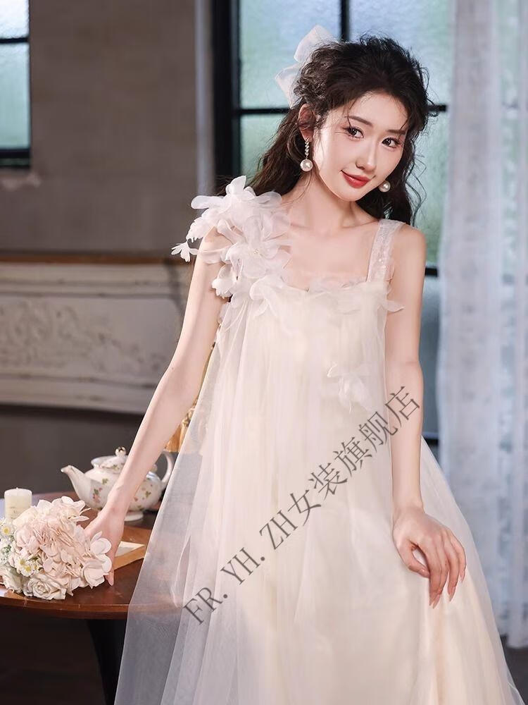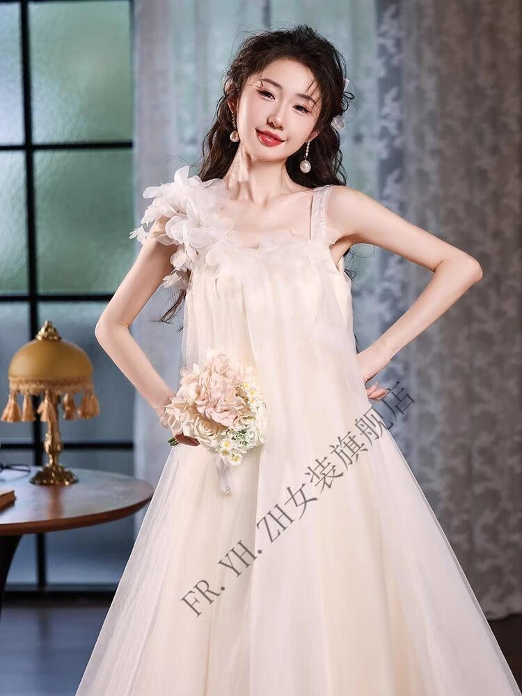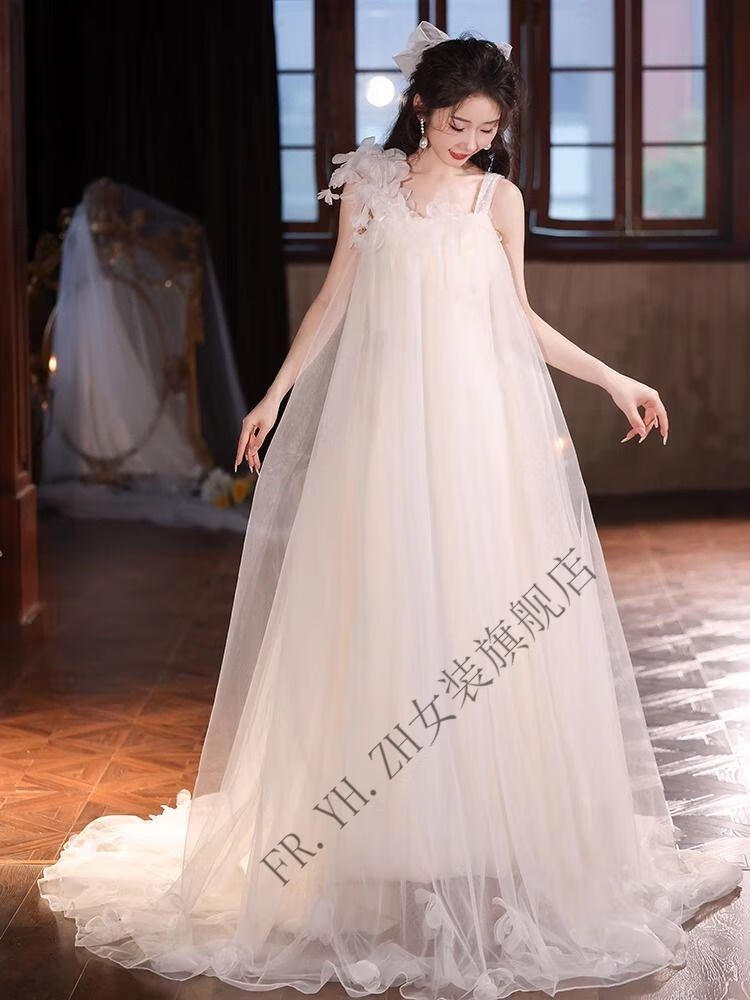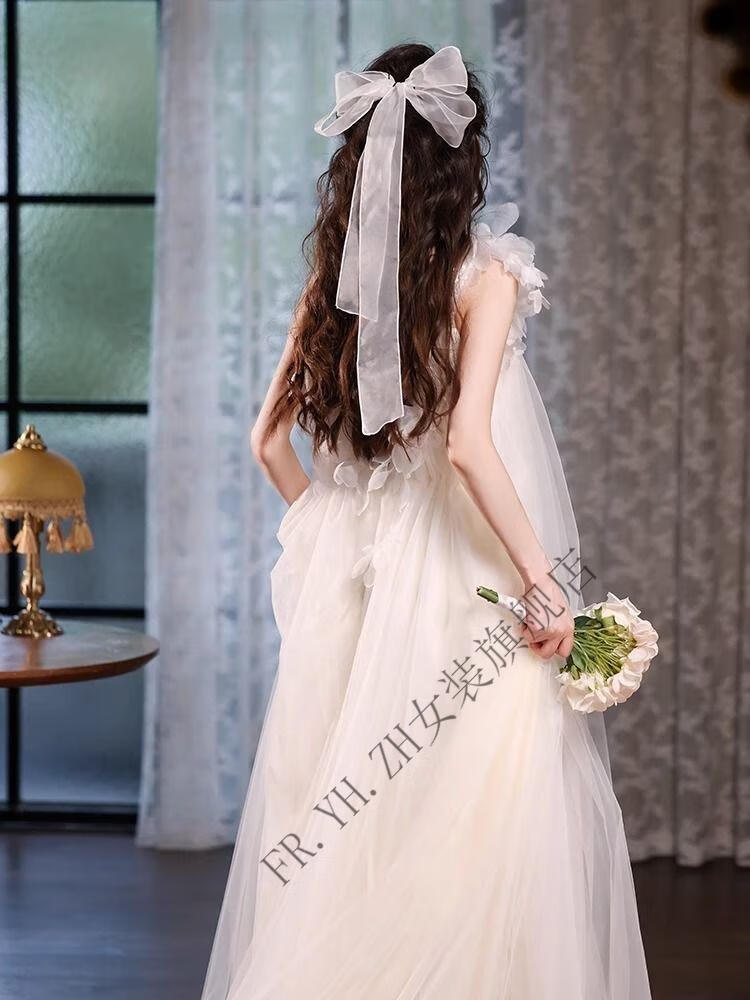 FR.YH.ZH晨袍女新娘结婚仙气吊带订婚礼服裙新款领证法式旅拍轻婚纱小个子 白色 无拖尾 S