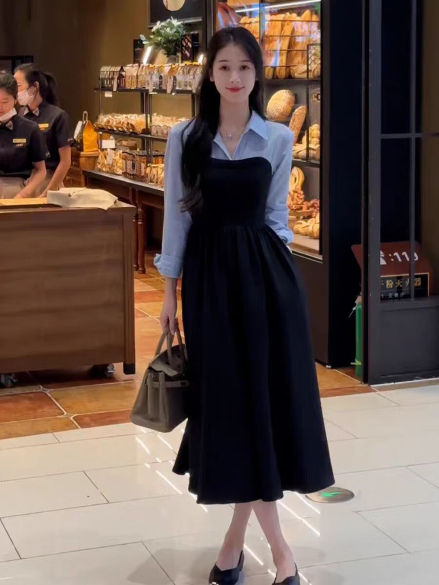 茯见 假两件黑色长袖衬衫连衣裙子女2025初春高级感穿搭套装韩系气质 衬衫连衣裙M码【建议90-110斤】