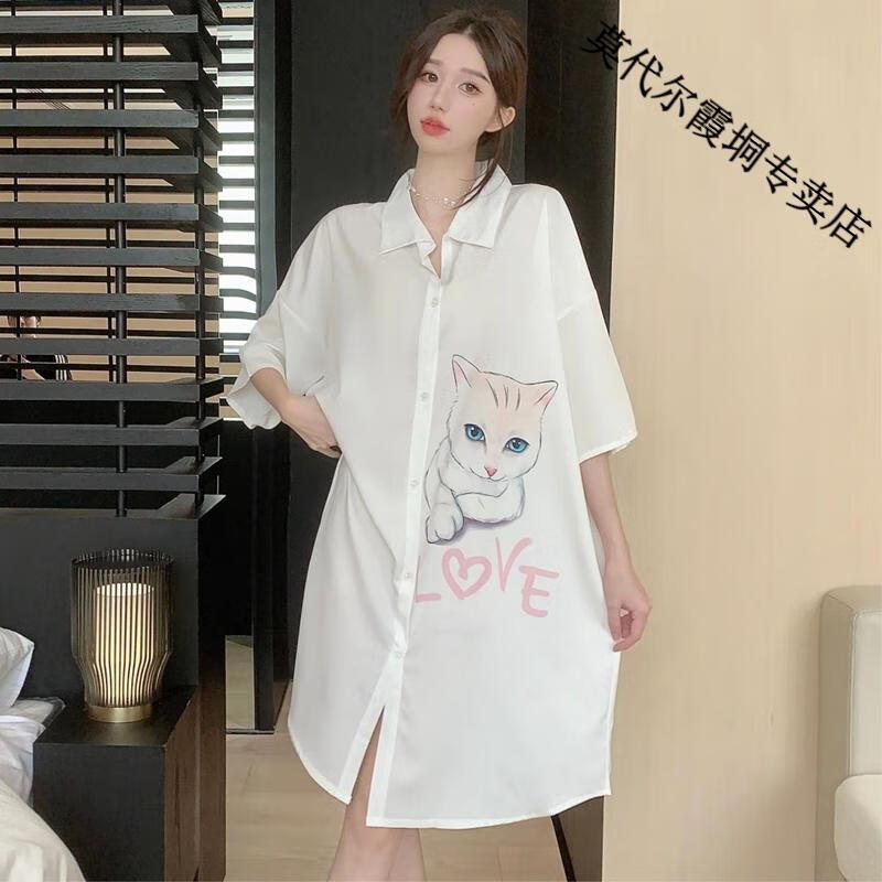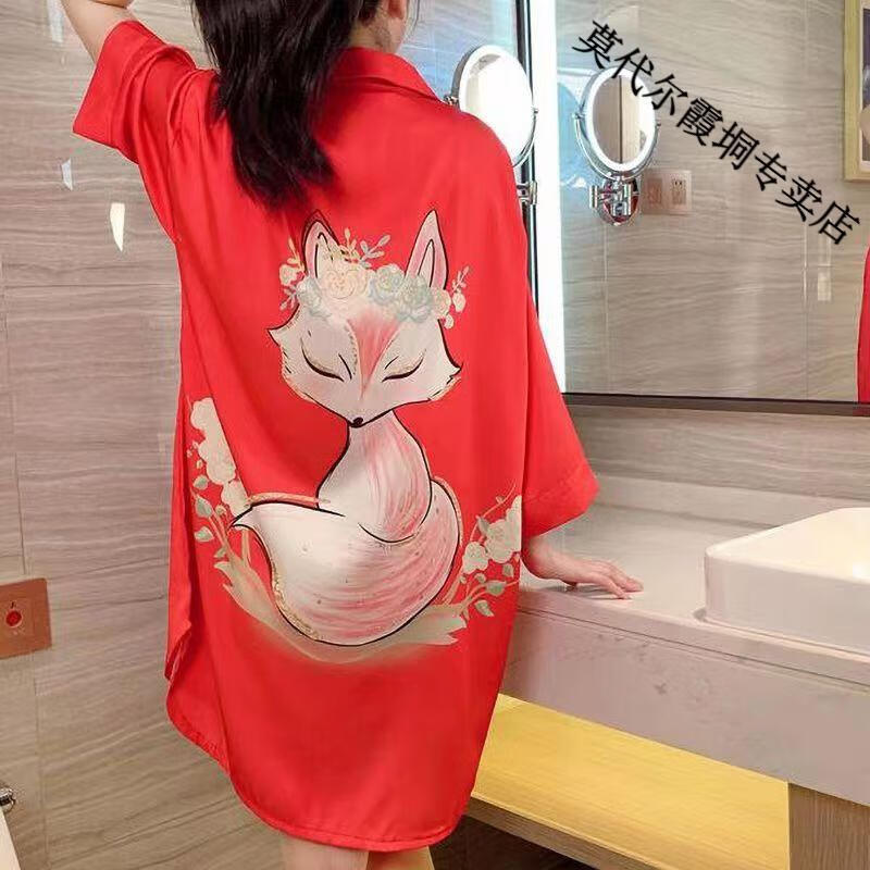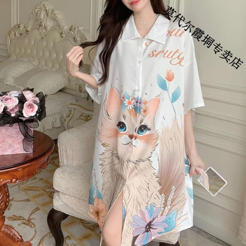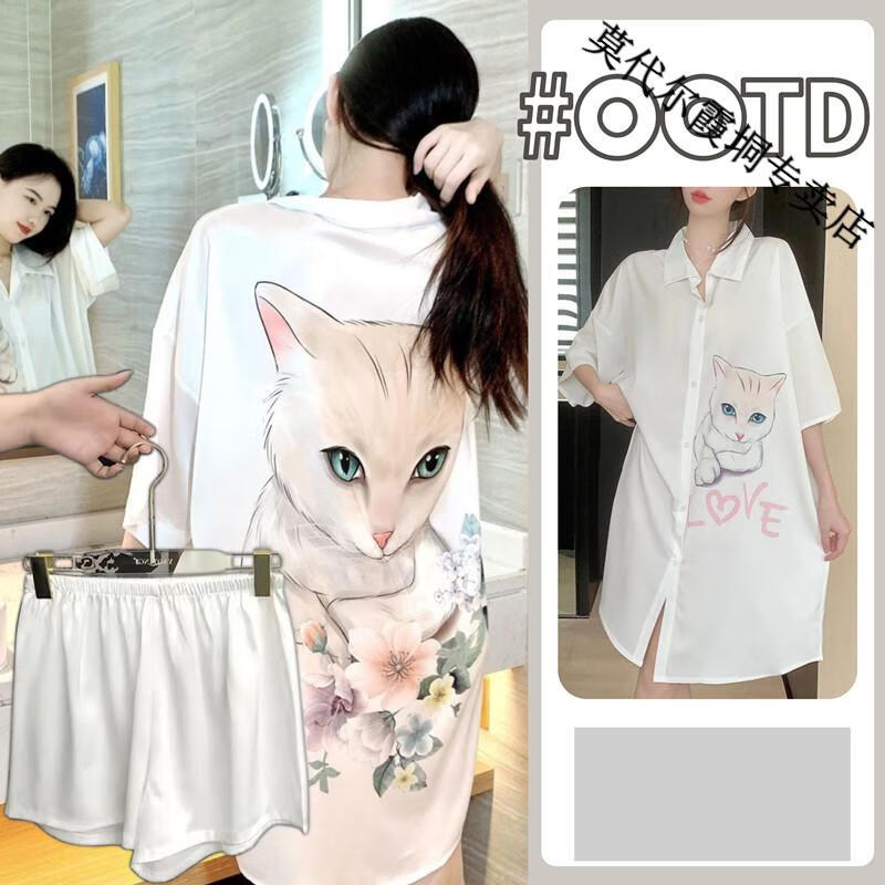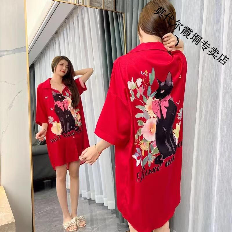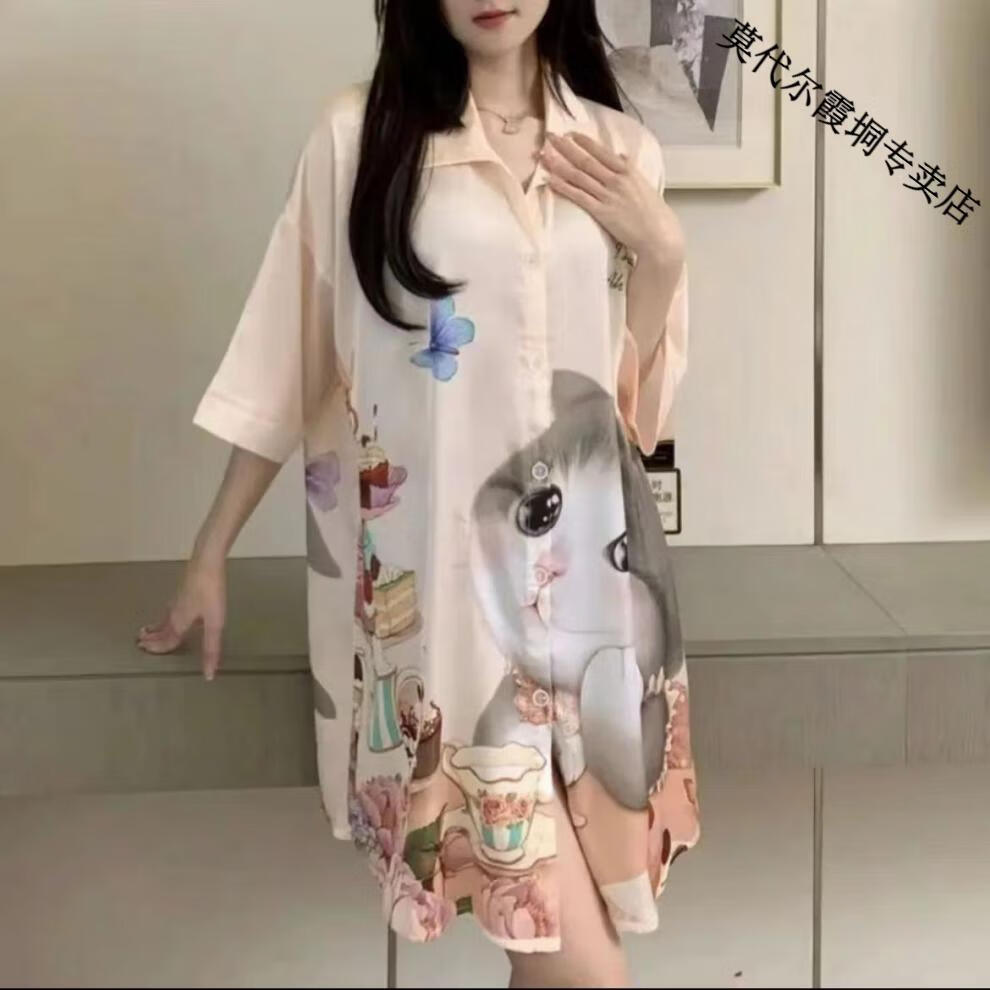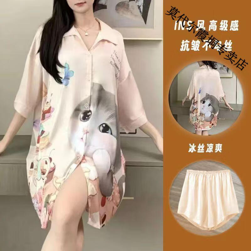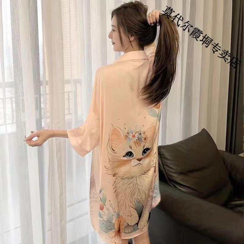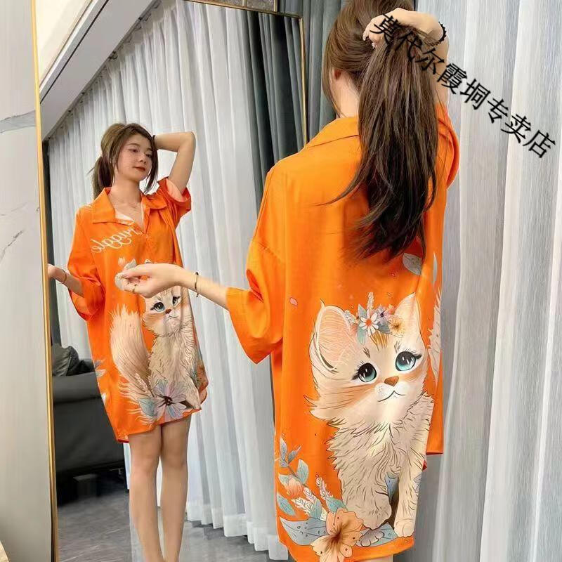 Pyjama modal sexy et pratique pour les rapports sexuels chemise de nuit pour femme été soie glacée 2025 nouvelle jupe cardigan ample à manches courtes jupe style petit ami 719 chat orange XL 115-130Jin Jin est égal à 0,5 kg