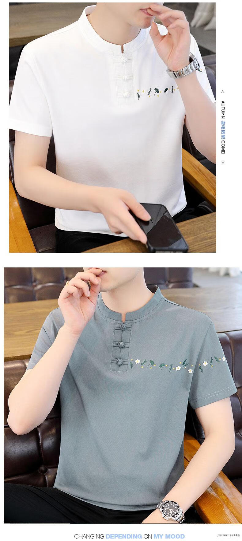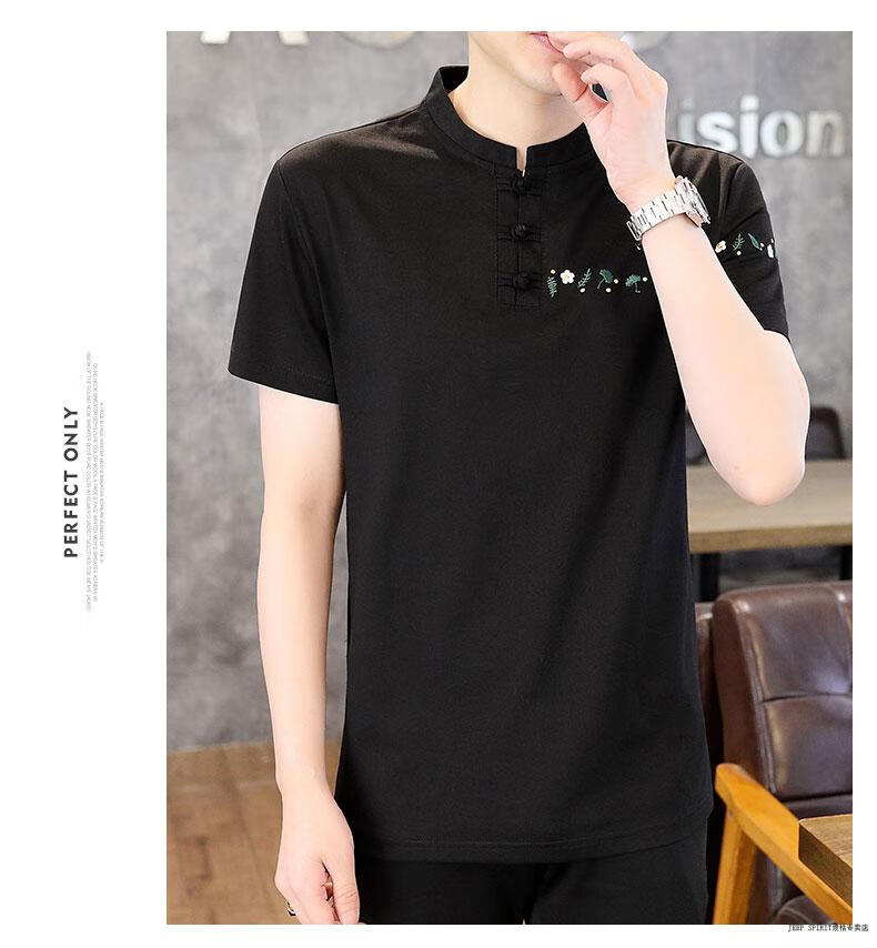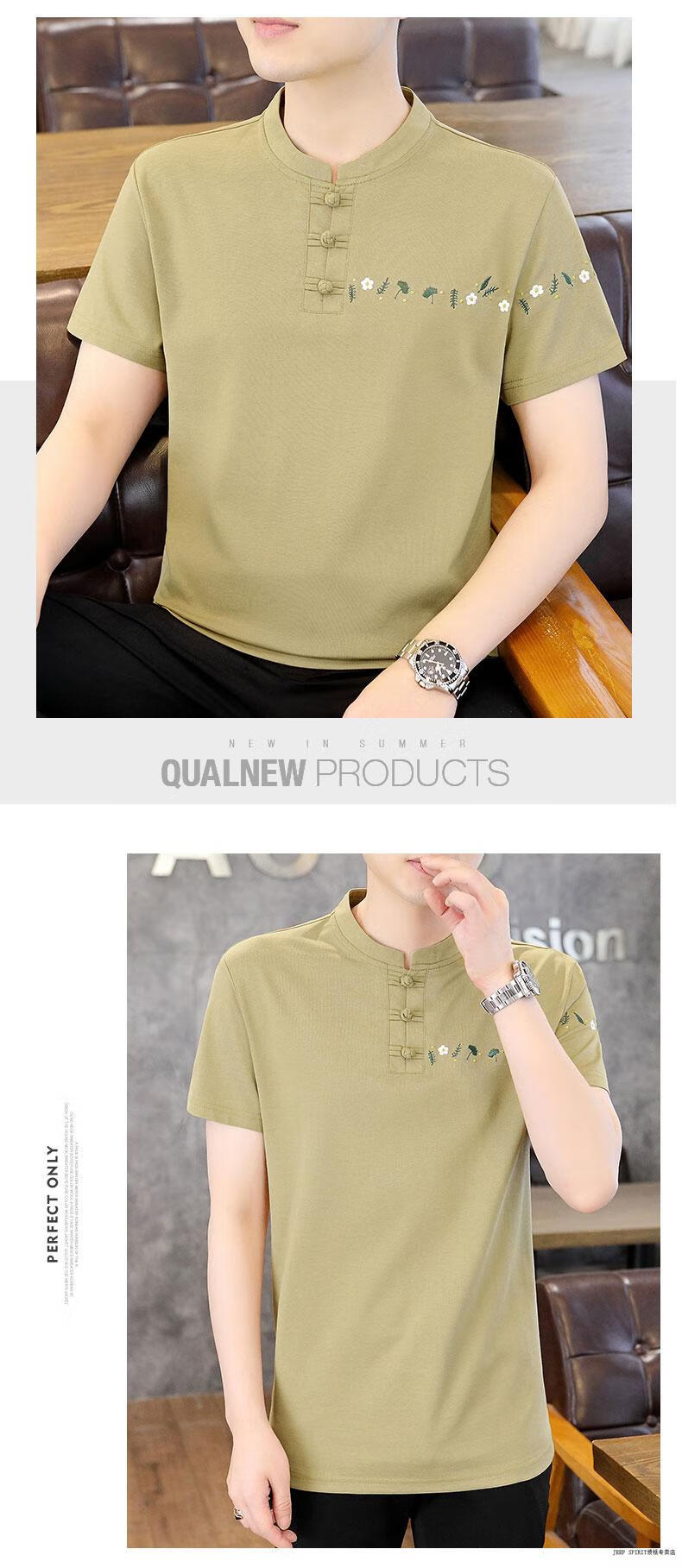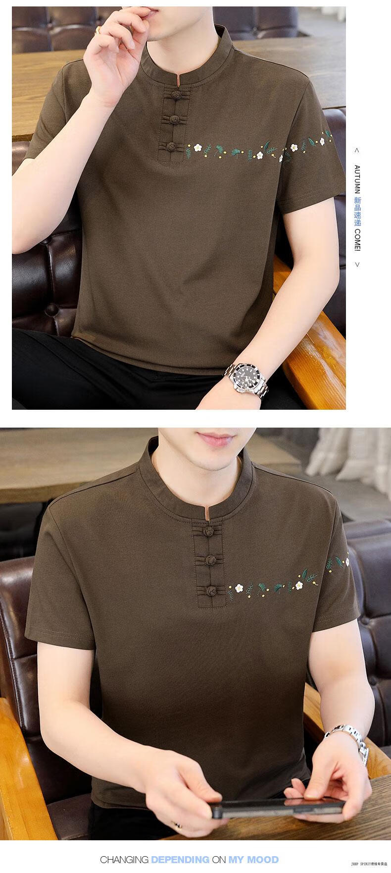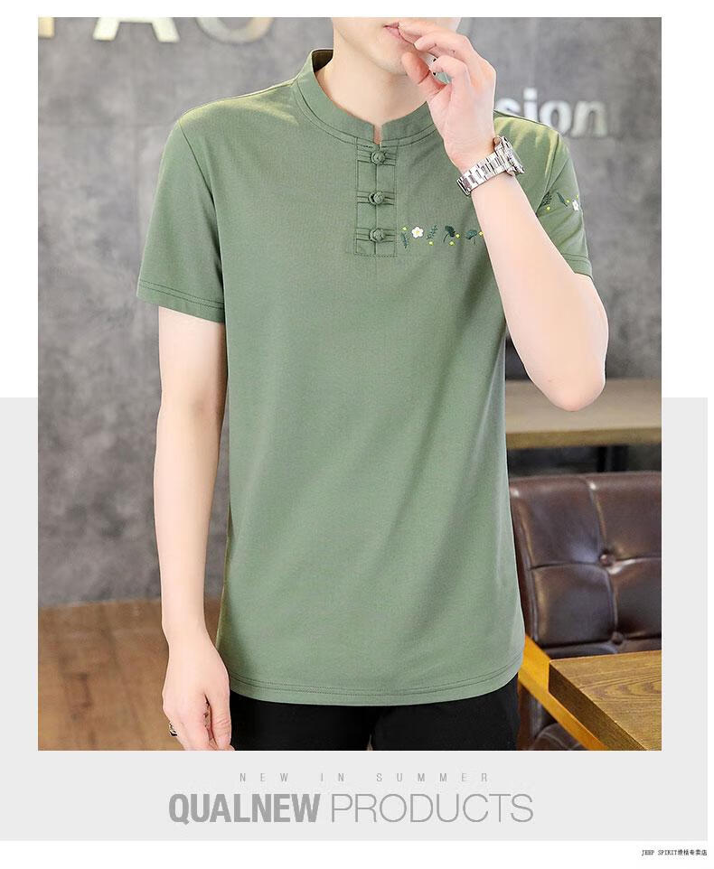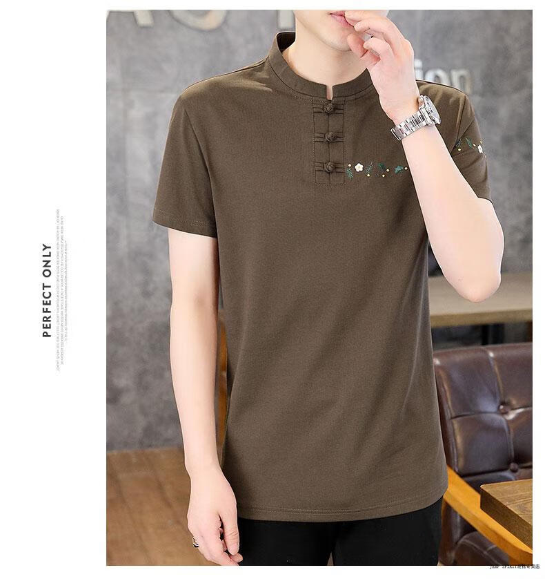 JEEP SPIRIT薄款立领短袖t恤男士2025夏季新款中式国潮半袖棉麻T恤刺绣上衣T 咖色 XL 125-135斤左右