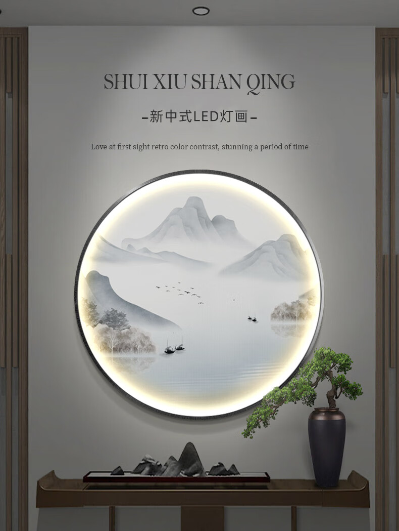 山头林村新中式圆形装饰画客厅玄关灯画山水画茶室禅意挂画水墨画风景壁画 724 直径50cm
