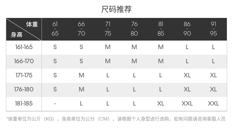 China (cm) 160-165/84-86 165-170 / 88-90 167-172 / 92-96 168-173 / 98-102 170-176 / 106-110