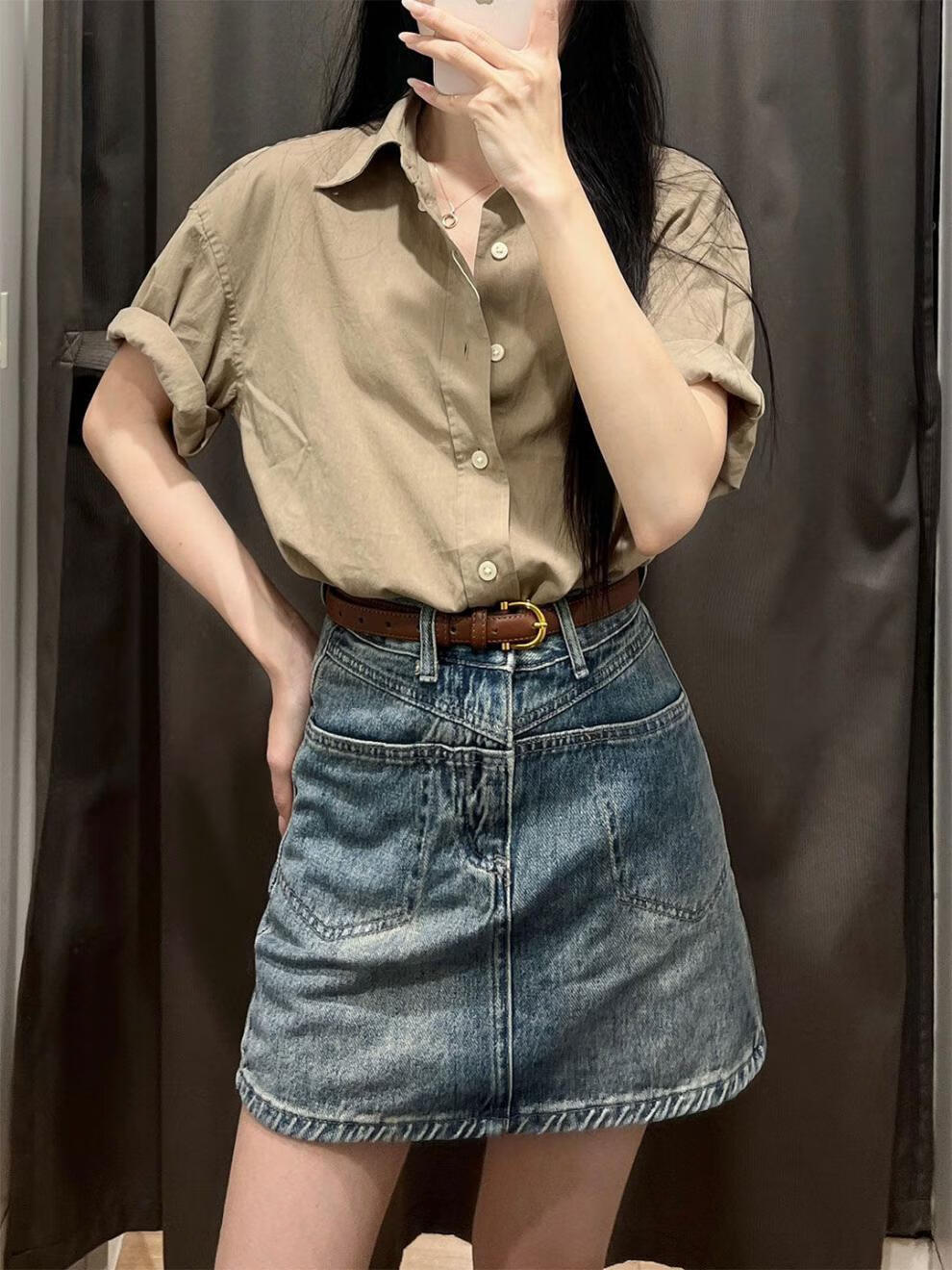 清池影(QINGCHIYING)小个子盐系穿搭港风复古Polo领宽松显瘦白色衬衫牛仔半身裙两件套 【单件】687#白色衬衫 M 【建议90-100斤】