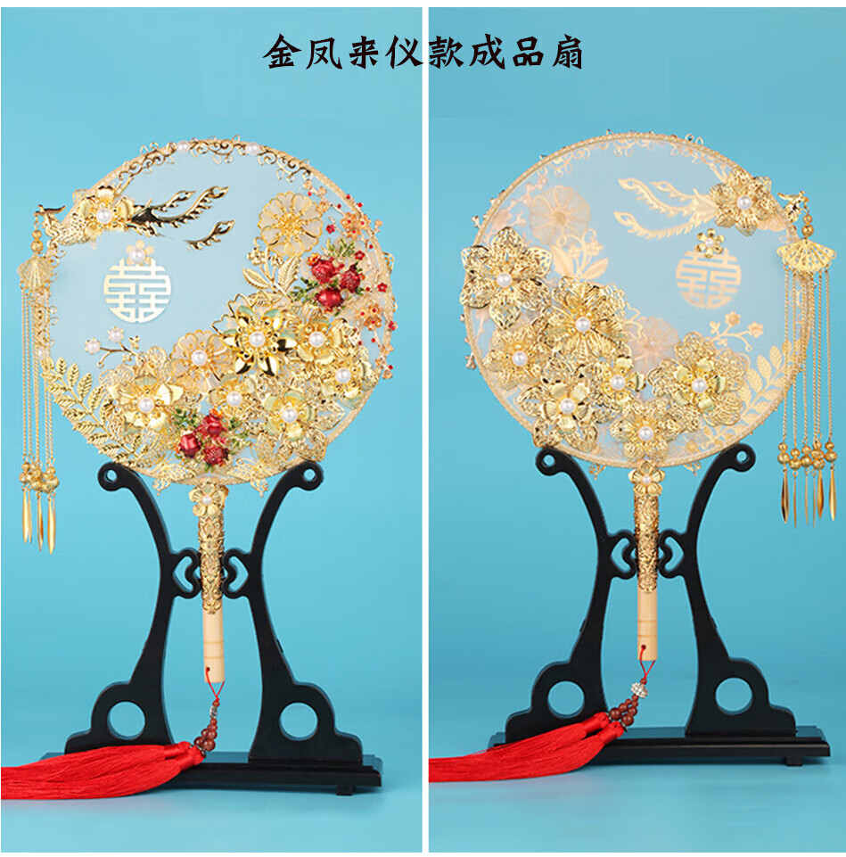 LISM新娘结婚礼扇子出嫁手捧花中式古风团扇秀禾服手工喜扇diy材料包 B款金凤成品 (+扇架礼盒六件套)