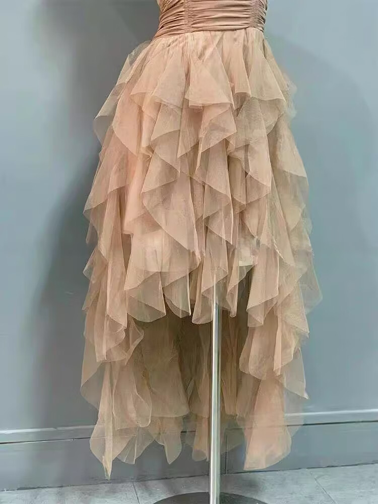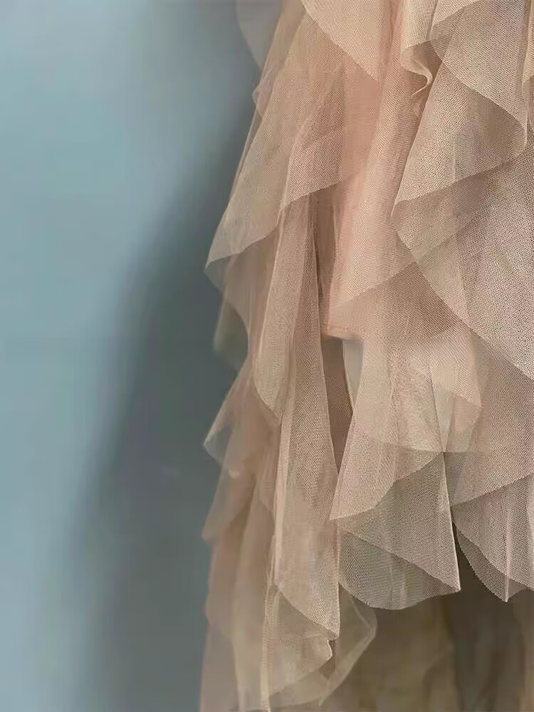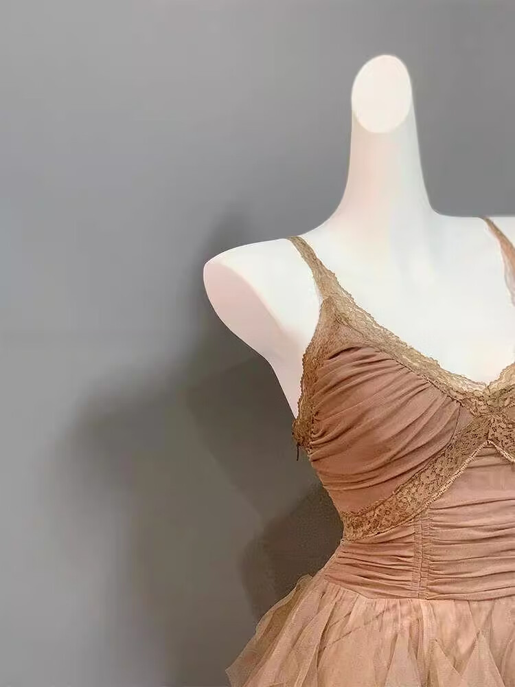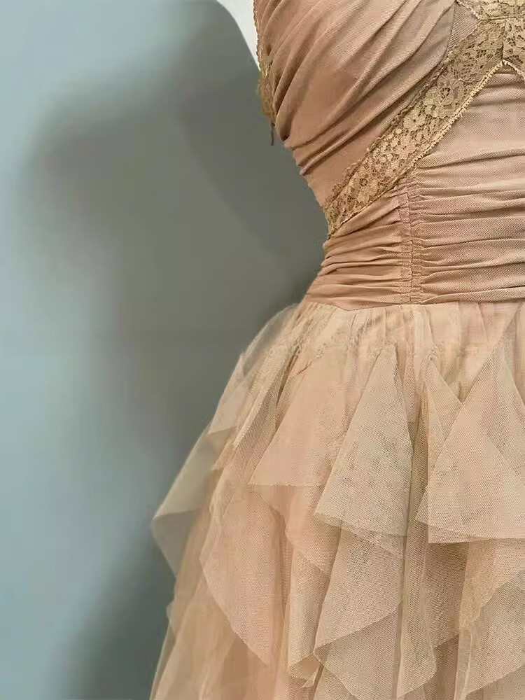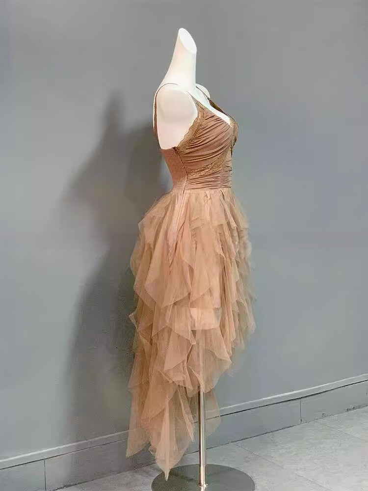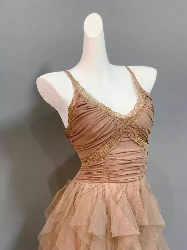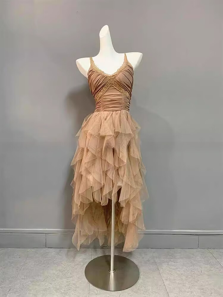 闪动少女(SHANDONGSHAONV)法式吊带连衣裙女感气质名媛生日party小礼裙网纱拖尾公主裙 咖色吊带连衣裙(版) M