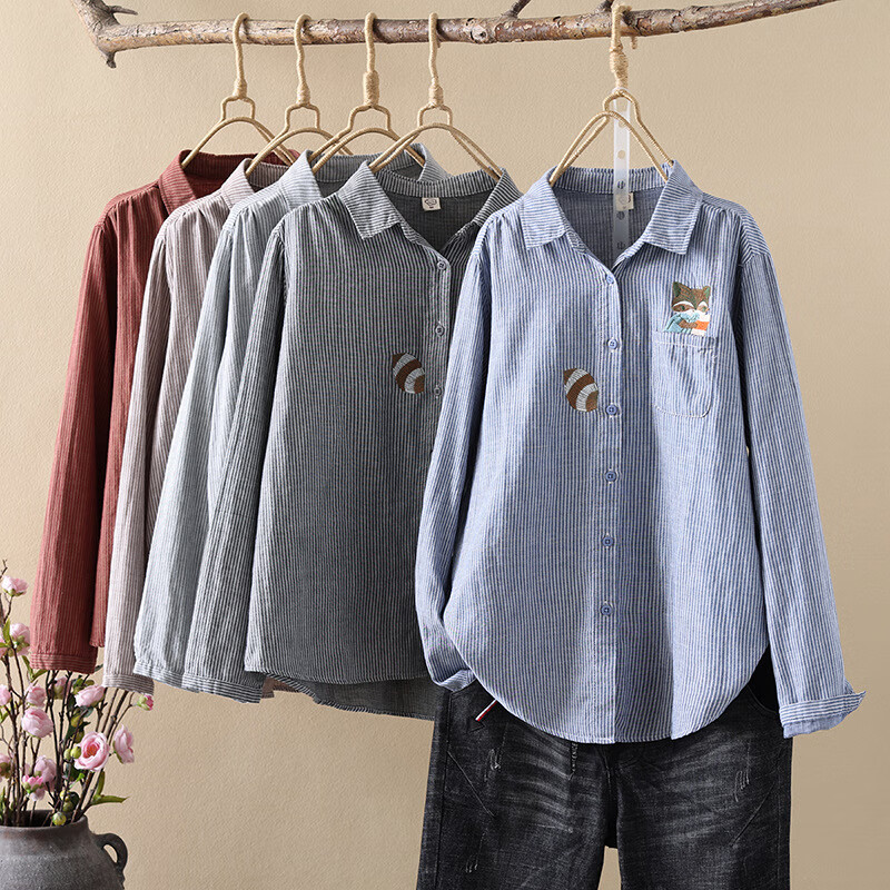 HIPPATIA100%纯棉衬衫狐狸刺绣条纹女双层长袖宽松春秋文艺小清新打底衬衣 浅灰色 w6623 M
