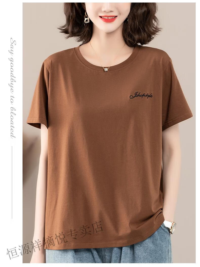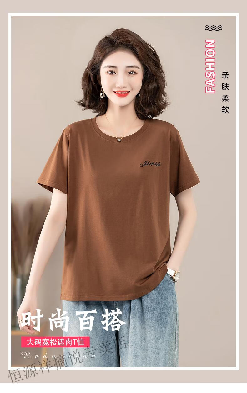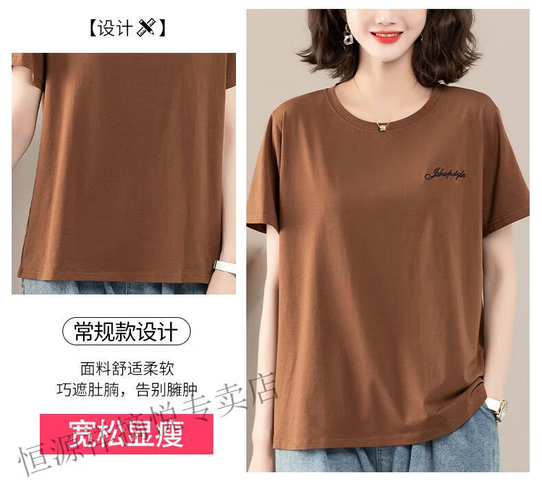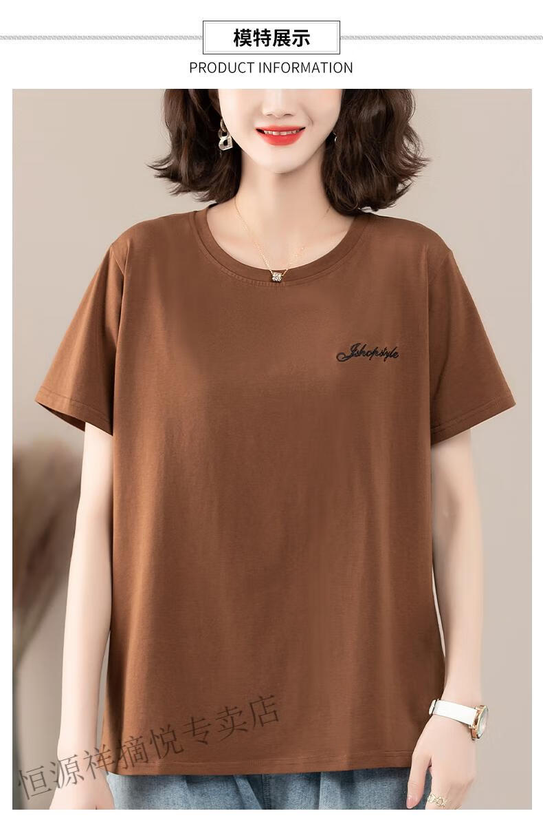 恒源祥中年妈妈纯棉t恤女夏短袖宽松汗衫加大码女装中老年圆领咖色上衣 咖啡色【9892款】 L 适合100-115斤