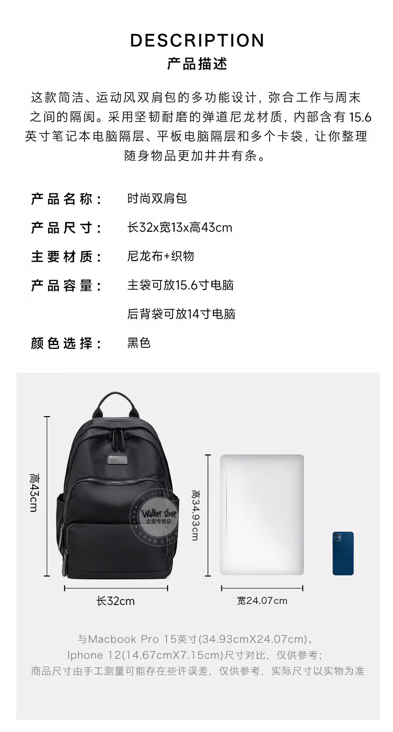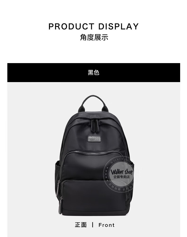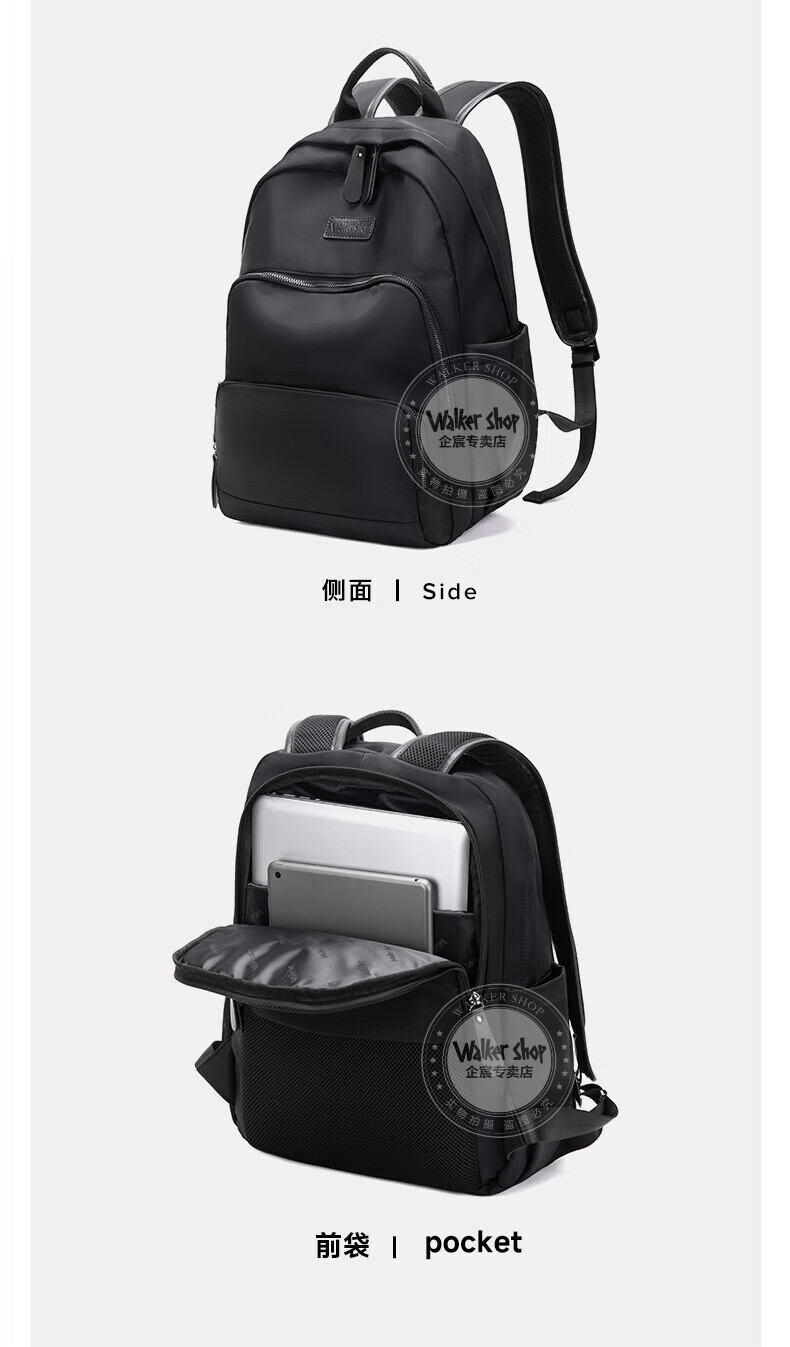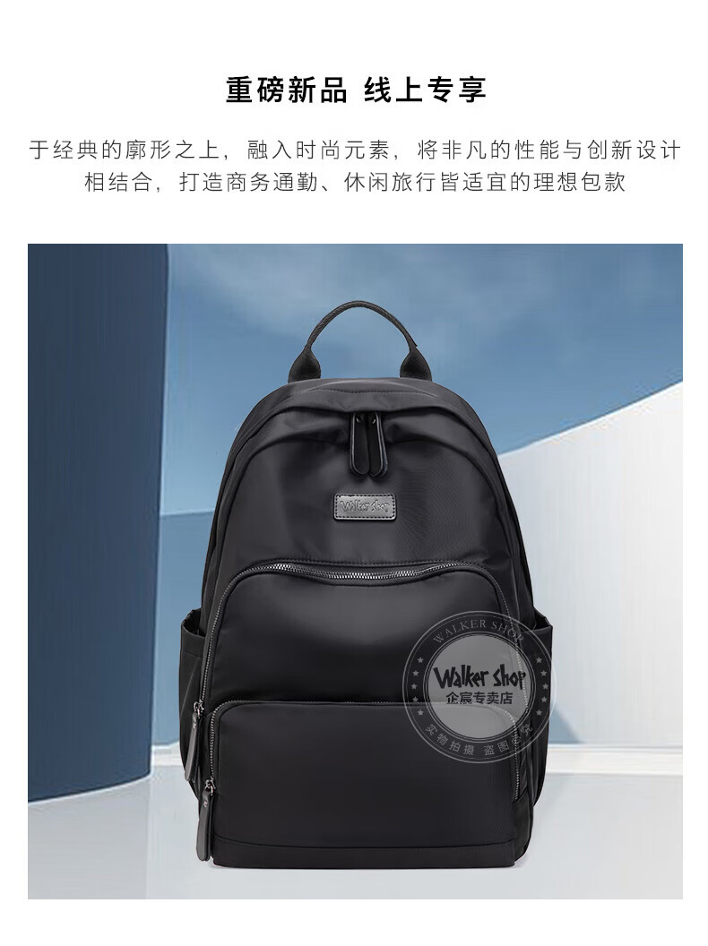 Walker Shop品牌轻奢双肩包男书包简约防水尼龙牛津布旅行电脑背包男女 时尚黑 [14寸] 43*32*13cm