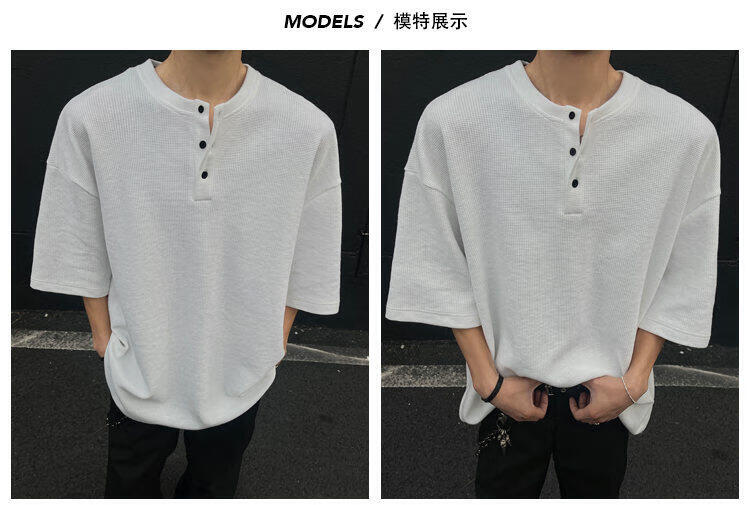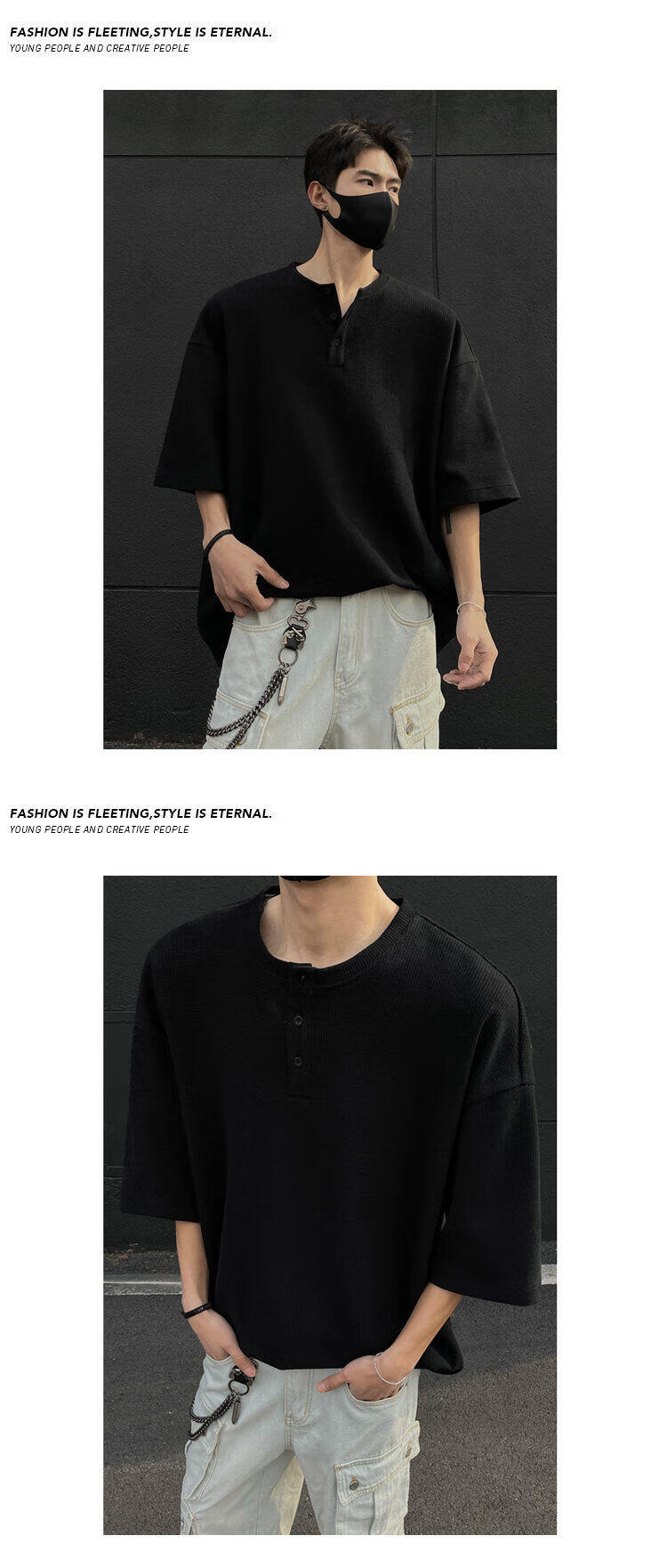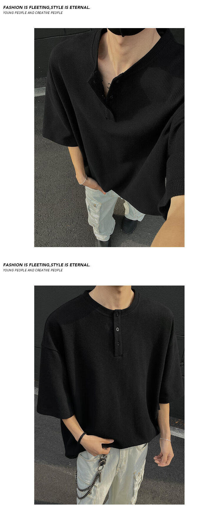 至唯华夫格亨利领短袖t恤男生春夏季潮流牌宽松百搭半袖T体恤衫衣服男 黑色 L 【推荐110-130斤】