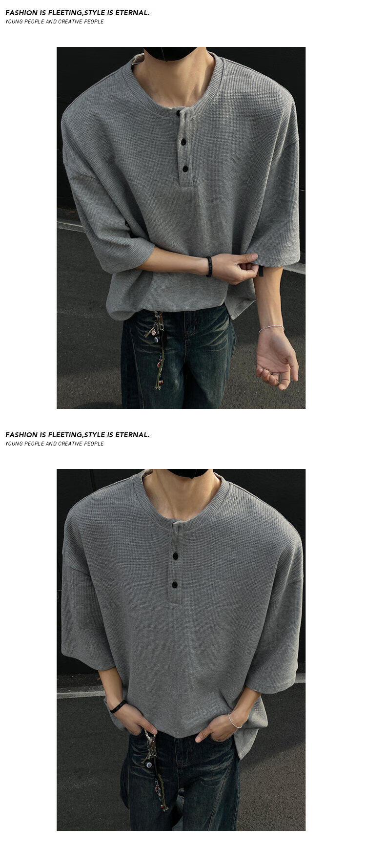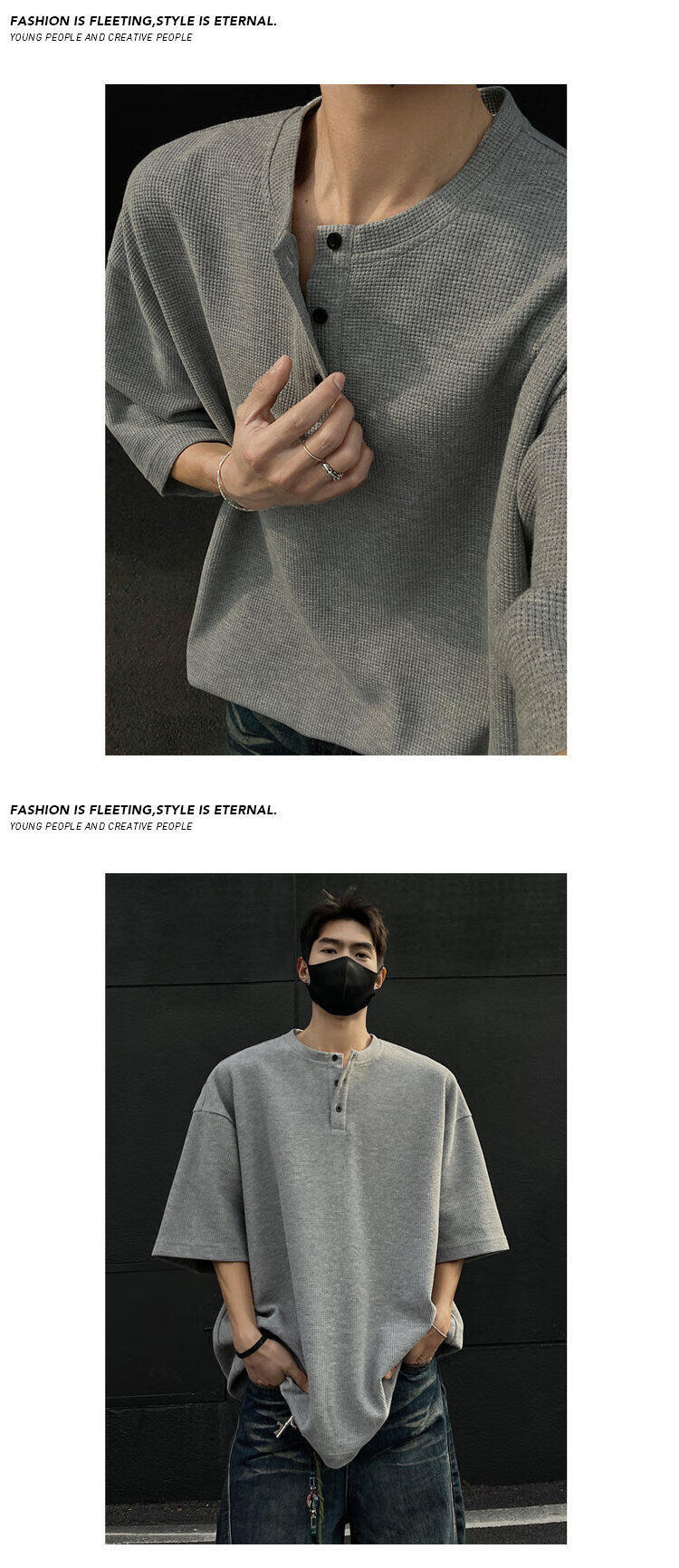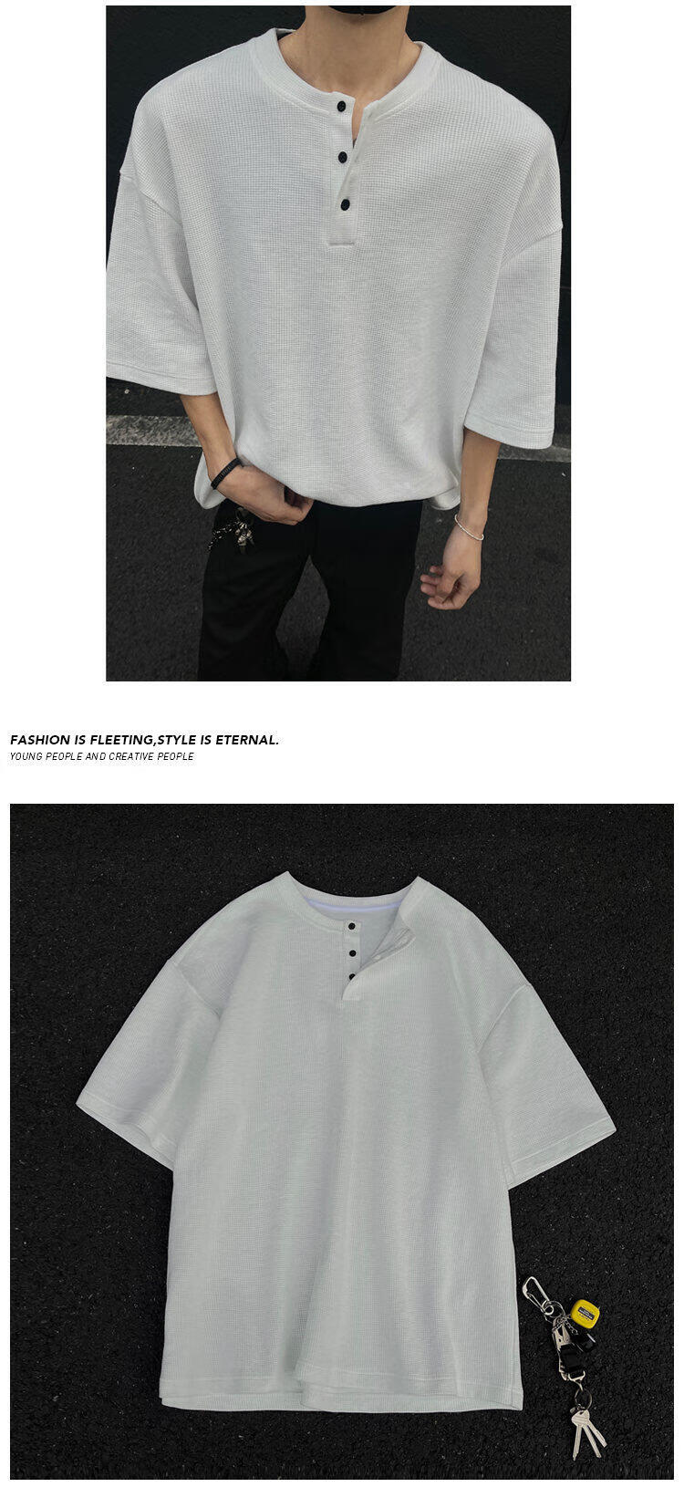 至唯华夫格亨利领短袖t恤男生春夏季潮流牌宽松百搭半袖T体恤衫衣服男 黑色 L 【推荐110-130斤】