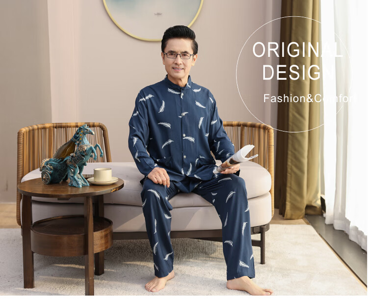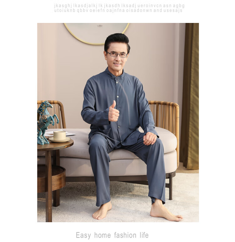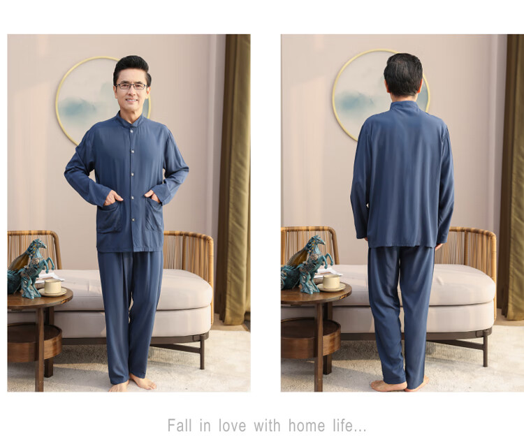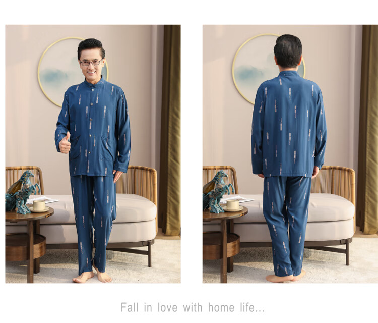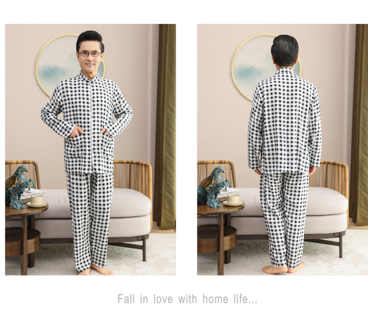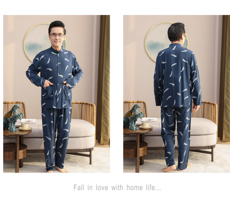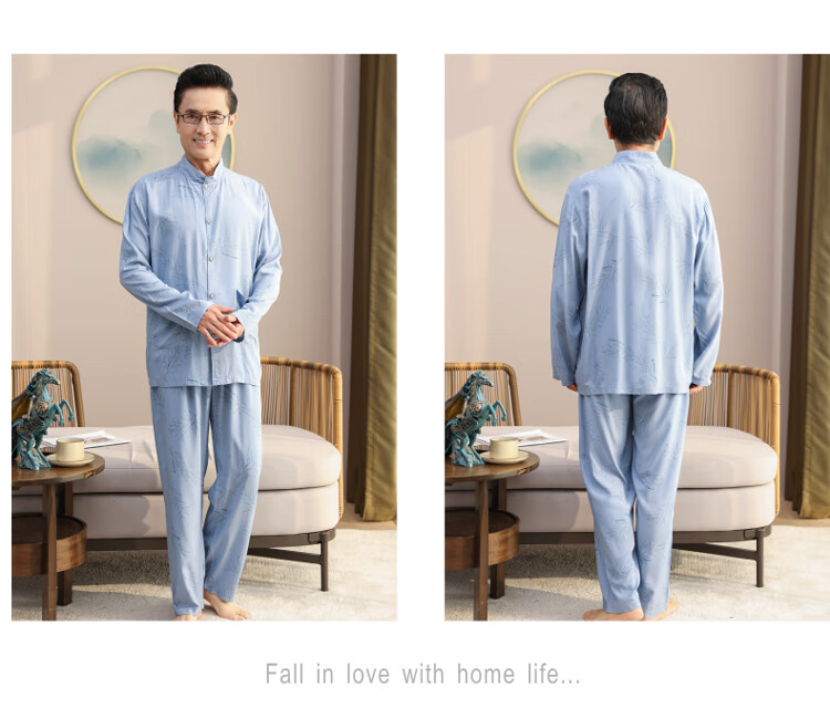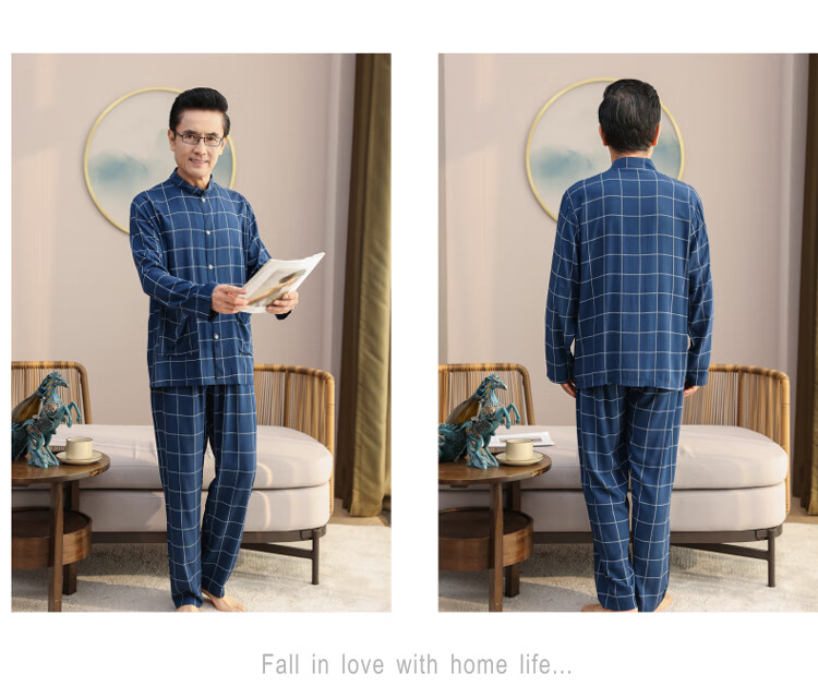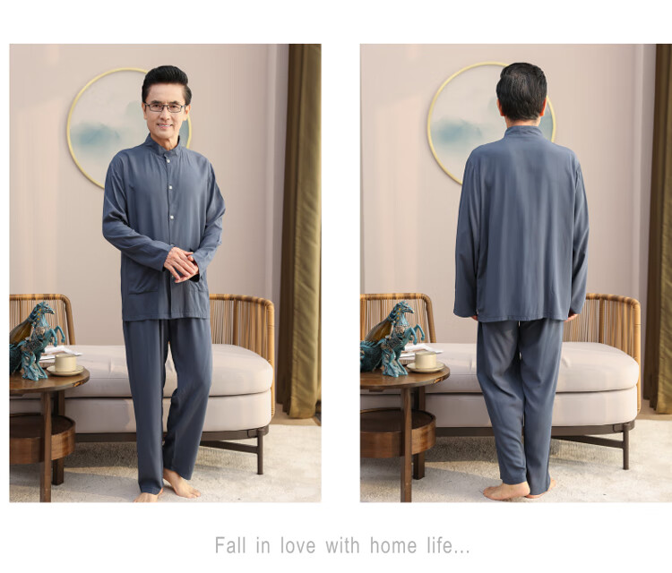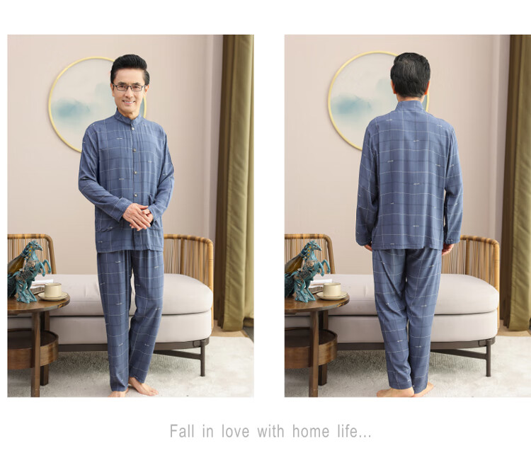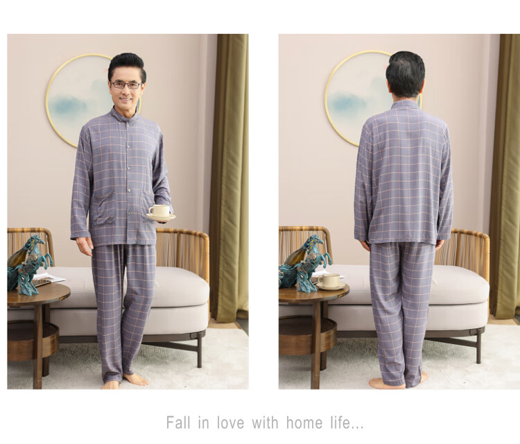 浪莎睡衣男士棉绸长袖开衫中老年男春秋夏季薄款衬衣棉家居服两件套装 MC-1592 L 建议100-135斤