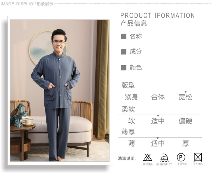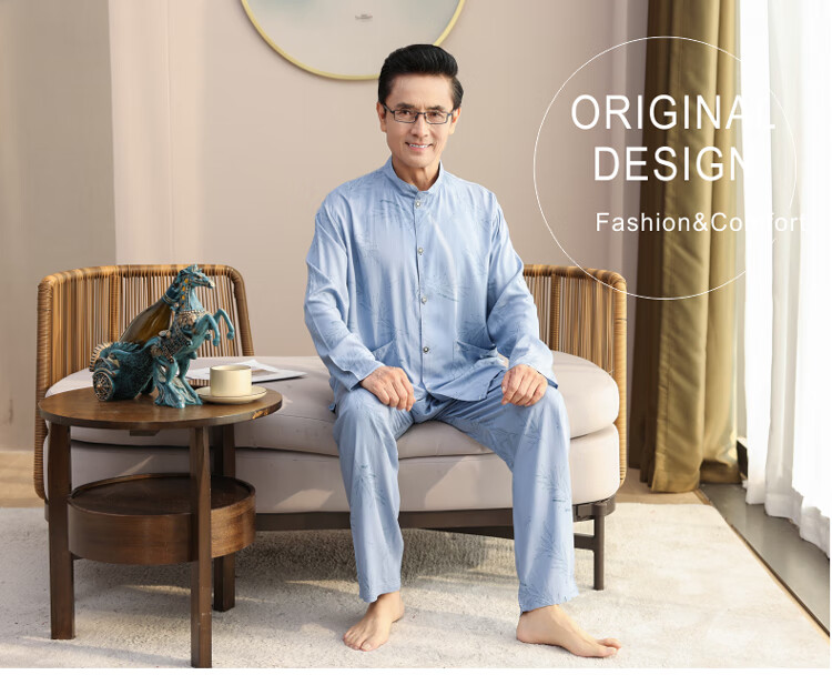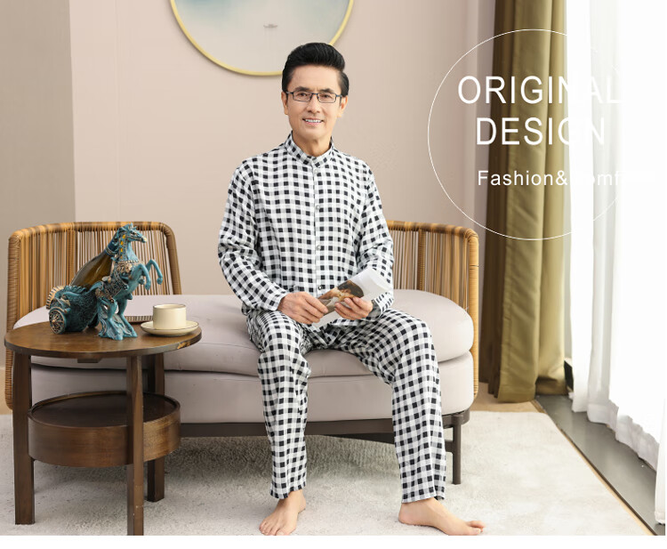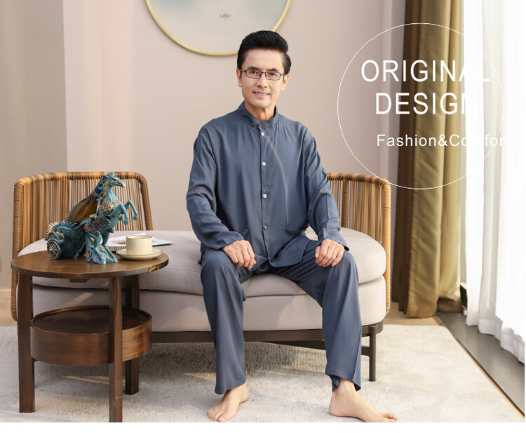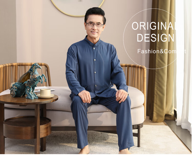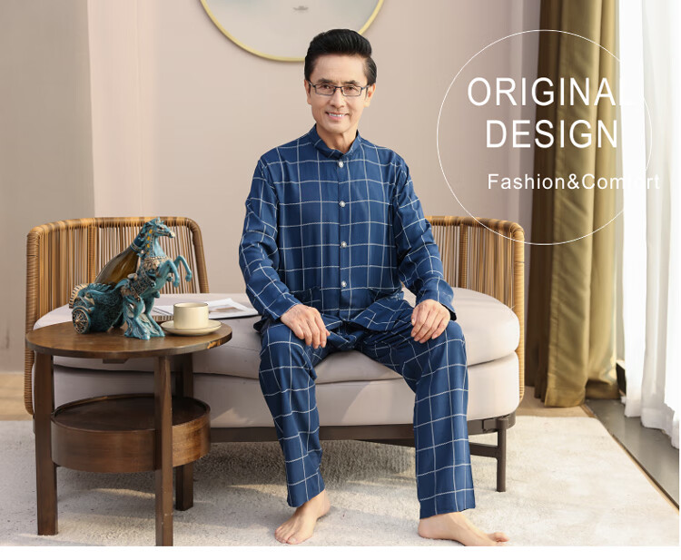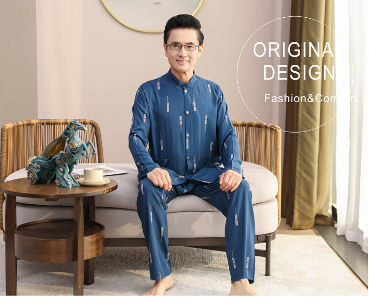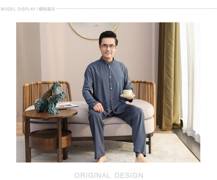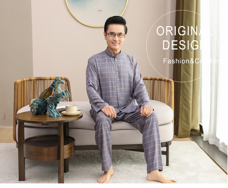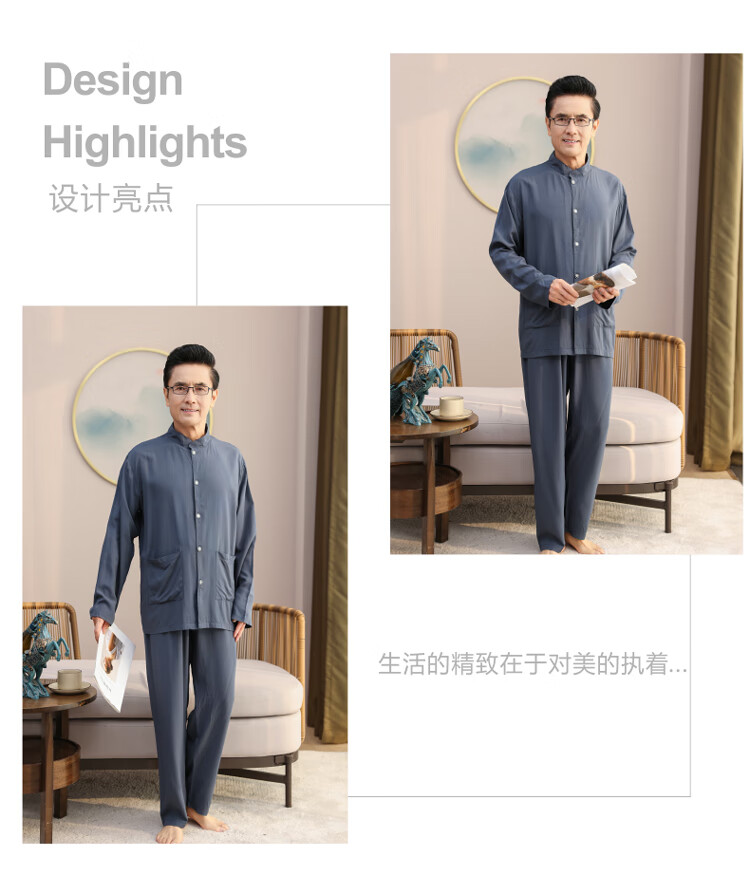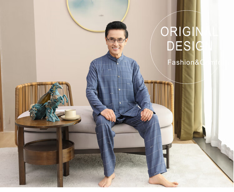 浪莎睡衣男士棉绸长袖开衫中老年男春秋夏季薄款衬衣棉家居服两件套装 MC-1592 L 建议100-135斤