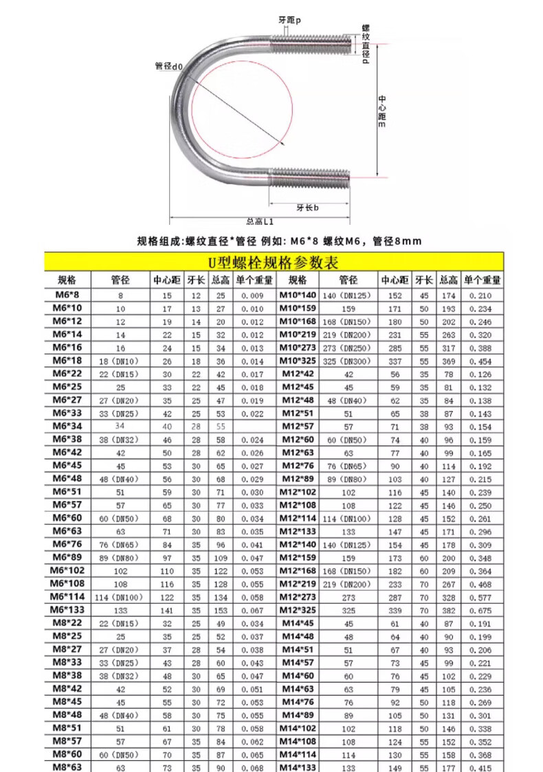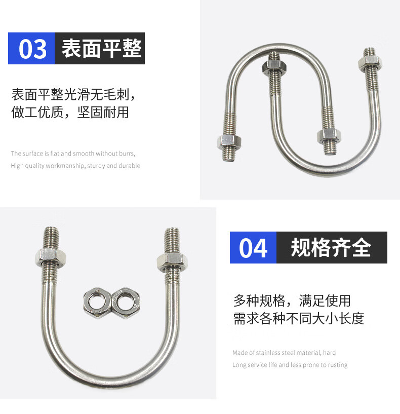 XMSJ304U-förmige Klemme U-förmige Schraube enthält 2 weibliche Edelstahl-M6-M16U-förmige Schraubrohrklemmenklemmen M8 * 1592-Sets