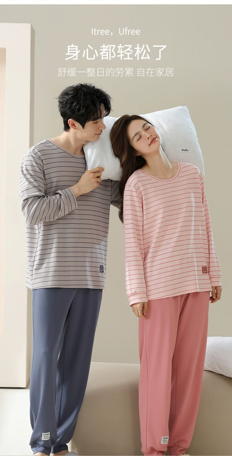 Urban Beauty Round Neck Pajamas Women's 2025 Spring New 100 Pure Cotton Striped Home Clothes Two-piece Set 17801 Women's Style/Main Picture Color One Size M