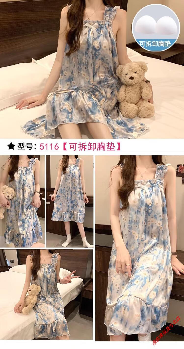 浪莎(LangSha)睡裙女夏季自带胸垫冰丝凉感吊带睡衣夏天女士甜美可爱家居服春秋 3887[不可拆胸垫] L [95-120斤]