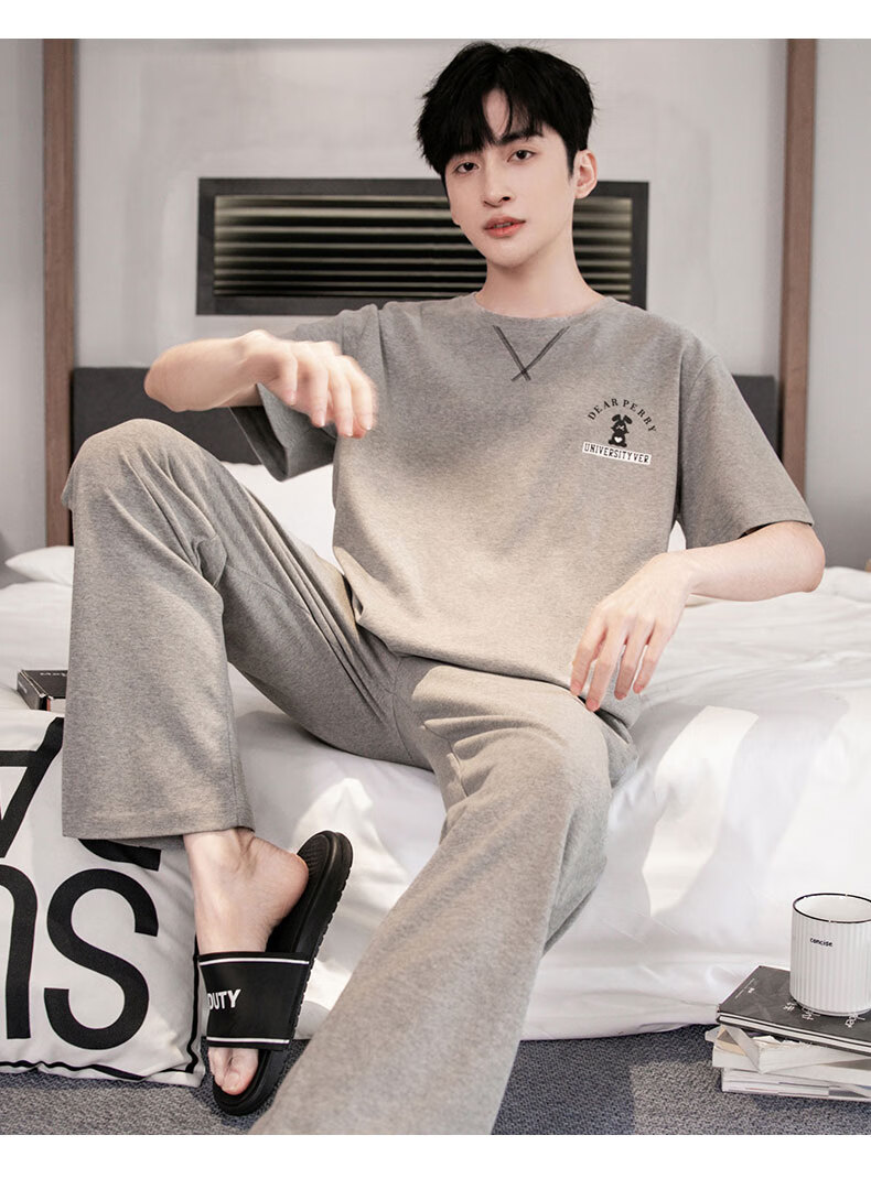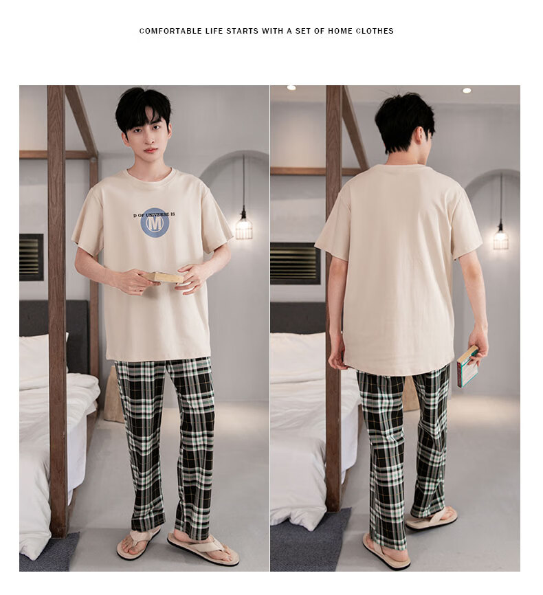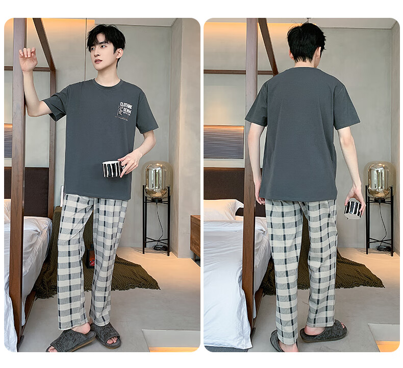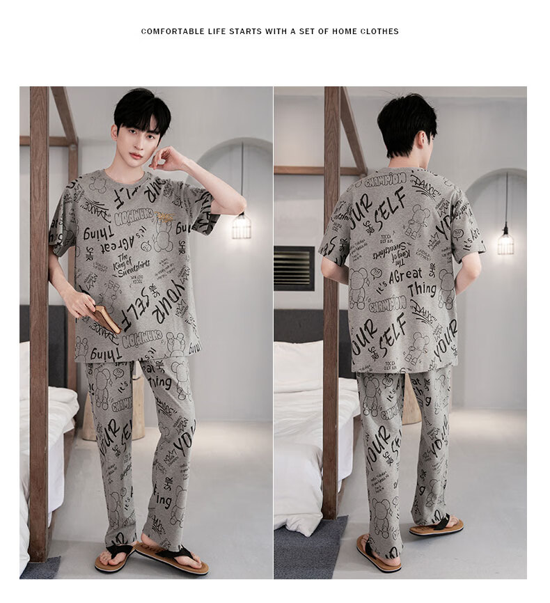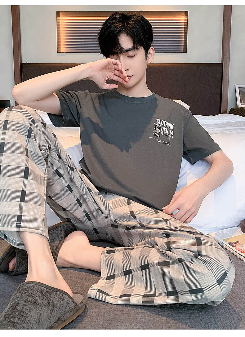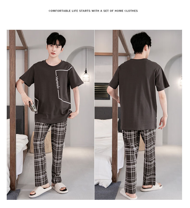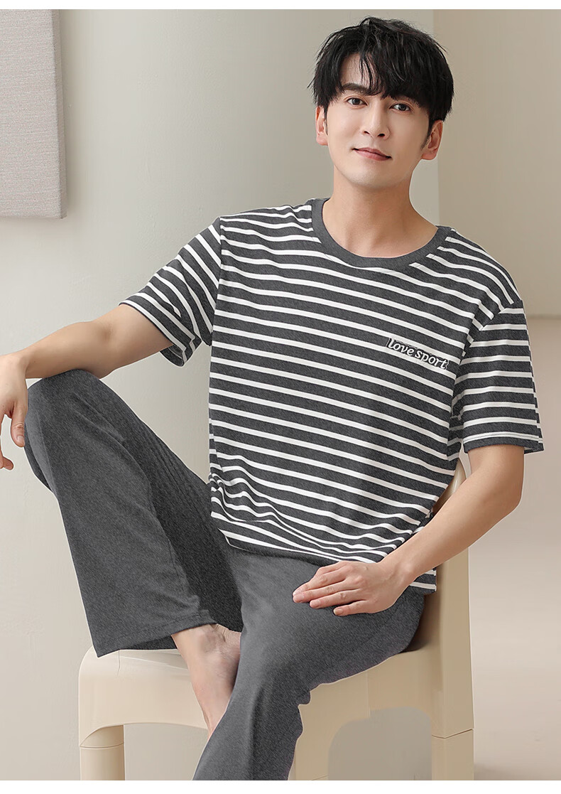 LOYACKIND男士睡衣夏季薄款短袖长裤棉春秋棉色宽松青少年家居服套装 咖啡色 9207 L 【105-130斤】100棉派邦淇