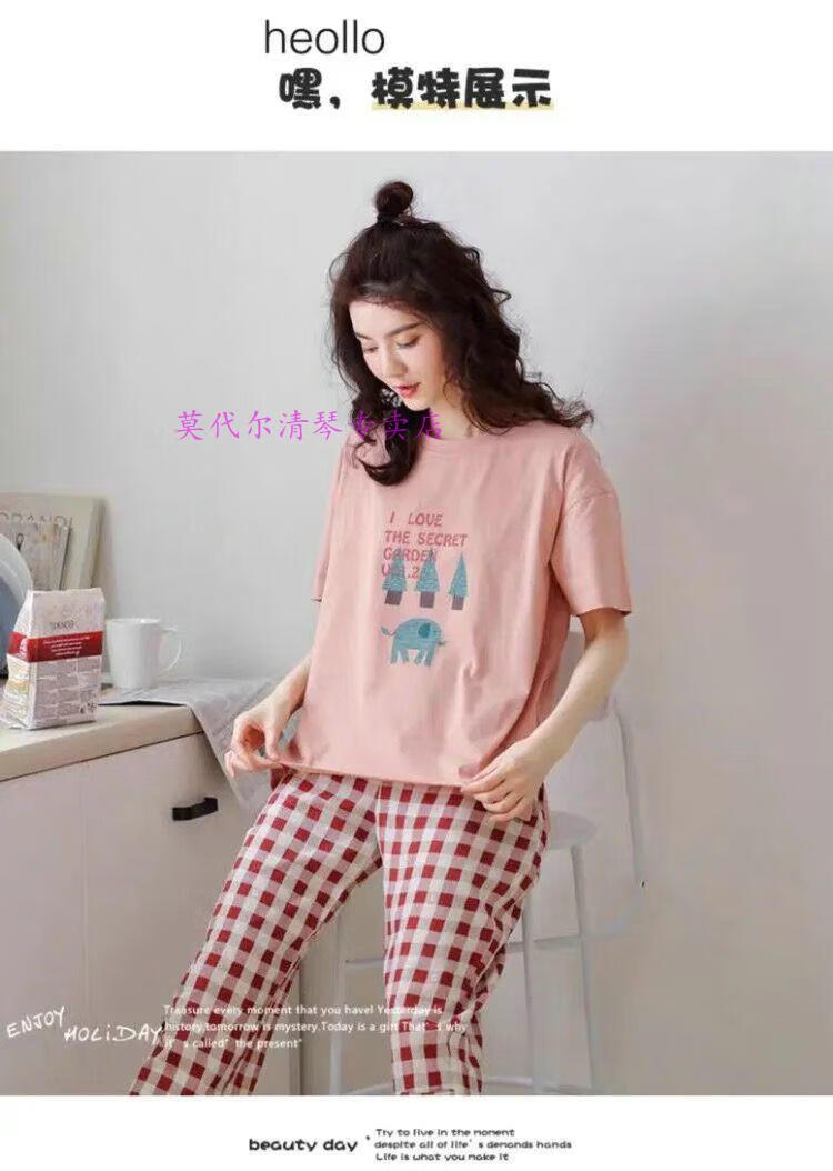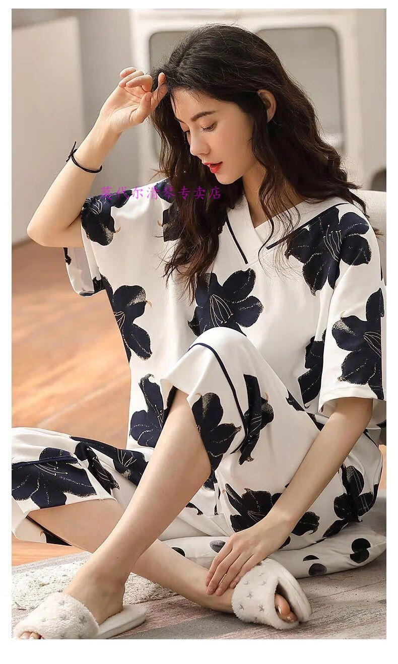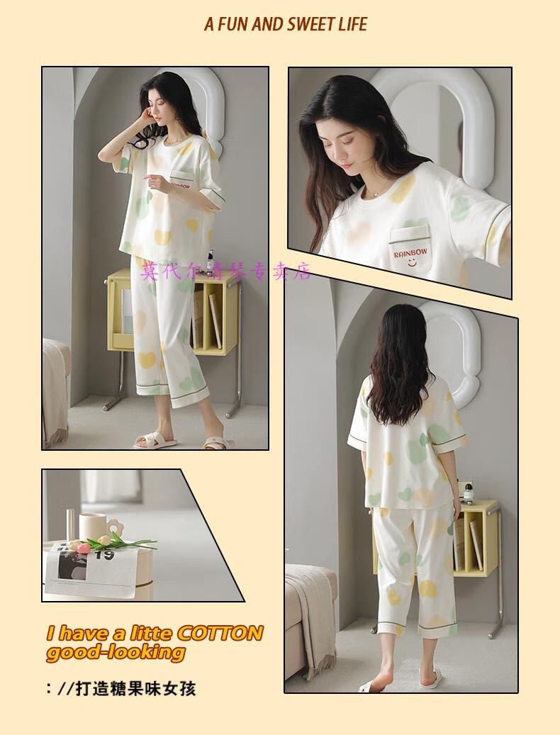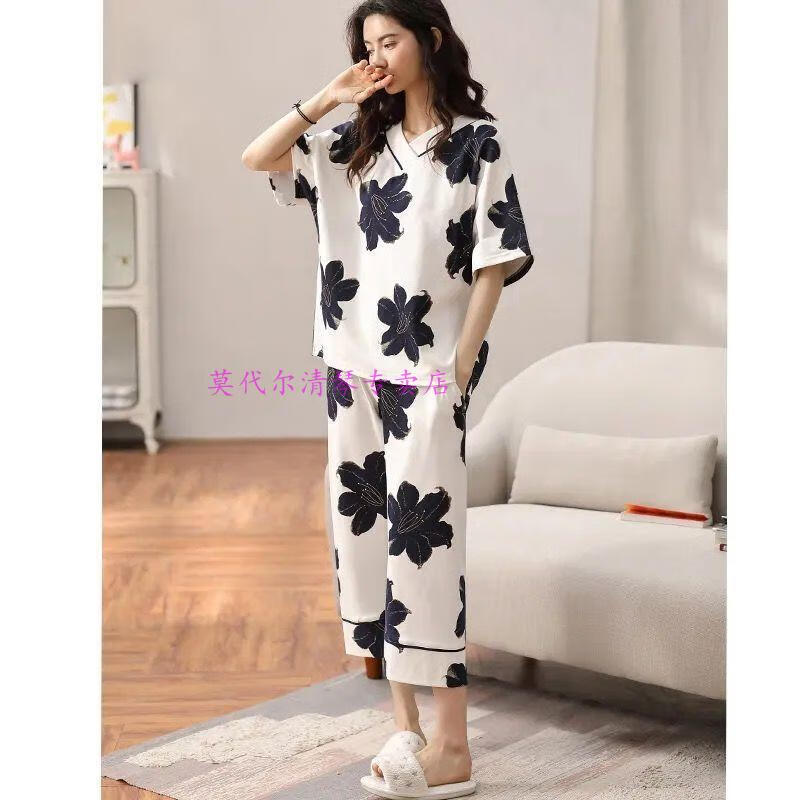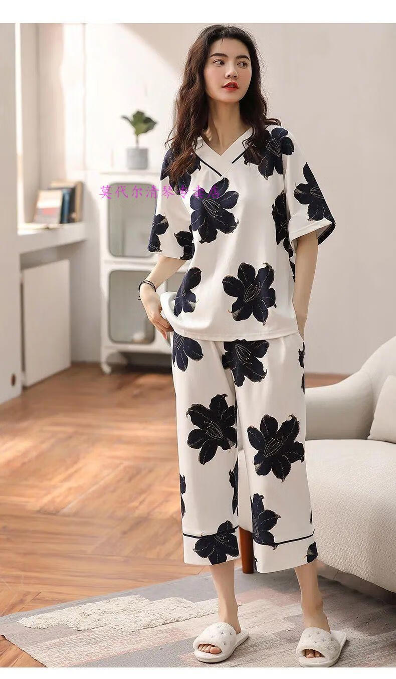 莫代尔2025空调服睡衣女士夏季纯棉短袖七分裤可外穿甜美休闲全棉家居服 607灰色条纹 黑白条纹9848 3XL 建议145-165斤穿