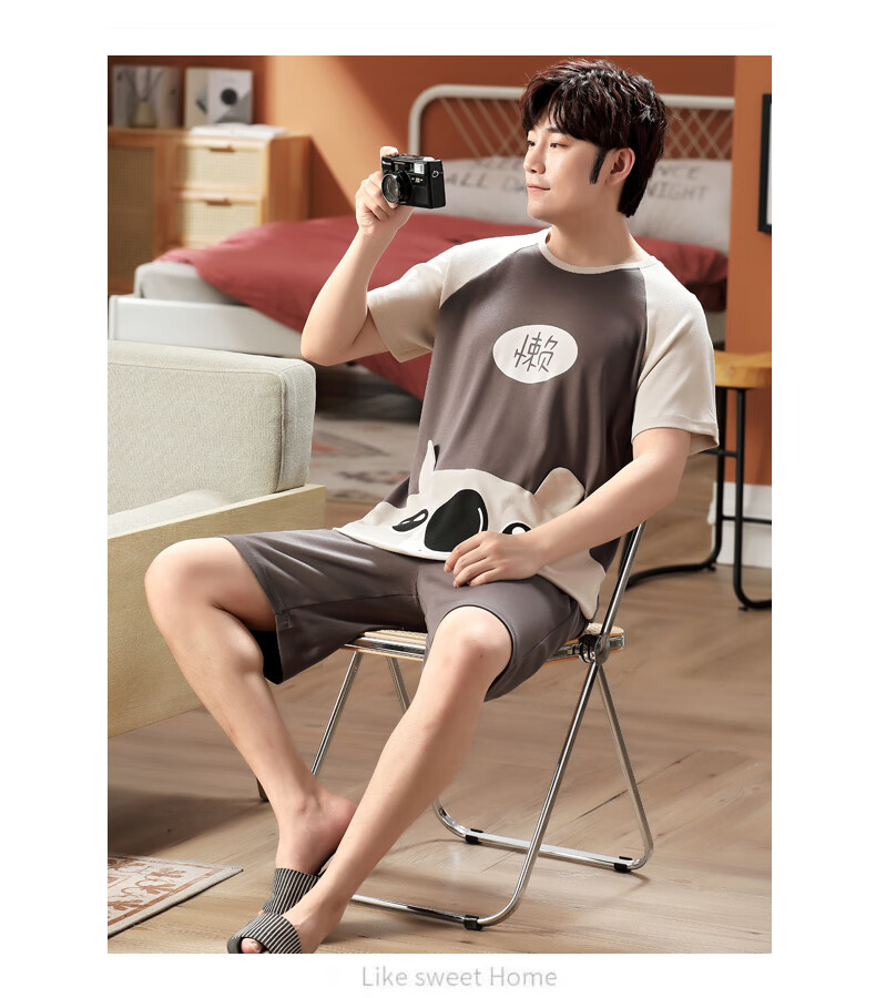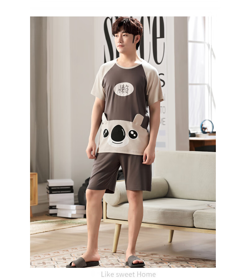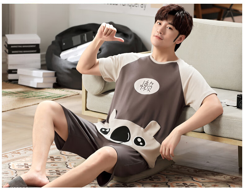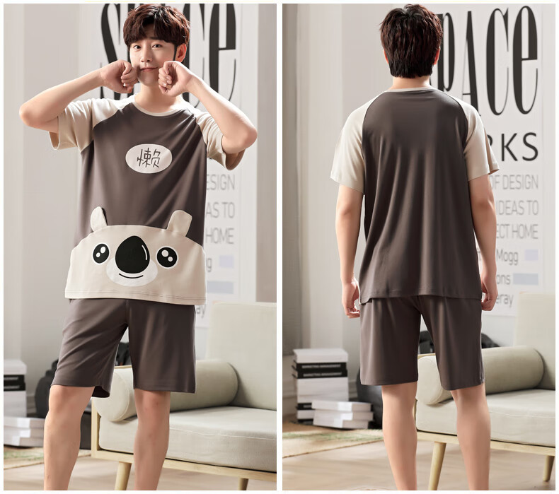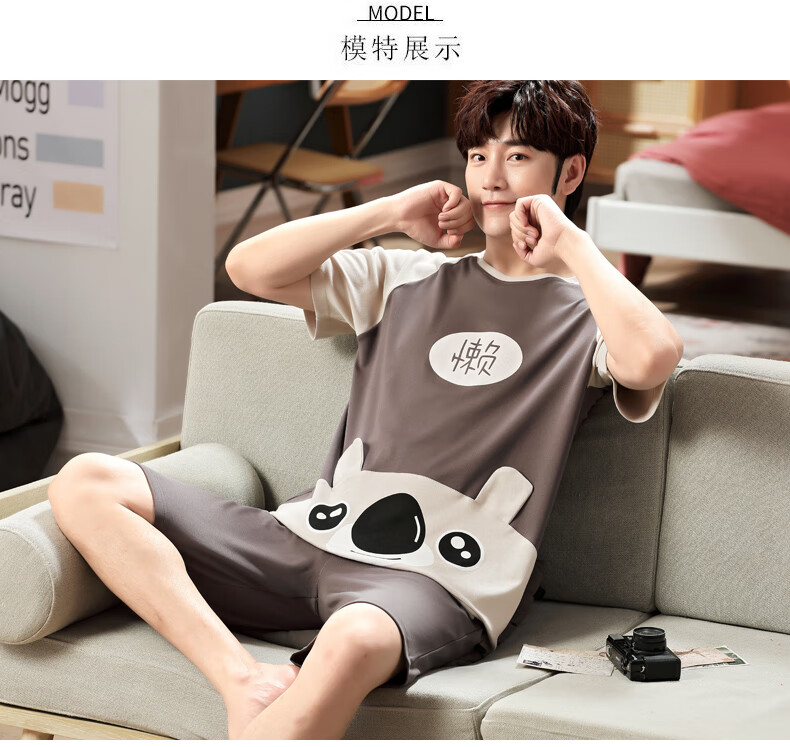 瓦菲莎睡衣男夏季棉质短袖薄款加大码卡通青少年男士家居服套装夏天 短袖1098懒熊 M [小]]建议身高155CM左右,体
