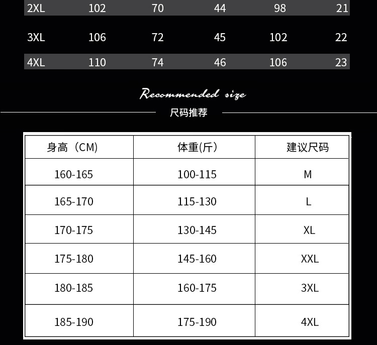 China (cm) 160-165/84-86 165-170 / 88-90 167-172 / 92-96 168-173 / 98-102 170-176 / 106-110
