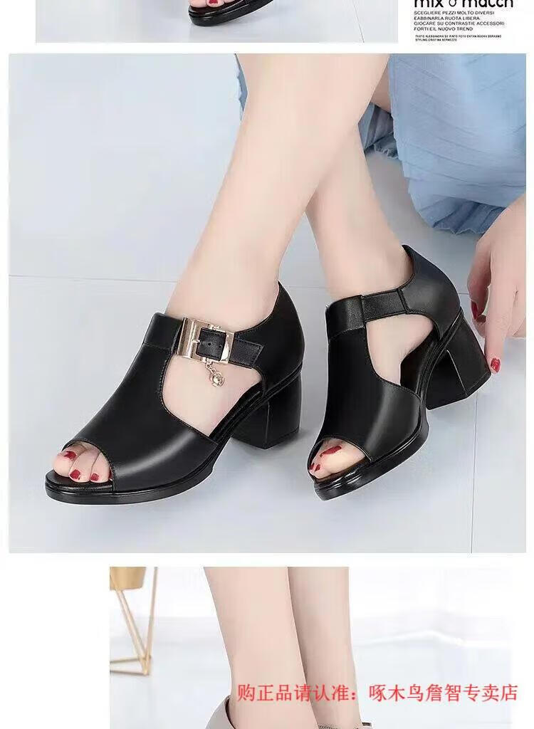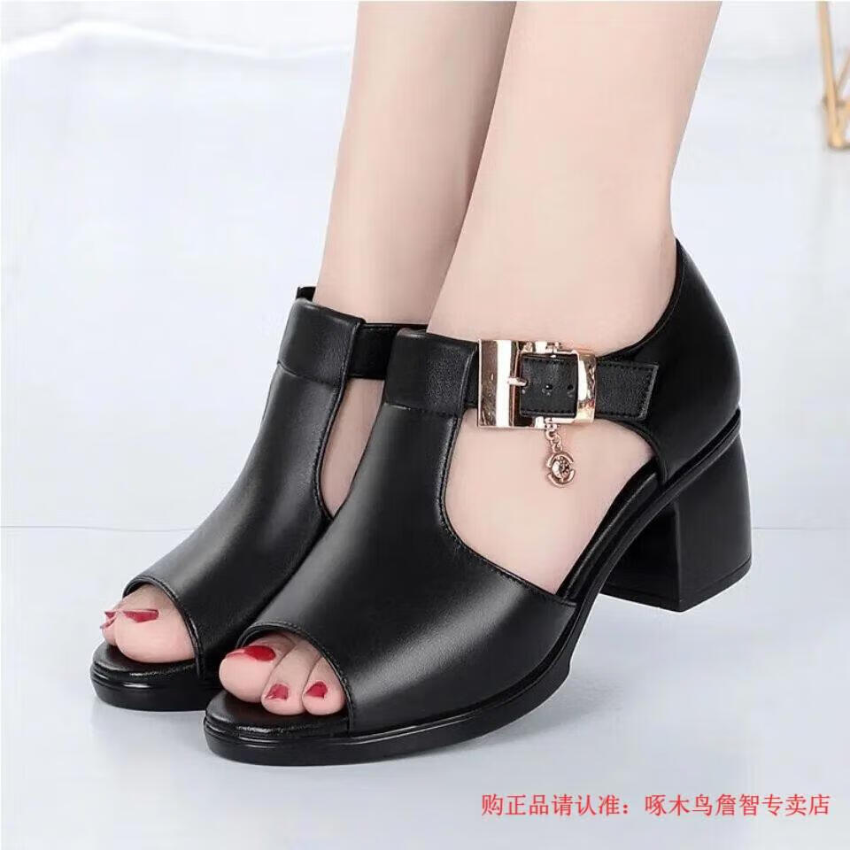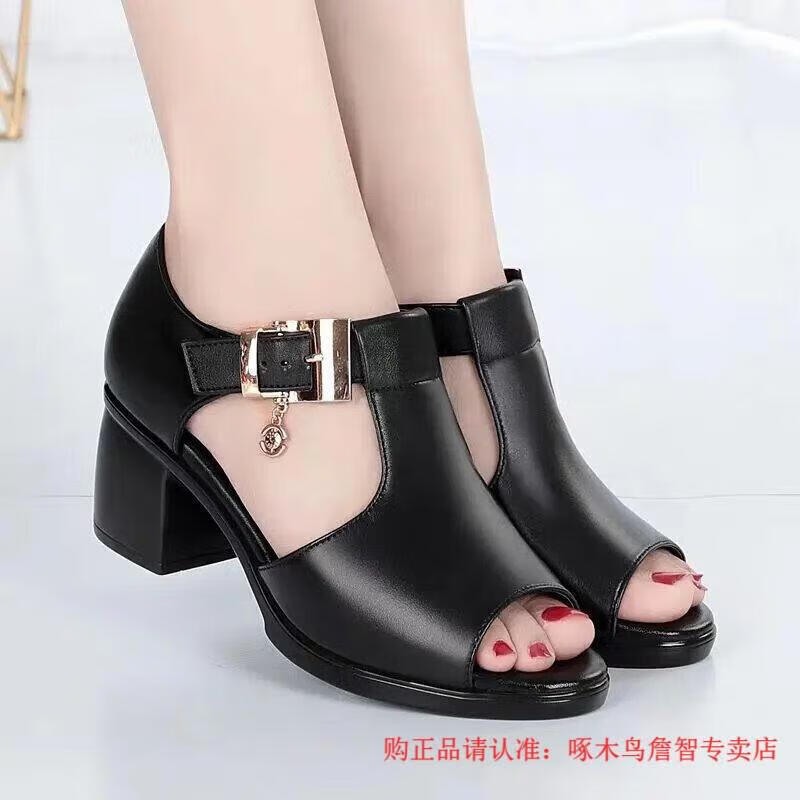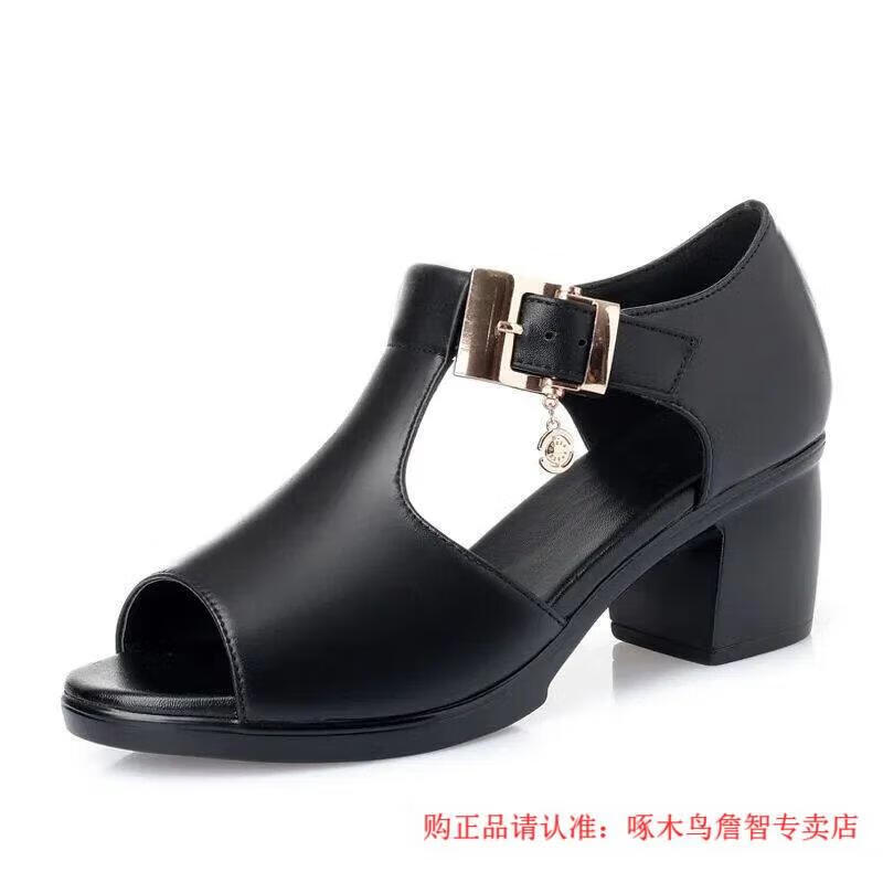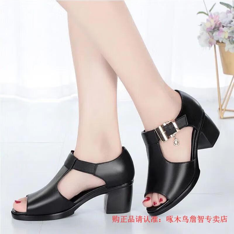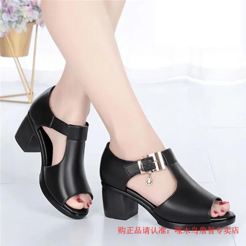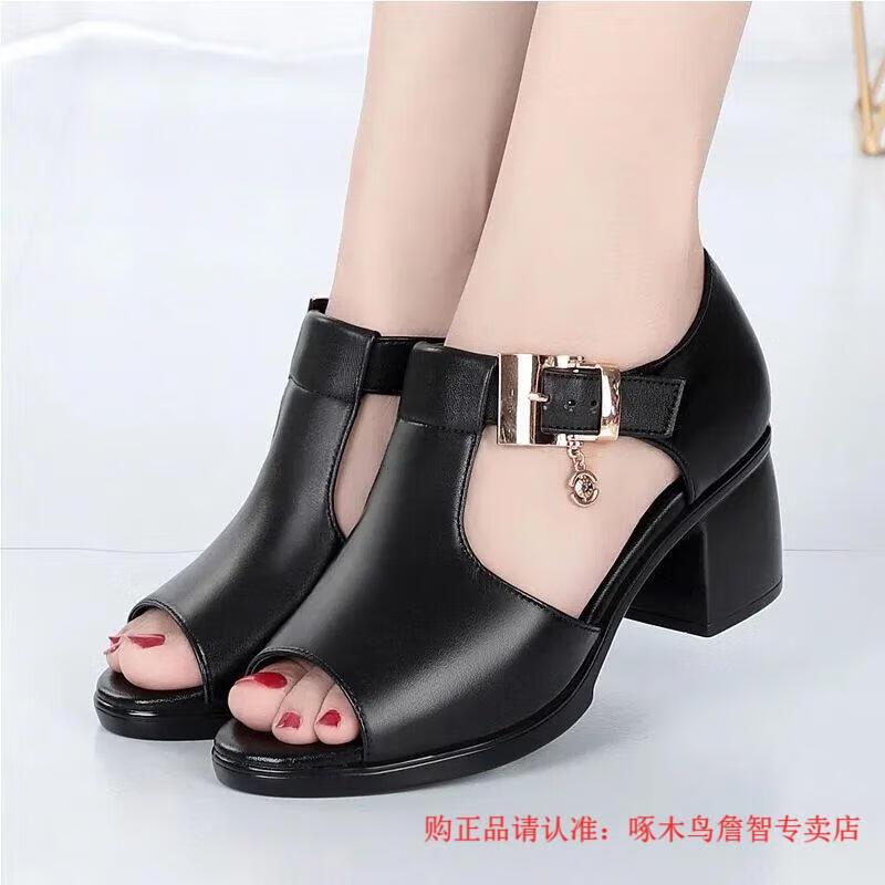 啄木鸟鱼嘴凉鞋女春夏季新款罗马女士粗跟鞋百搭中跟粗软皮中年妈妈鞋子 黑色 35
