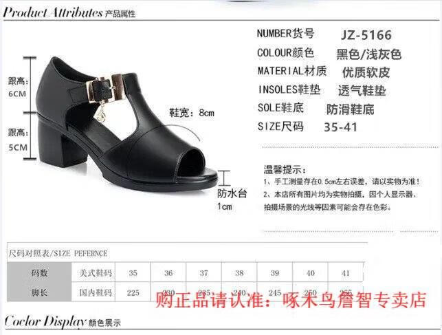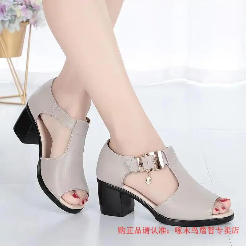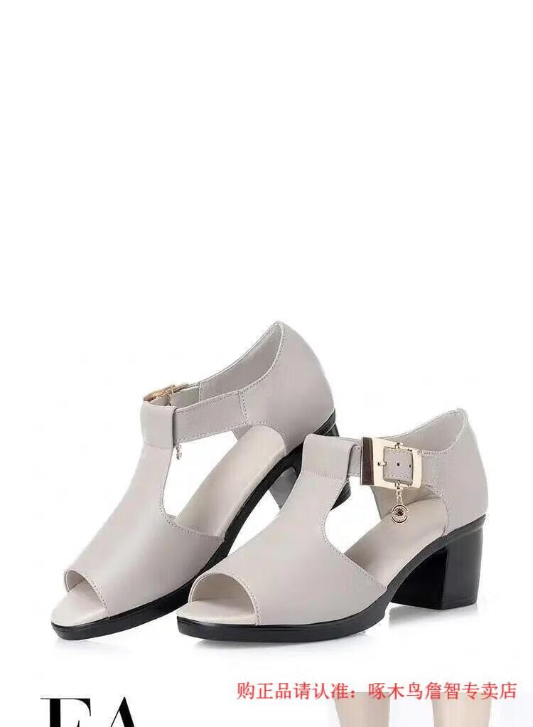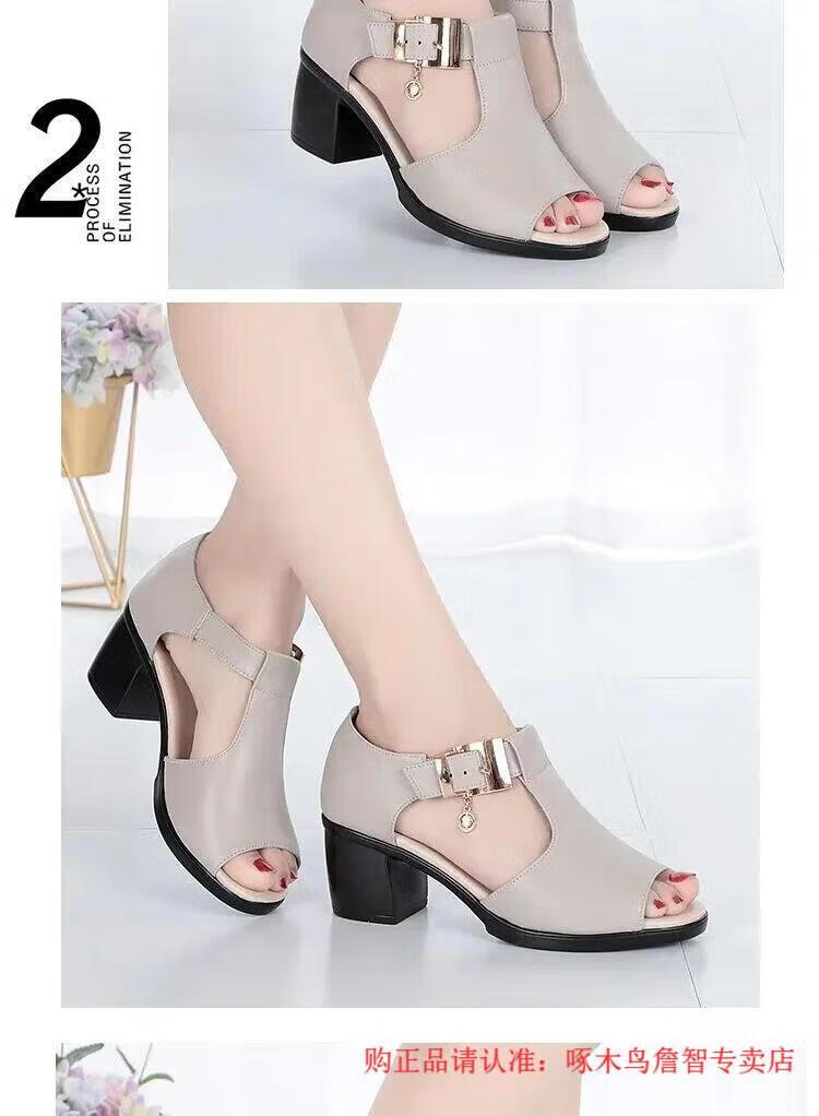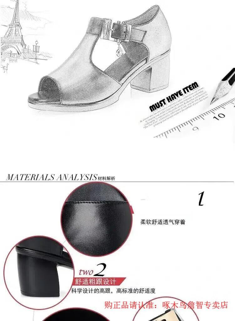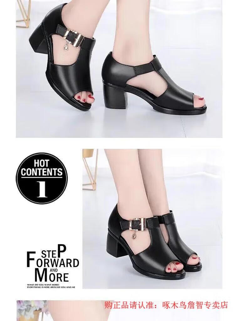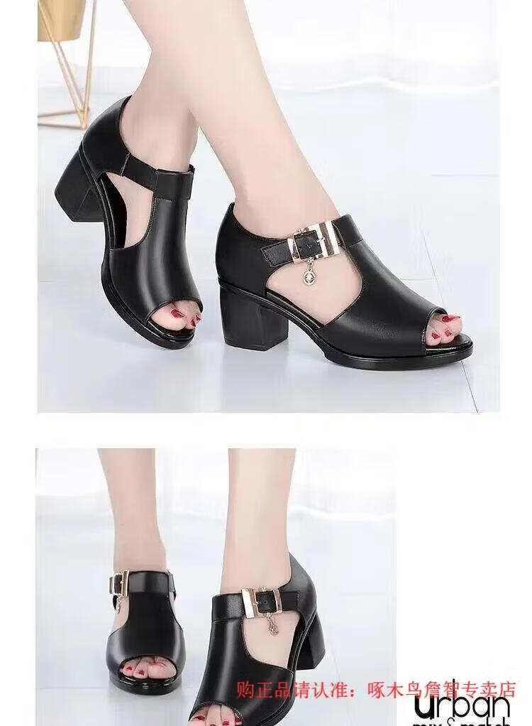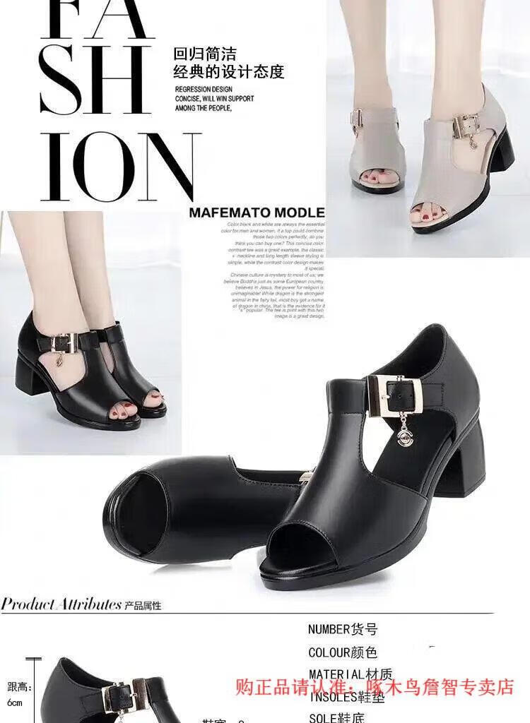 啄木鸟鱼嘴凉鞋女春夏季新款罗马女士粗跟鞋百搭中跟粗软皮中年妈妈鞋子 黑色 35