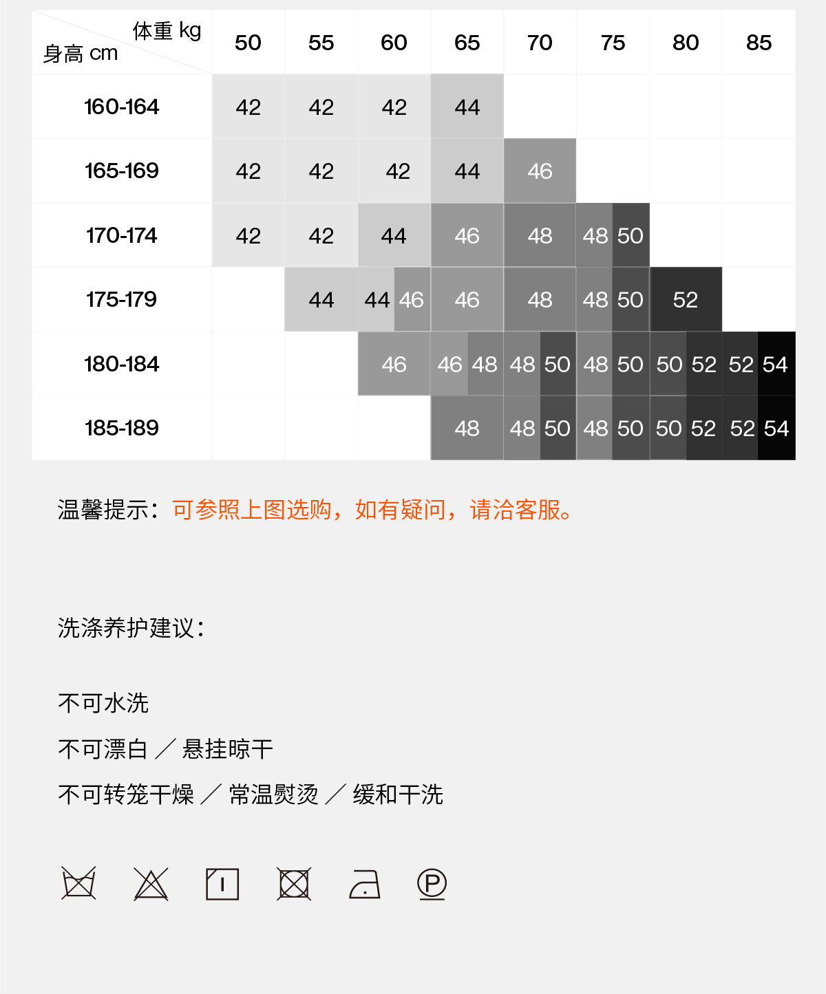 China (cm) 160-165/84-86 165-170 / 88-90 167-172 / 92-96 168-173 / 98-102 170-176 / 106-110