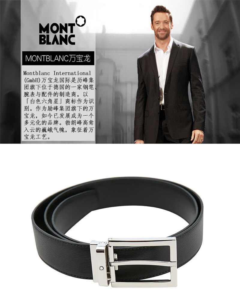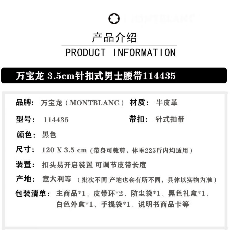 万宝龙(MONTBLANC)针式扣带黑色男士商务皮带/腰带 宽3.5cm 黑色114435