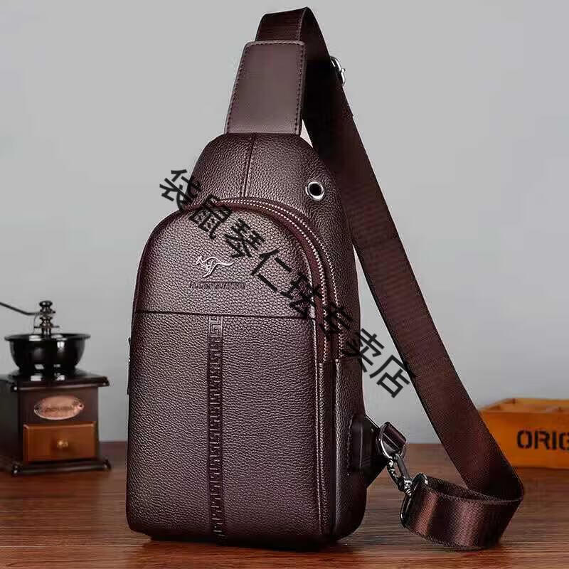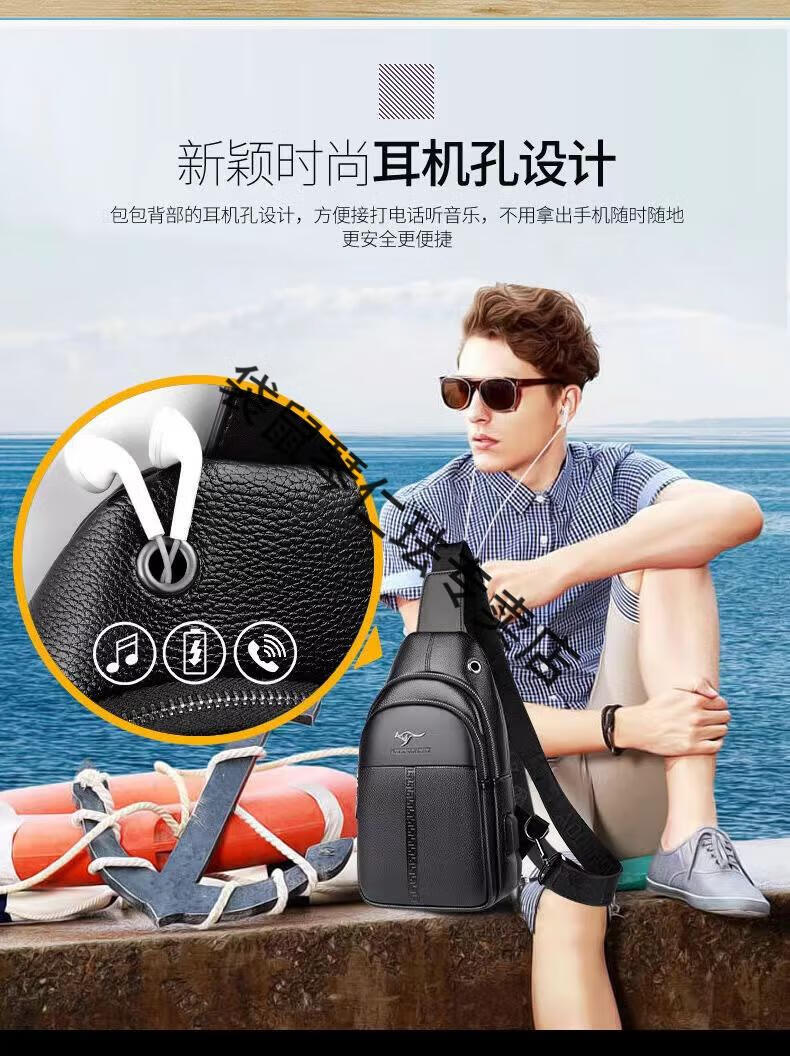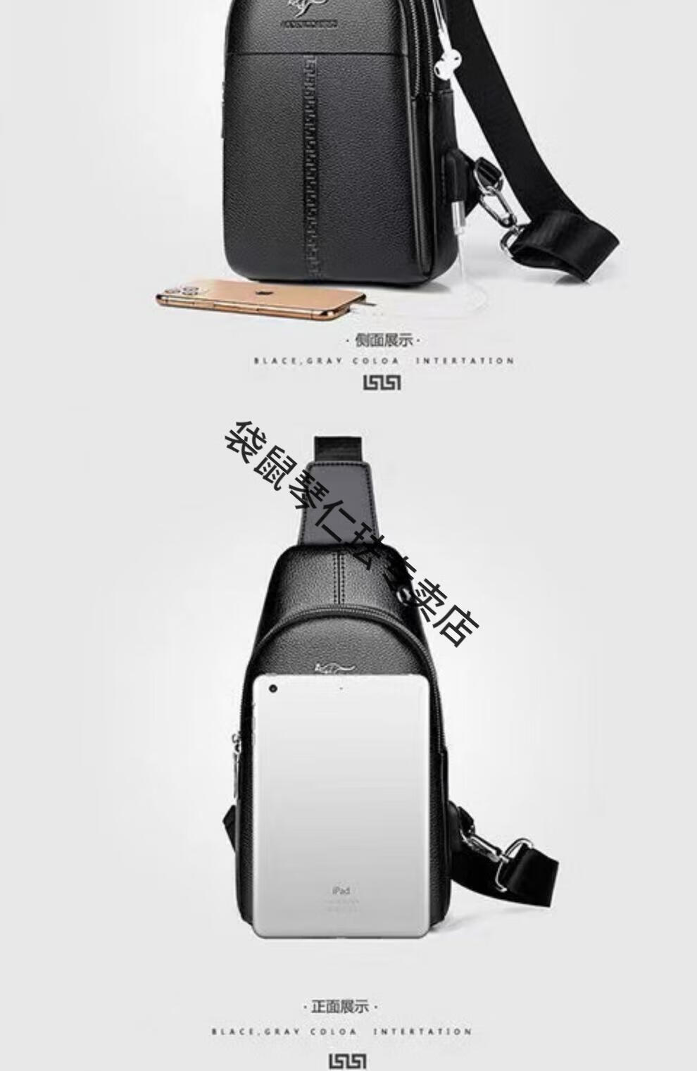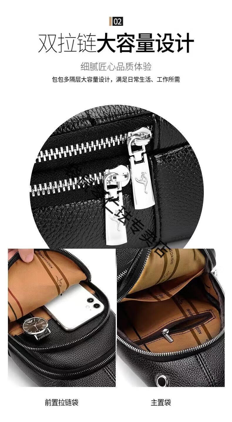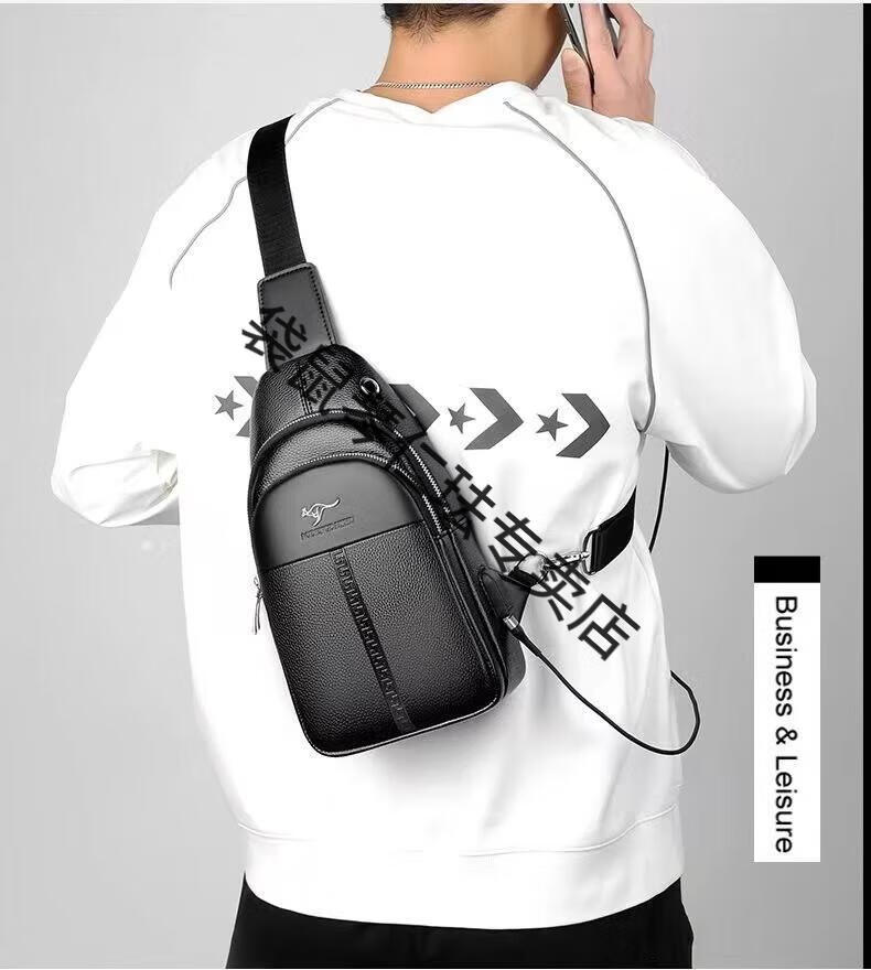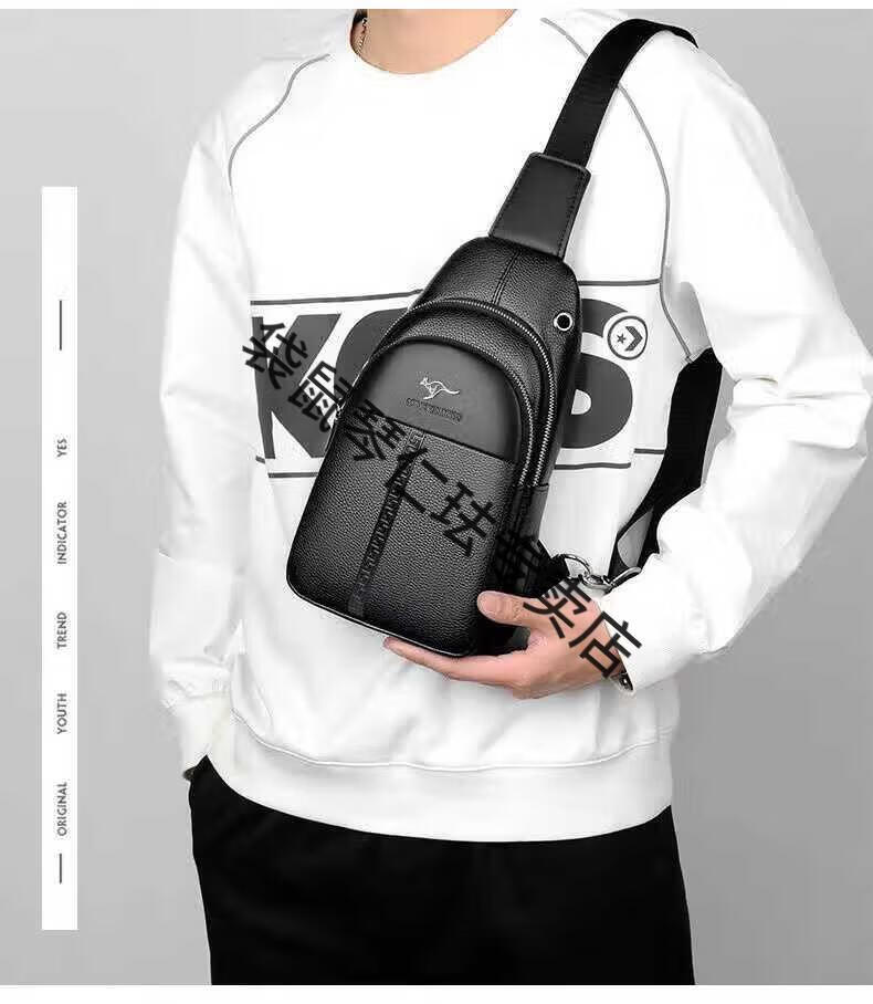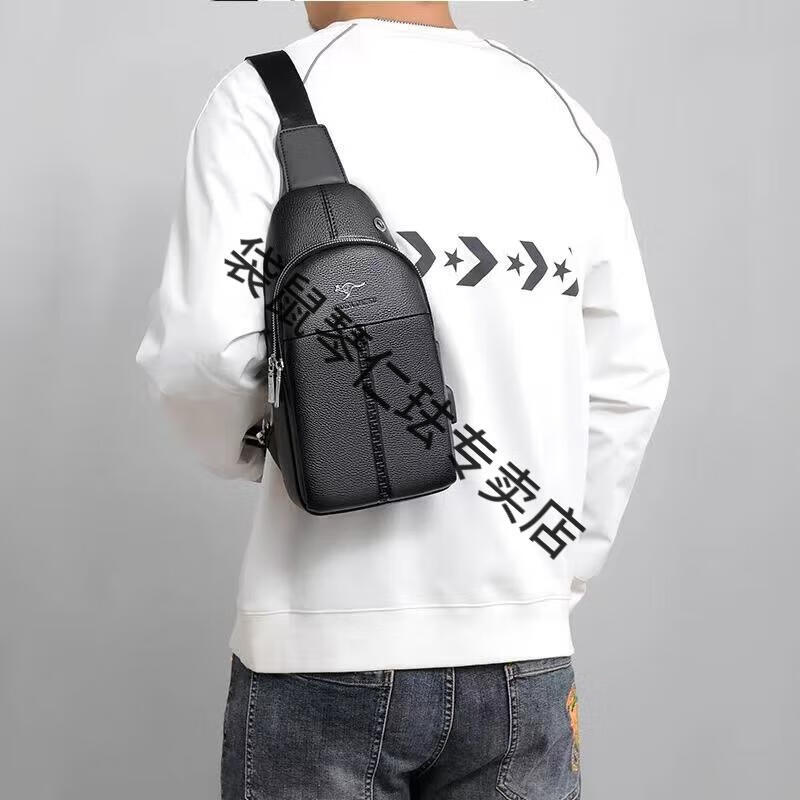 袋鼠真皮质感男士胸包运动斜挎包男包夏季小包男包背包休闲大容量腰包 黑色7029[升级新款]