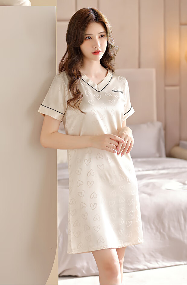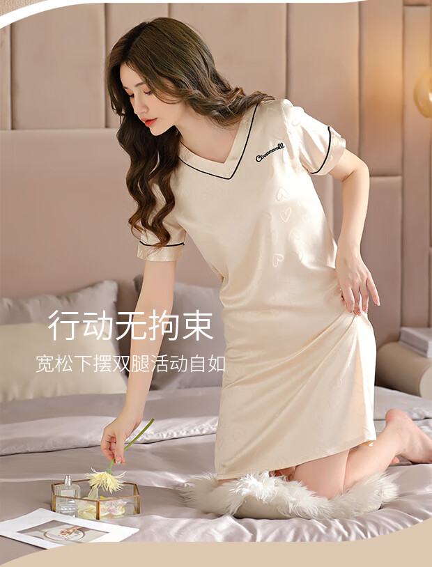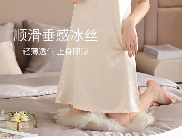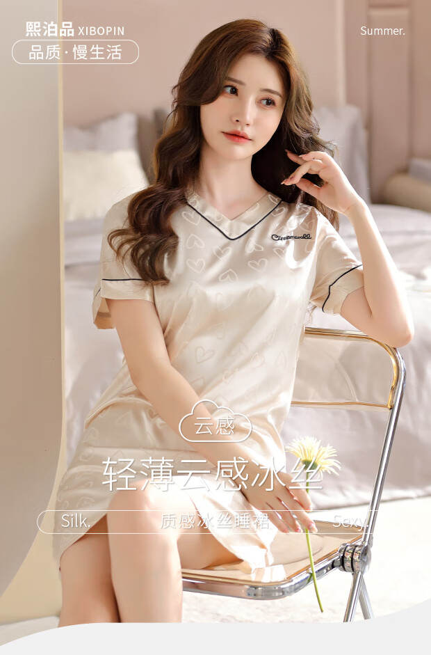 猫人(MiiOW)睡裙女夏季冰蚕丝2025新款女士仿真睡衣夏天性感带胸垫一体 1349-沙绿色【短.袖七分.裤】 M