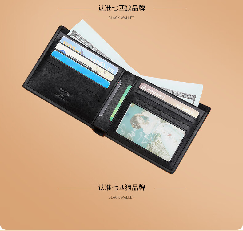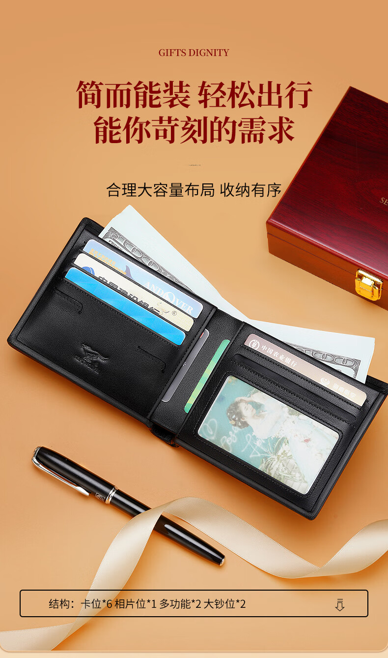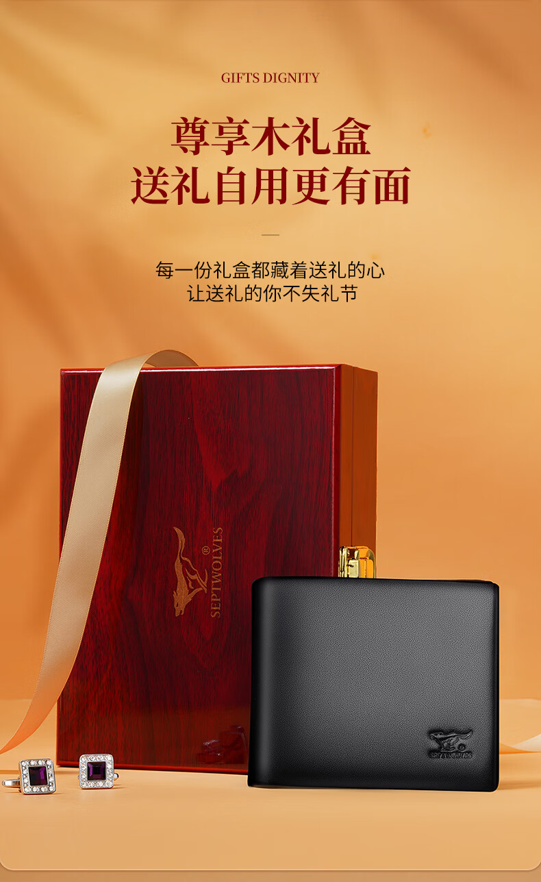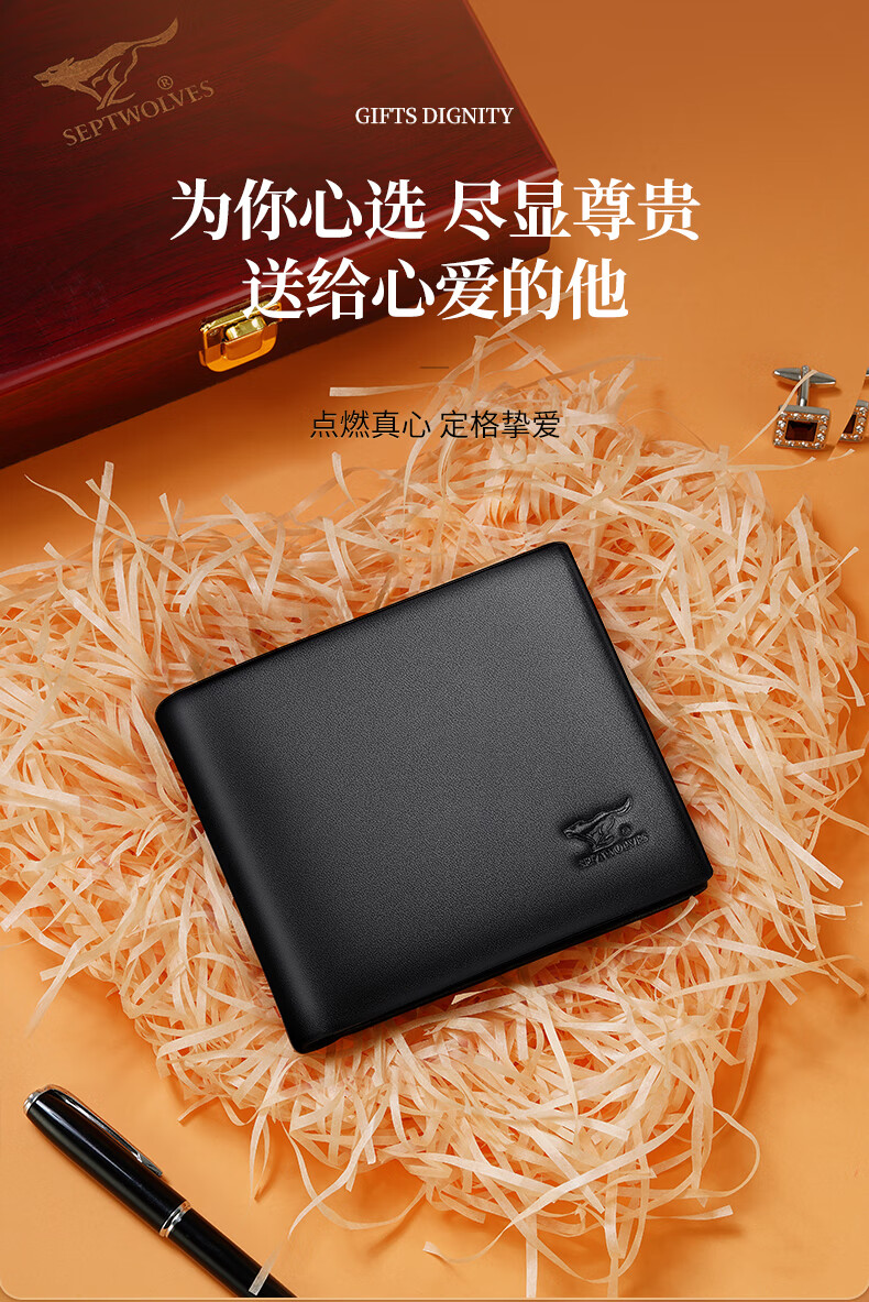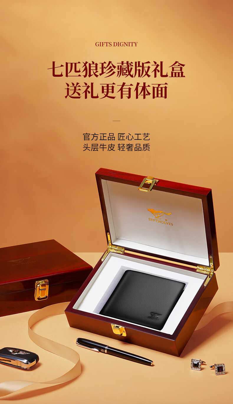 七匹狼(SEPTWOLVES)钱包男士短款钱夹头层牛皮皮夹高档木礼盒实用生日礼物送男友老公 【雅黑色】实木礼盒+手提袋