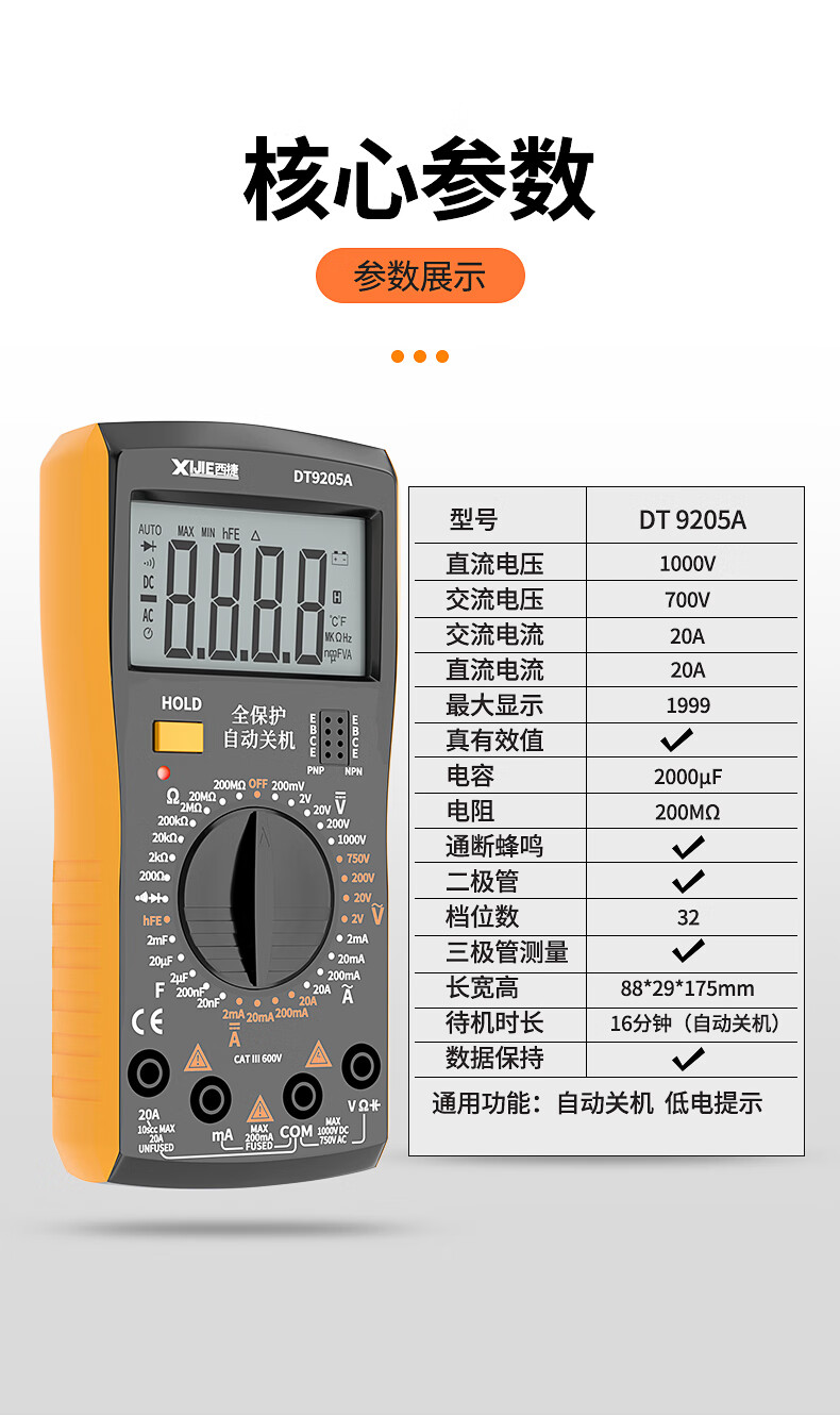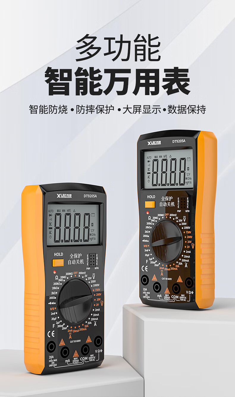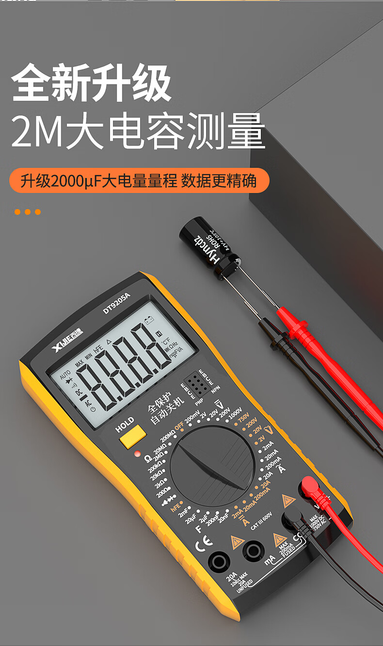 西捷升级新款DT9205智能防烧万用表电工家用维修高精度表2000电容 新款黄色9205A标配